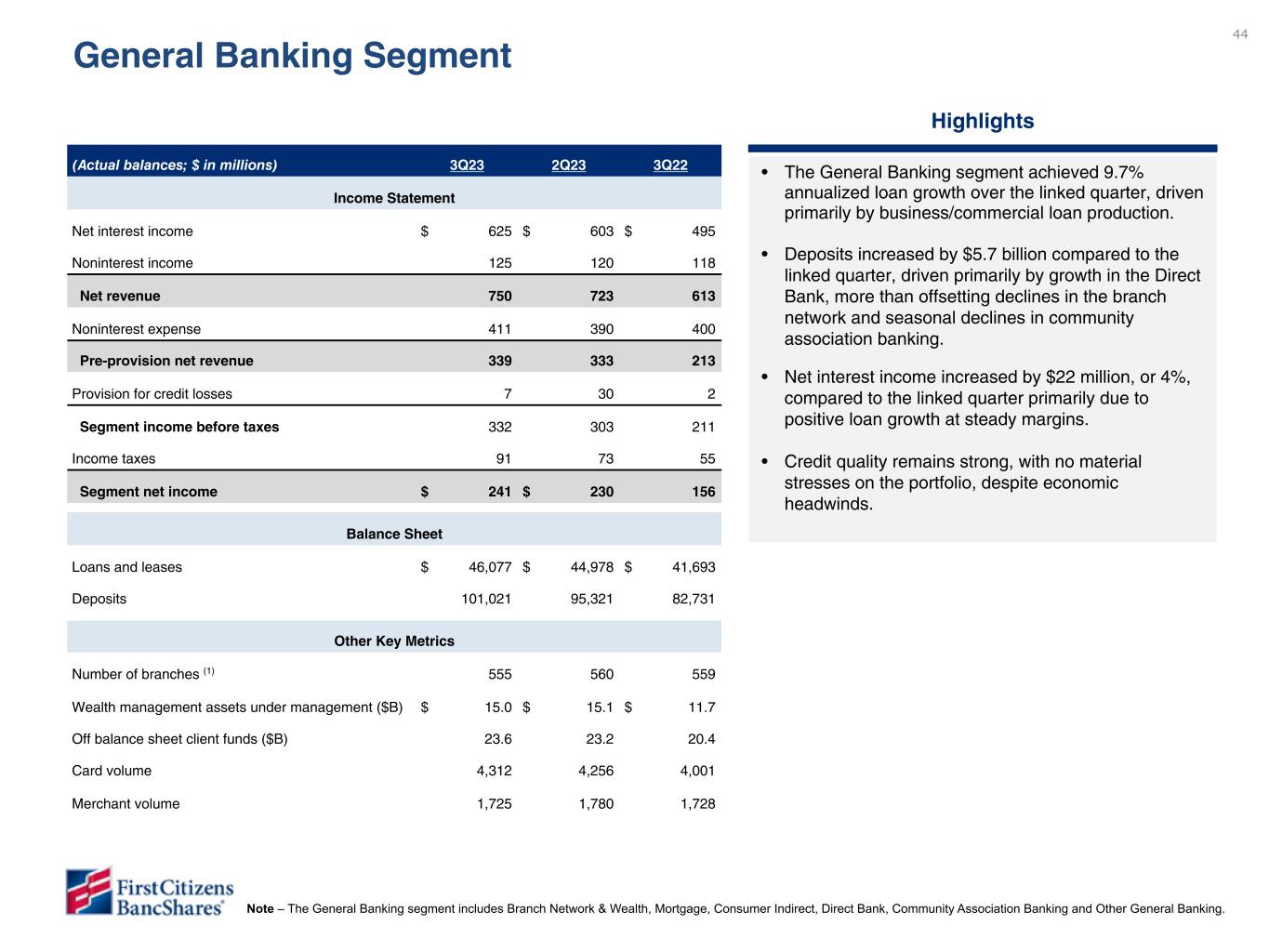 44 Highlights • The General Banking segment achieved 9.7% annualized loan growth over the linked quarter, driven primarily by business/commercial loan production. • Deposits increased by $5.7 billion compared to the linked quarter, driven primarily by growth in the Direct Bank, more than offsetting declines in the branch network and seasonal declines in community association banking. • Net interest income increased by $22 million, or 4%, compared to the linked quarter primarily due to positive loan growth at steady margins. • Credit quality remains strong, with no material stresses on the portfolio, despite economic headwinds. (Actual balances; $ in millions) 3Q23 2Q23 3Q22 Income Statement Net interest income $ 625 $ 603 $ 495 Noninterest income 125 120 118 Net revenue 750 723 613 Noninterest expense 411 390 400 Pre-provision net revenue 339 333 213 Provision for credit losses 7 30 2 Segment income before taxes 332 303 211 Income taxes 91 73 55 Segment net income $ 241 $ 230 156 Balance Sheet Loans and leases $ 46,077 $ 44,978 $ 41,693 Deposits 101,021 95,321 82,731 Other Key Metrics Number of branches (1) 555 560 559 Wealth management assets under management ($B) $ 15.0 $ 15.1 $ 11.7 Off balance sheet client funds ($B) 23.6 23.2 20.4 Card volume 4,312 4,256 4,001 Merchant volume 1,725 1,780 1,728 General Banking Segment Note – The General Banking segment includes Branch Network & Wealth, Mortgage, Consumer Indirect, Direct Bank, Community Association Banking and Other General Banking.