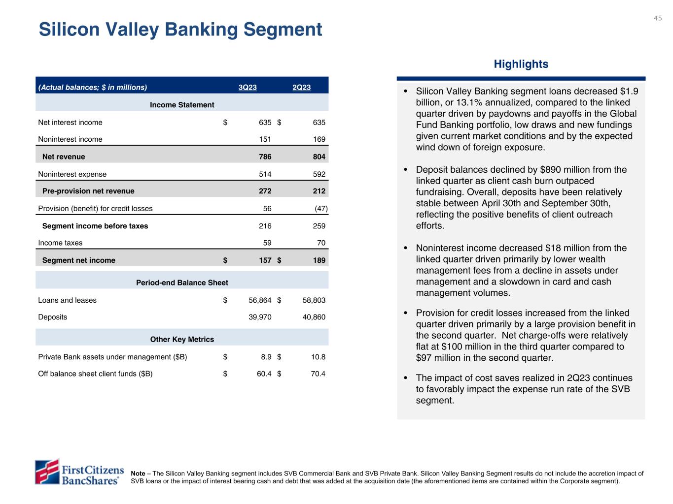 45 Highlights • Silicon Valley Banking segment loans decreased $1.9 billion, or 13.1% annualized, compared to the linked quarter driven by paydowns and payoffs in the Global Fund Banking portfolio, low draws and new fundings given current market conditions and by the expected wind down of foreign exposure. • Deposit balances declined by $890 million from the linked quarter as client cash burn outpaced fundraising. Overall, deposits have been relatively stable between April 30th and September 30th, reflecting the positive benefits of client outreach efforts. • Noninterest income decreased $18 million from the linked quarter driven primarily by lower wealth management fees from a decline in assets under management and a slowdown in card and cash management volumes. • Provision for credit losses increased from the linked quarter driven primarily by a large provision benefit in the second quarter. Net charge-offs were relatively flat at $100 million in the third quarter compared to $97 million in the second quarter. • The impact of cost saves realized in 2Q23 continues to favorably impact the expense run rate of the SVB segment. (Actual balances; $ in millions) 3Q23 2Q23 Income Statement Net interest income $ 635 $ 635 Noninterest income 151 169 Net revenue 786 804 Noninterest expense 514 592 Pre-provision net revenue 272 212 Provision (benefit) for credit losses 56 (47) Segment income before taxes 216 259 Income taxes 59 70 Segment net income $ 157 $ 189 Period-end Balance Sheet Loans and leases $ 56,864 $ 58,803 Deposits 39,970 40,860 Other Key Metrics Private Bank assets under management ($B) $ 8.9 $ 10.8 Off balance sheet client funds ($B) $ 60.4 $ 70.4 Silicon Valley Banking Segment Note – Silicon Valley Banking Segment results reflect a full quarter for the 2Q23 reporting period, and only 5 days of financial results for the 1Q23 reporting period, following the 3/27/23 acquisition date. Additionally, there is no provision expense in 1Q23 as this was recorded as part of purchase accounting. Reinstate note during 1Q24 when 1Q23 is shown again PLEASE DO NOT REVIEW Data Unavailable Note – The Silicon Valley Banking segment includes SVB Commercial Bank and SVB Private Bank. Silicon Valley Banking Segment results do not include the accretion impact of SVB loans or the impact of interest bearing cash and debt that was added at the acquisition date (the aforementioned items are contained within the Corporate segment).