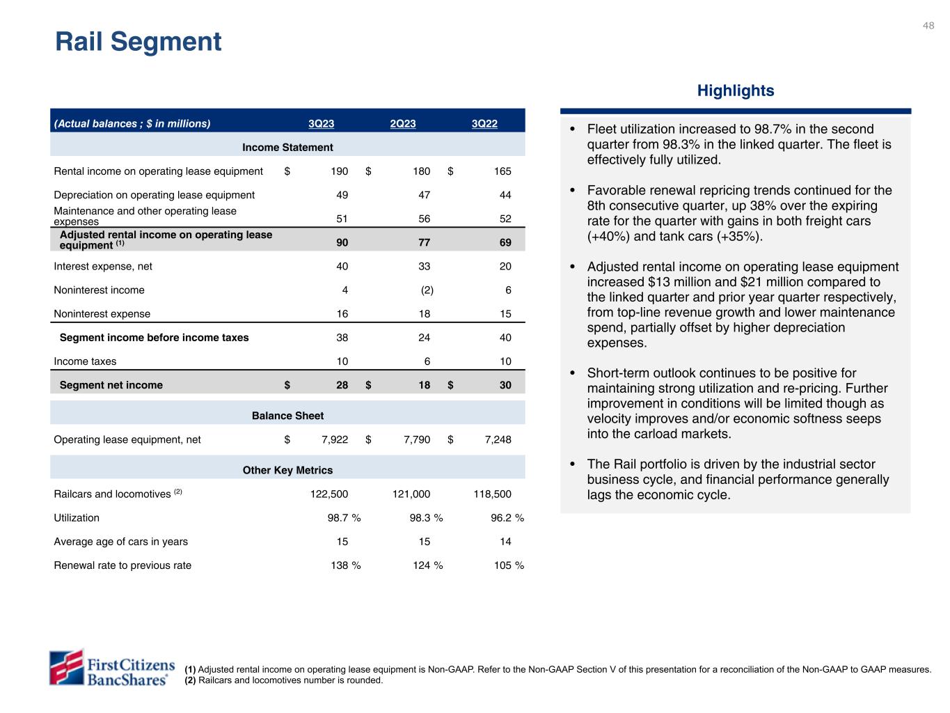 48 Highlights • Fleet utilization increased to 98.7% in the second quarter from 98.3% in the linked quarter. The fleet is effectively fully utilized. • Favorable renewal repricing trends continued for the 8th consecutive quarter, up 38% over the expiring rate for the quarter with gains in both freight cars (+40%) and tank cars (+35%). • Adjusted rental income on operating lease equipment increased $13 million and $21 million compared to the linked quarter and prior year quarter respectively, from top-line revenue growth and lower maintenance spend, partially offset by higher depreciation expenses. • Short-term outlook continues to be positive for maintaining strong utilization and re-pricing. Further improvement in conditions will be limited though as velocity improves and/or economic softness seeps into the carload markets. • The Rail portfolio is driven by the industrial sector business cycle, and financial performance generally lags the economic cycle. (Actual balances ; $ in millions) 3Q23 2Q23 3Q22 Income Statement Rental income on operating lease equipment $ 190 $ 180 $ 165 Depreciation on operating lease equipment 49 47 44 Maintenance and other operating lease expenses 51 56 52 Adjusted rental income on operating lease equipment (1) 90 77 69 Interest expense, net 40 33 20 Noninterest income 4 (2) 6 Noninterest expense 16 18 15 Segment income before income taxes 38 24 40 Income taxes 10 6 10 Segment net income $ 28 $ 18 $ 30 Balance Sheet Operating lease equipment, net $ 7,922 $ 7,790 $ 7,248 Other Key Metrics Railcars and locomotives (2) 122,500 121,000 118,500 Utilization 98.7 % 98.3 % 96.2 % Average age of cars in years 15 15 14 Renewal rate to previous rate 138 % 124 % 105 % Rail Segment (1) Adjusted rental income on operating lease equipment is Non-GAAP. Refer to the Non-GAAP Section V of this presentation for a reconciliation of the Non-GAAP to GAAP measures. (2) Railcars and locomotives number is rounded. PLEASE DO NOT REVIEW Data Unavailable for IP Draft 1