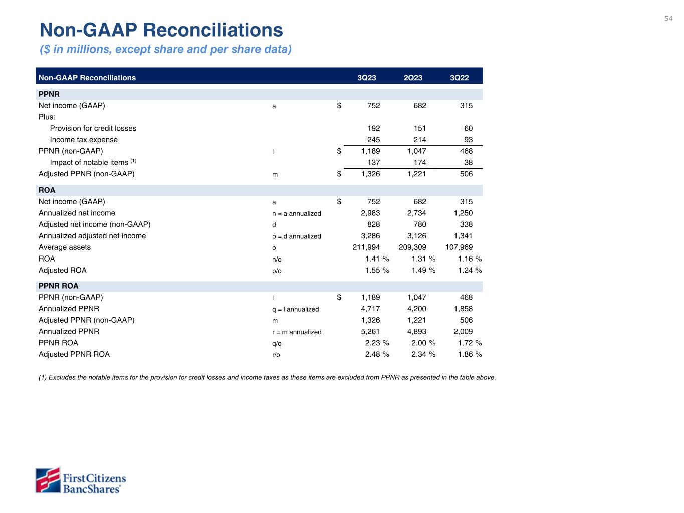 52 1Q23 4Q22 1Q22 Rental income on operating lease equipment (2) $ (146) $ (147) $ (139) Realized gain on sale of investment securities available for sale, net 12 — — Fair value adjustment on marketable equity securities, net 1 10 2 Gain on sale of leasing equipment, net (10) (4) (2) Gain on acquisition (12) (55) — Gain on extinguishment of debt — — (1) Other noninterest income(3) 8 — (5) Impact on adjusted noninterest income $ (147) $ (196) $ (145) Depreciation on operating lease equipment (2) $ (95) $ (91) $ (87) Maintenance and other operating lease expenses (2) (51) (56) (52) Salaries and benefits — — — Acquisition-related expenses (121) (205) (33) Intangible asset amortization (17) (18) (5) Other noninterest expense (4) — — (6) Impact on adjusted noninterest expense $ (284) $ (370) $ (183) CECL Day 2 provision and reserve for unfunded commitments — (716) — Provision for credit losses- investment securities available for sale 3 (4) — Provision for credit losses - total adjustments $ 3 $ 1 $ — Impact on adjusted pre-tax income $ 134 $ 173 $ 38 Income tax impact (5) (6) 58 75 15 Impact on adjusted net income $ 76 $ 98 $ 23 Impact on adjusted diluted EPS $ 5.25 $ 6.73 1.52 Notable Items (1) ($ in millions, except per share data) 3Q23 2Q23 3Q22 Rental income on operating lease equipment (2) $ (146) $ (147) $ (139) Realized loss on sale of investment securities available for sale, net 12 — — Fair value adjustment on marketable equity securities, net 1 10 2 Gain on sale of leasing equipment, net (10) (4) (2) Gain on acquisition, net of tax (12) (55) — Gain on extinguishment of debt — — (1) Other noninterest income (3) 8 — (5) Impact of notable items on adjusted noninterest income $ (147) $ (196) $ (145) Depreciation on operating lease equipment (2) $ (95) $ (91) $ (87) Maintenance and other operating lease expenses (2) (51) (56) (52) Acquisition-related expenses (121) (205) (33) Intangible asset amortization (17) (18) (5) Other noninterest expense (4) — — (6) Impact of notable items on adjusted noninterest expense $ (284) $ (370) $ (183) Benefit for credit losses on investment securities AFS $ 3 $ 1 $ — Impact of notable items on adjusted provision for credit losses $ 3 $ 1 $ — Impact of notable items on adjusted pre-tax income $ 134 $ 173 $ 38 Income tax impact (5) 58 75 15 Impact of notable items on adjusted net income $ 76 $ 98 $ 23 Impact of notable items on adjusted diluted EPS $ 5.25 $ 6.73 $ 1.52 (1) Notable items include income and expense for infrequent transactions and certain recurring items (typically noncash) that Management believes should be excluded from adjusted measures (Non-GAAP) to enhance understanding of operations and comparability to historical periods. Management utilizes both GAAP and adjusted measures (Non-GAAP) to analyze the Company’s performance. Refer to subsequent pages of this presentation for a reconciliation of Non-GAAP measures to the most directly comparable GAAP measures. (2) Depreciation and maintenance and other operating lease expenses are reclassified from noninterest expense to a reduction of rental income on operating lease equipment. There is no net impact to earnings for this notable item as adjusted noninterest income and expense are reduced by the same amount. Adjusted rental income on operating lease equipment (non-GAAP) is net of depreciation and maintenance expense for operating lease equipment. Management believes this measure enhances comparability to banking peers, primarily due to the extent of our rail and other equipment rental activities. Refer to subsequent pages of this presentation for a reconciliation of Non-GAAP measures to the most directly comparable GAAP measure. (3) Notable items included in other noninterest income consist of a measurement period adjustment related to FX translation in 3Q23 and a railcar lease settlement in 3Q22. (4) Notable items included in other noninterest expense consist of an impairment on corporate real estate in 3Q22. (5) For the periods presented the income tax impact may include tax discrete items and changes in the estimated annualized effective tax rate.