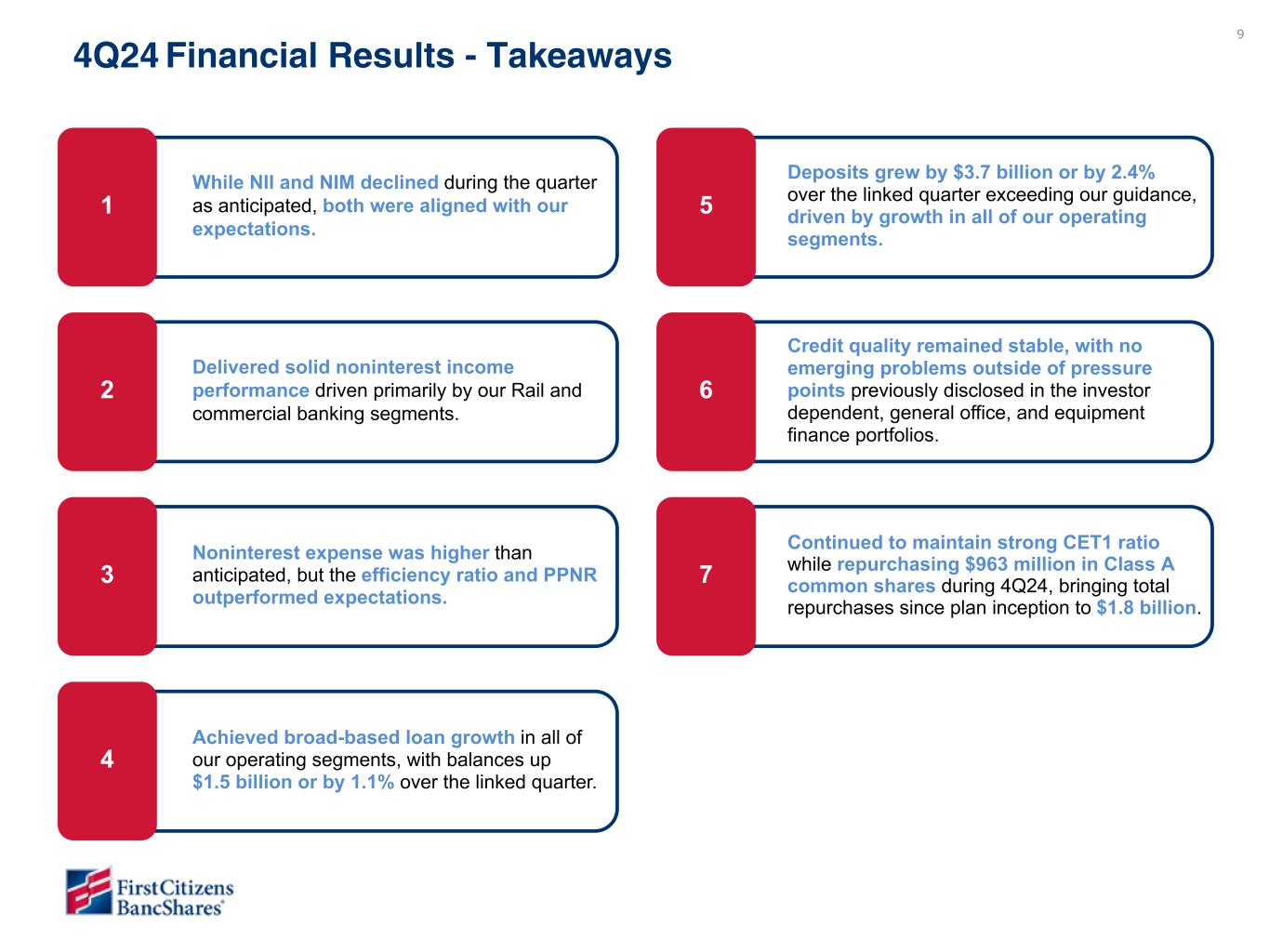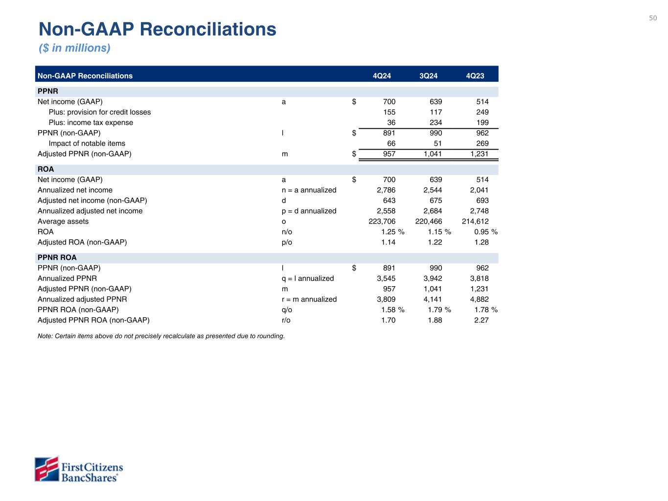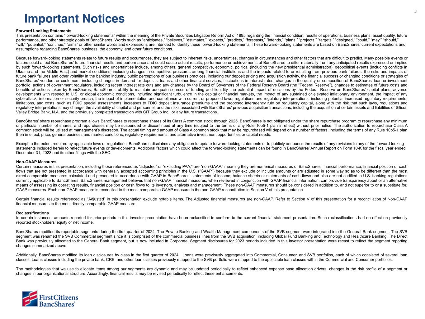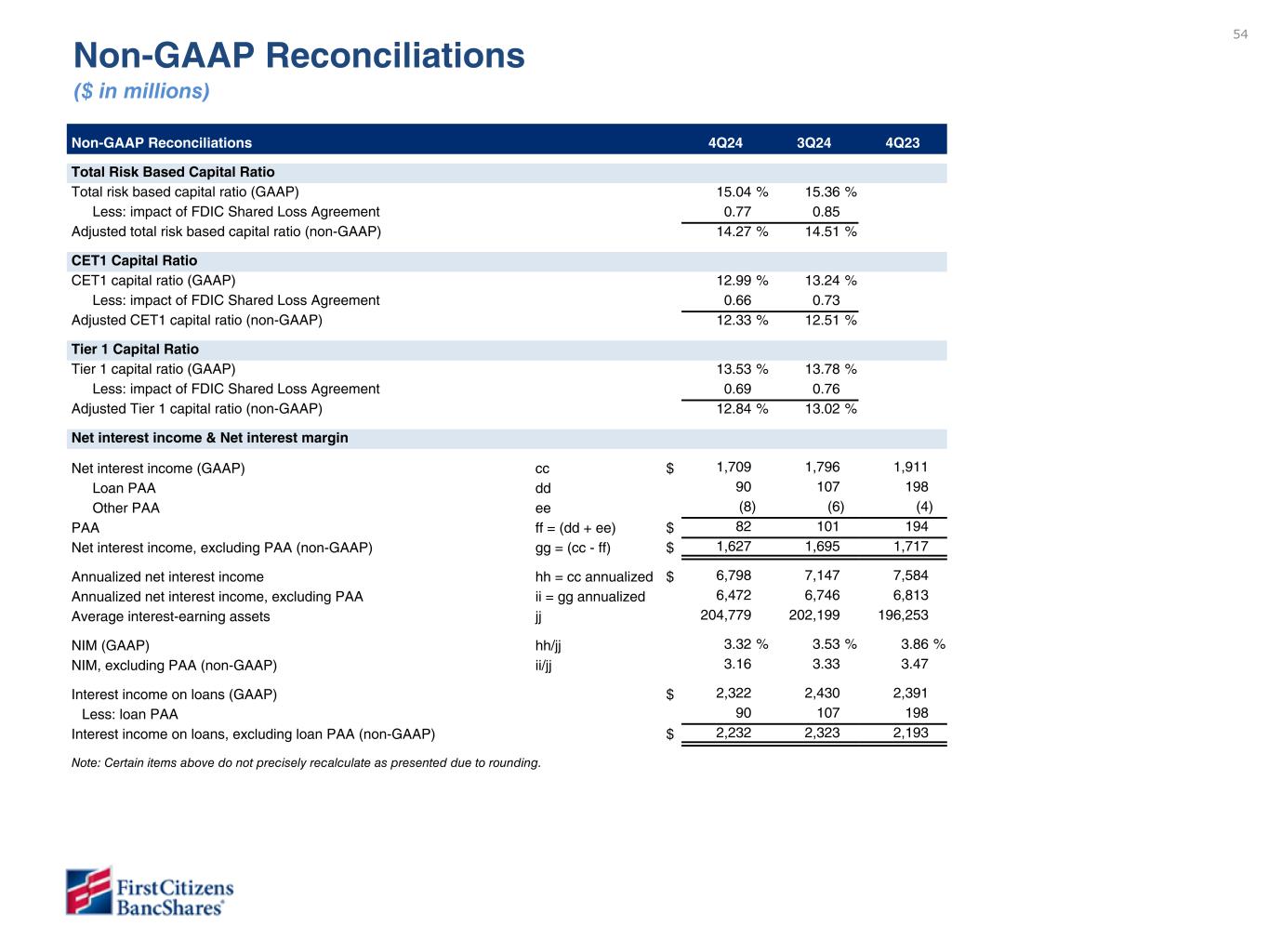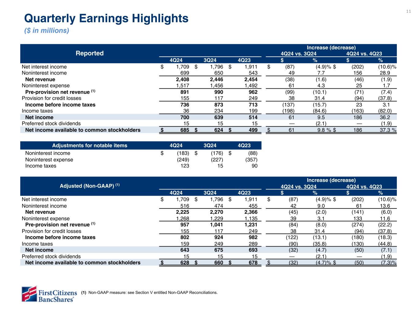 以下の「調整後」または「PAA(またはパーチェス会計に伴う付加価値)を除く」は非GAAPベースの財務指標です(各非GAAPベースの財務指標と最も直接的に比較可能なGAAPベースの財務指標との調整については、ir.firstcitizens.comまたはwww.sec.gov で入手可能な財務補足資料をご参照ください)。