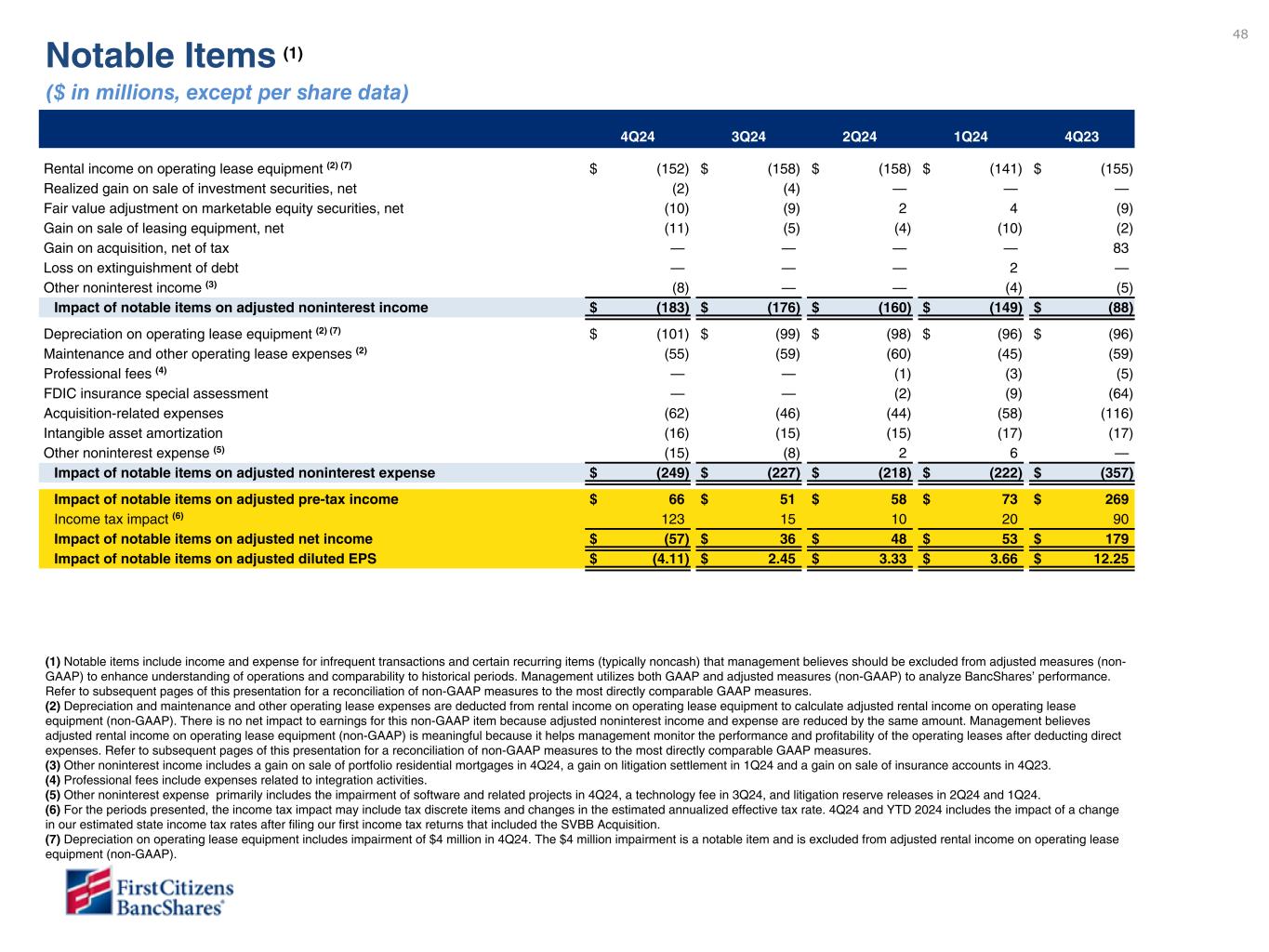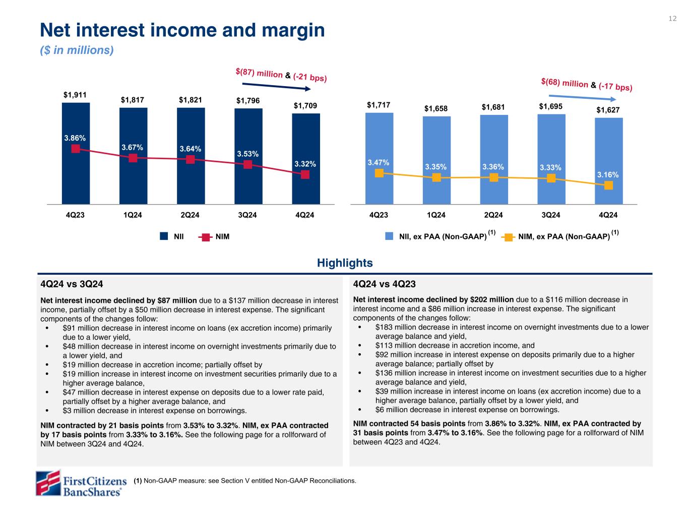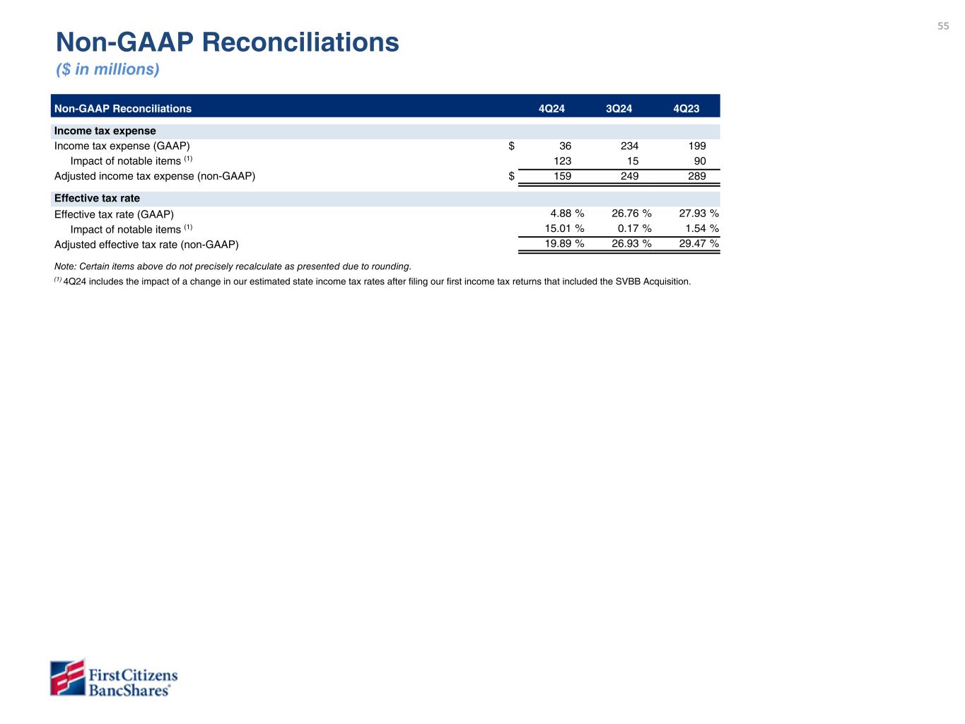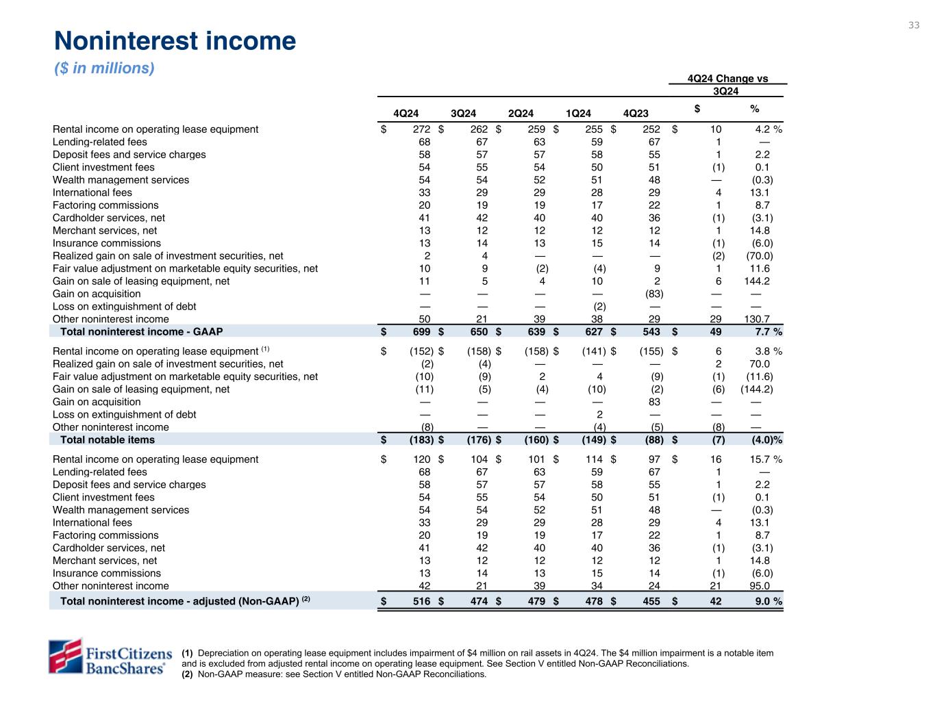 以下の「調整後」または「PAA(またはパーチェス会計に伴う付加価値)を除く」は非GAAPベースの財務指標です(各非GAAPベースの財務指標と最も直接的に比較可能なGAAPベースの財務指標との調整については、ir.firstcitizens.comまたはwww.sec.gov で入手可能な財務補足資料をご参照ください)。