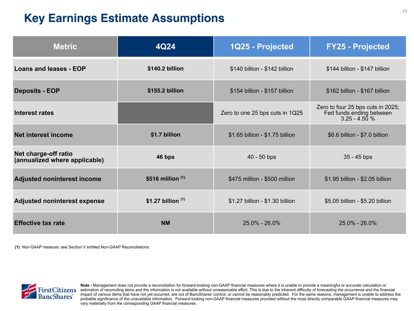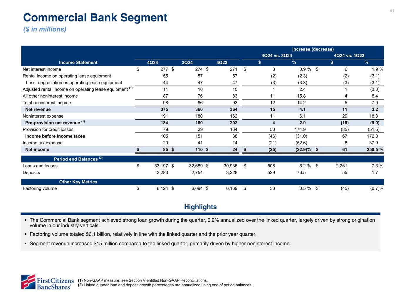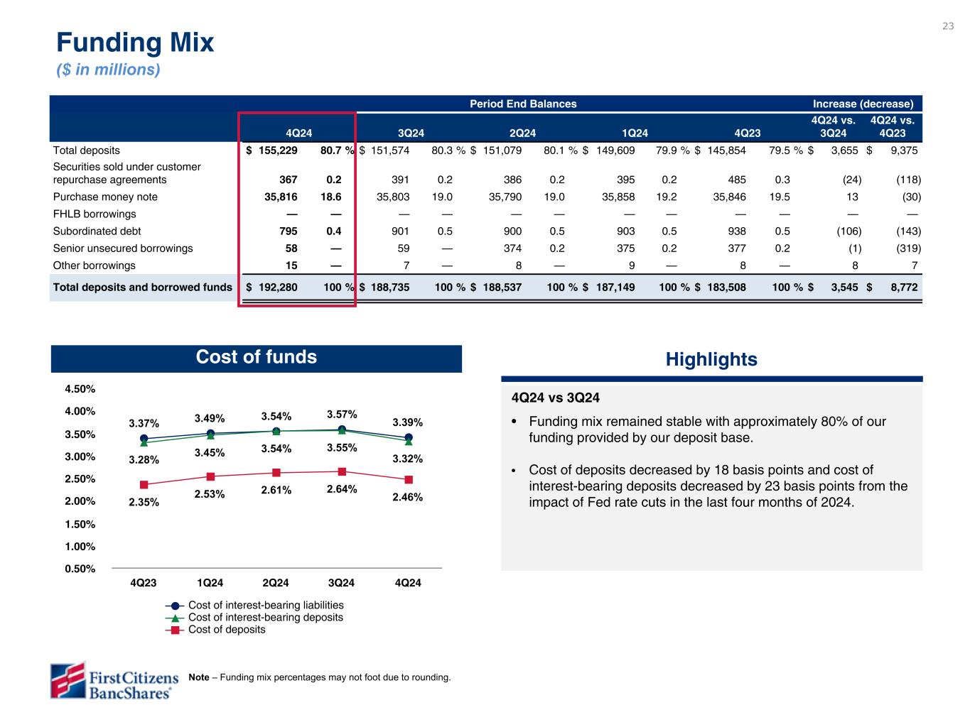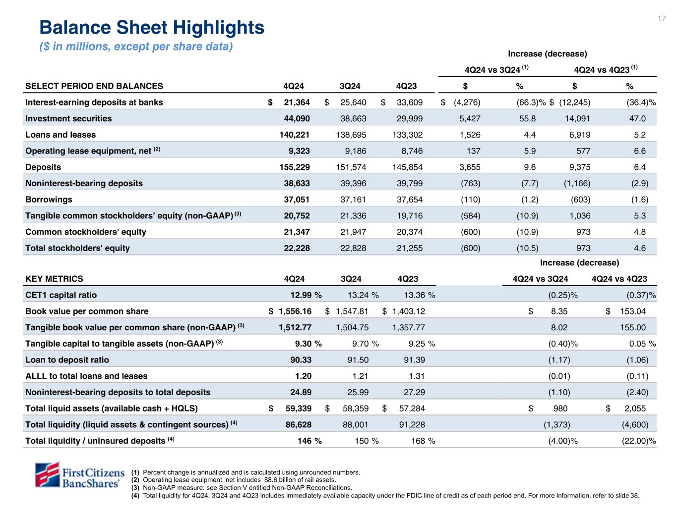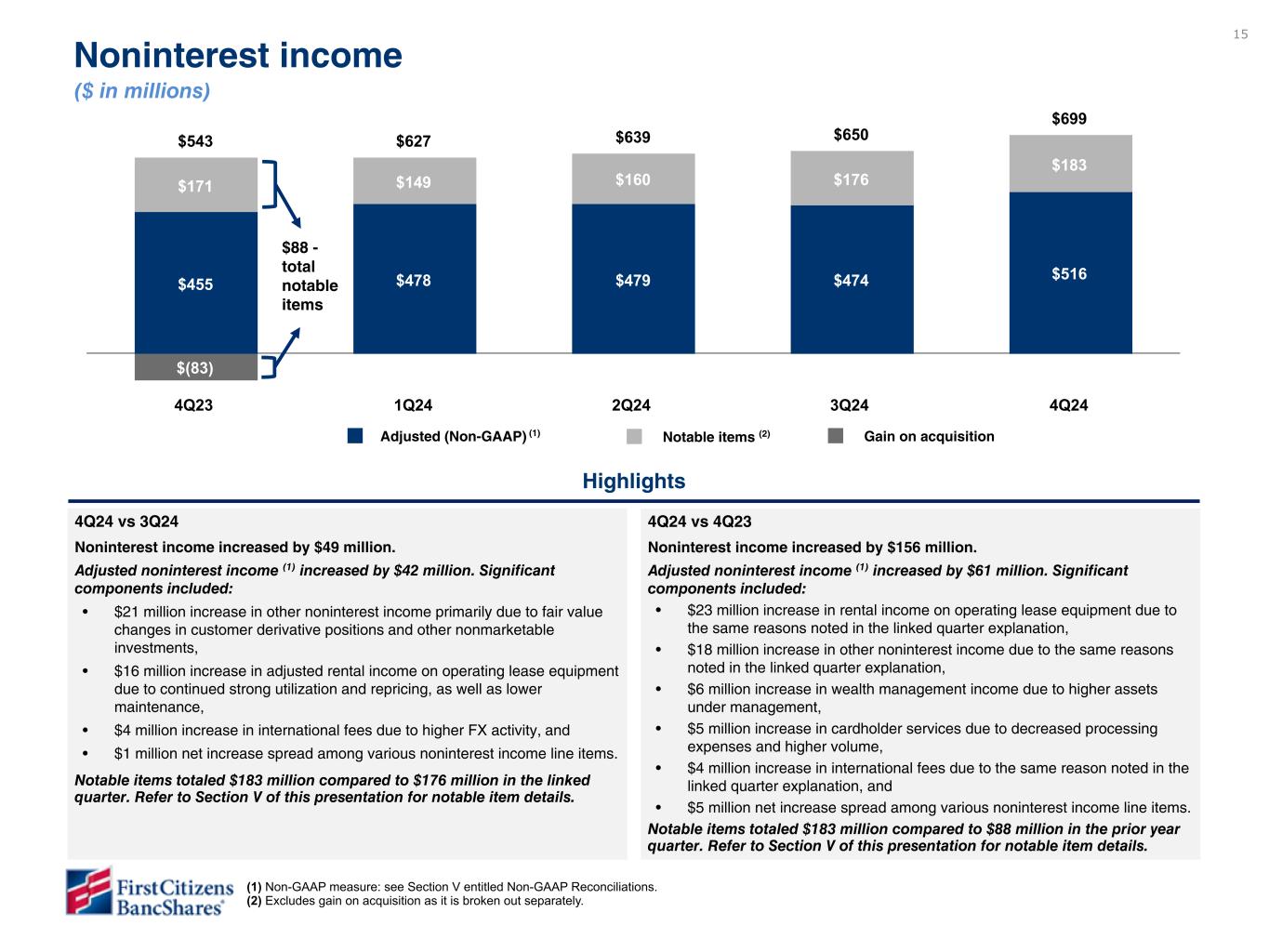 以下の「調整後」または「PAA(またはパーチェス会計に伴う付加価値)を除く」は非GAAPベースの財務指標です(各非GAAPベースの財務指標と最も直接的に比較可能なGAAPベースの財務指標との調整については、ir.firstcitizens.comまたはwww.sec.gov で入手可能な財務補足資料をご参照ください)。