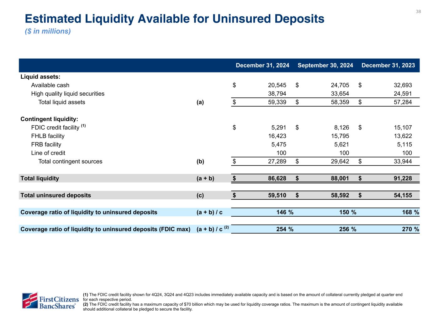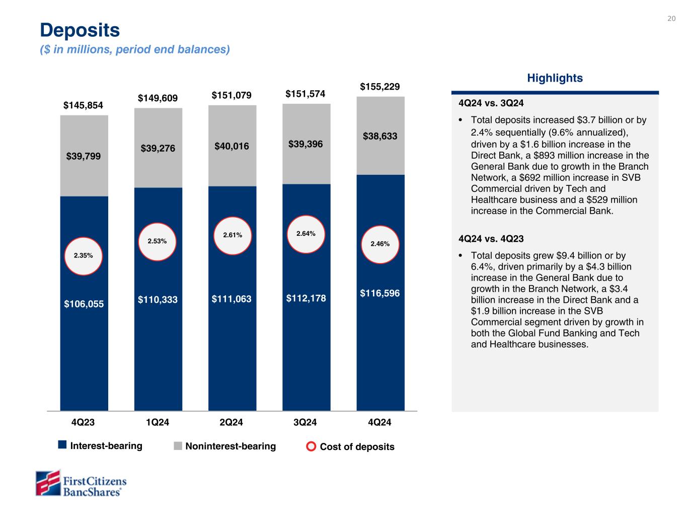 -2024年12月31日現在の預金残高は1,552億3,000万ドルで、2024年9月30日以降36億6,000万ドル増加した(年率9.6%増)。預金の伸びは以下の通り:
