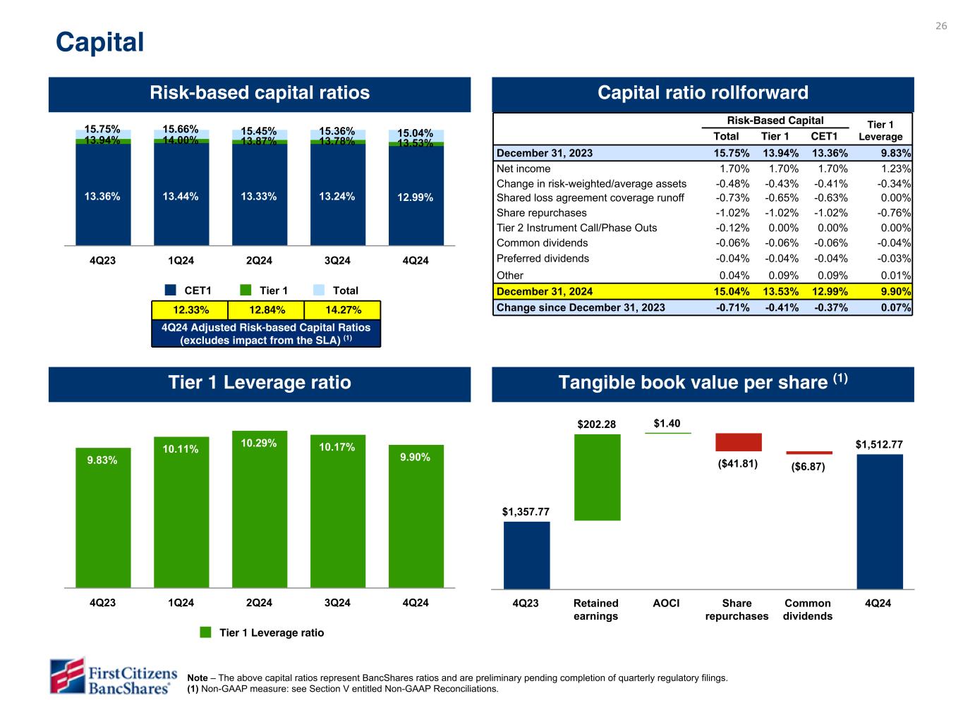 -自己資本比率は規制要件を大幅に上回っている。2024年12月31日現在の推定総リスクベース資本、Tier1リスクベース資本、普通株式Tier1リスクベース資本、Tier1レバレッジ比率はそれぞれ15.04%、13.53%、12.99%、9.90%である。