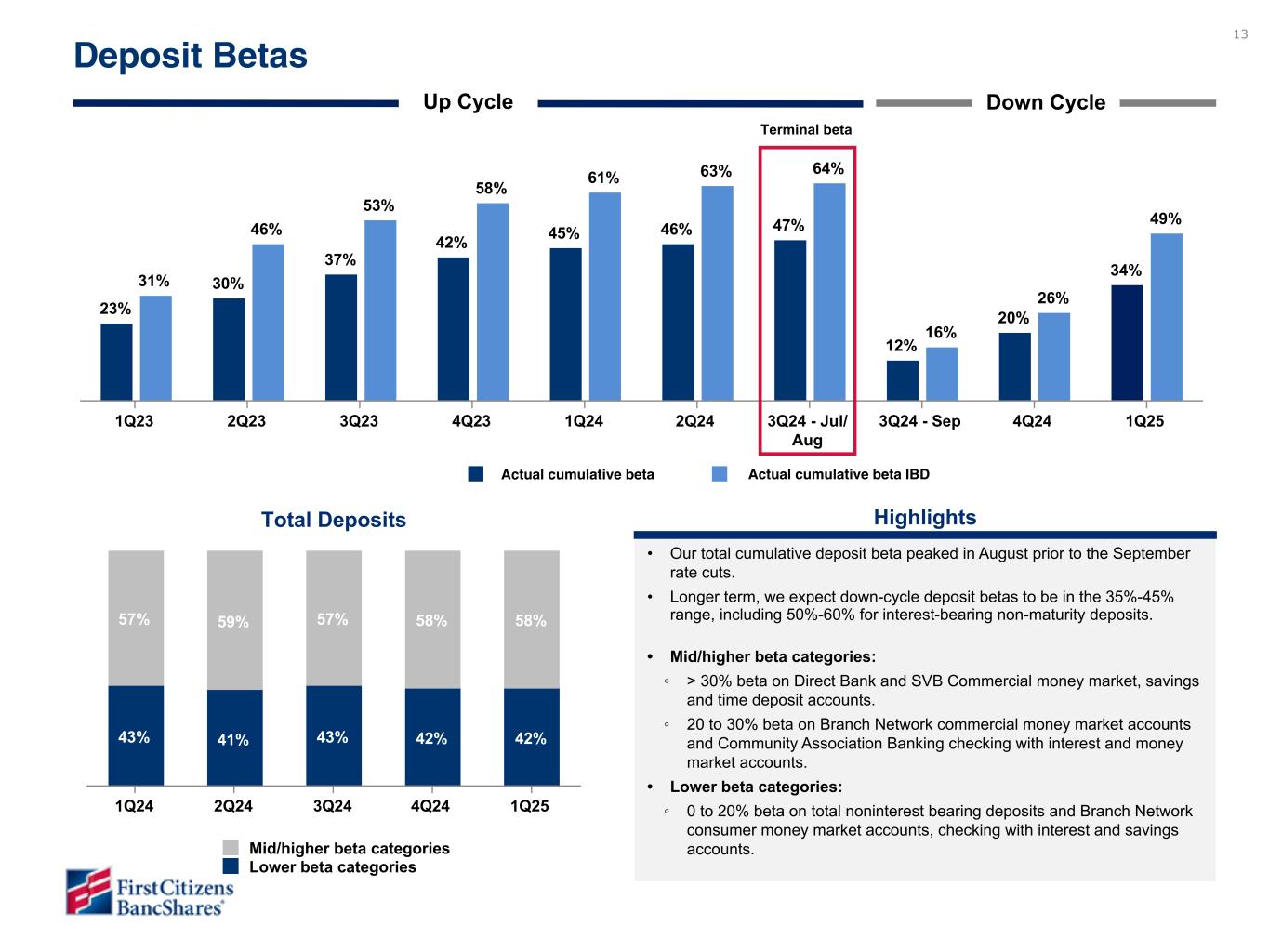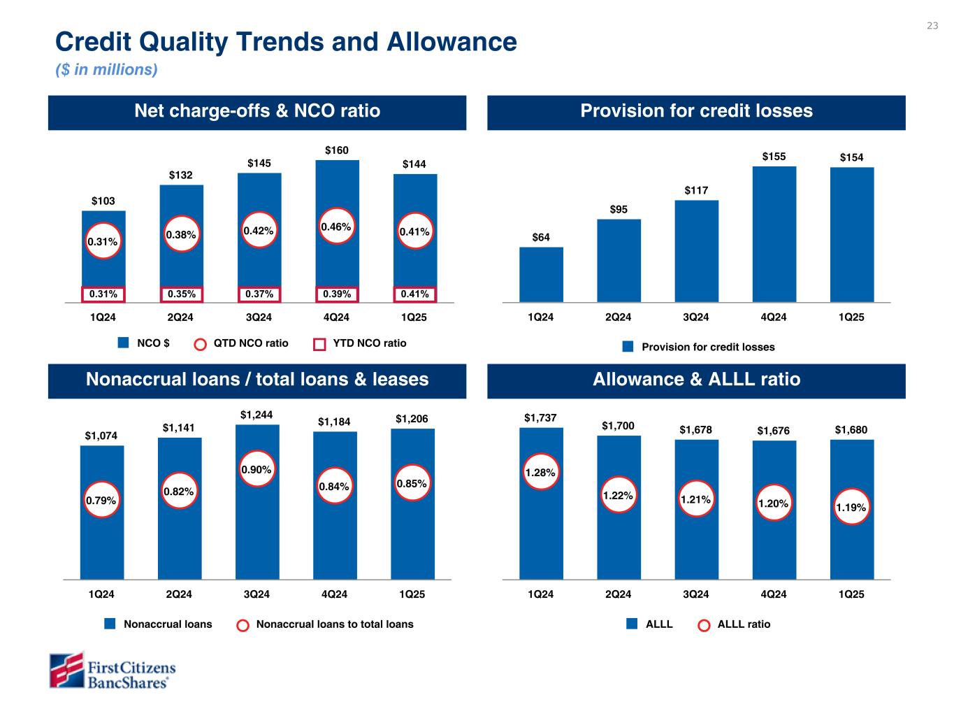 22 3.49% 3.54% 3.57% 3.39% 3.22% 3.45% 3.54% 3.55% 3.32% 3.09% 2.53% 2.61% 2.64% 2.46% 2.32% Cost of interest-bearing liabilities Cost of interest-bearing deposits Cost of deposits 1Q24 2Q24 3Q24 4Q24 1Q25 0.50% 1.00% 1.50% 2.00% 2.50% 3.00% 3.50% 4.00% 4.50% Cost of funds Additional sources of liquidity Categories $ in millions FHLB $ 9,218 FRB 4,203 Line of credit 100 Total $ 13,521 Period End Balances Increase (decrease) 1Q25 4Q24 3Q24 2Q24 1Q24 1Q25 vs. 4Q24 1Q25 vs. 1Q24 Total deposits $ 159,325 80.6 % $ 155,229 80.7 % $ 151,574 80.3 % $ 151,079 80.1 % $ 149,609 79.9 % $ 4,096 $ 9,716 Securities sold under customer repurchase agreements 450 0.2 367 0.2 391 0.2 386 0.2 395 0.2 83 55 Purchase money note 35,829 18.1 35,816 18.6 35,803 19.0 35,790 19.0 35,858 19.2 13 (29) FHLB borrowings — — — — — — — — — — — — Subordinated debt 1,536 0.8 795 0.4 901 0.5 900 0.5 903 0.5 741 633 Senior unsecured borrowings 555 0.3 58 — 59 — 374 0.2 375 0.2 497 180 Other borrowings 36 — 15 — 7 — 8 — 9 — 21 27 Total deposits and borrowed funds $ 197,731 100 % $ 192,280 100 % $ 188,735 100 % $ 188,537 100 % $ 187,149 100 % $ 5,451 $ 10,582 Funding Mix ($ in millions) Highlights 1Q25 vs 4Q24 • Funding mix remained stable with approximately 81% of our funding provided by our deposit base. • Successfully completed the issuance of $500 million of fixed-to-floating rate senior notes and $750 million of fixed-to-fixed rate subordinated notes during the first quarter. • Cost of deposits and interest-bearing deposits decreased by 14 and 23 basis points, respectively, as the impacts from Fed rate cuts late in the fourth quarter pulled through to this quarter. Note – Funding mix percentages may not foot due to rounding. To be updated in subsequent draft