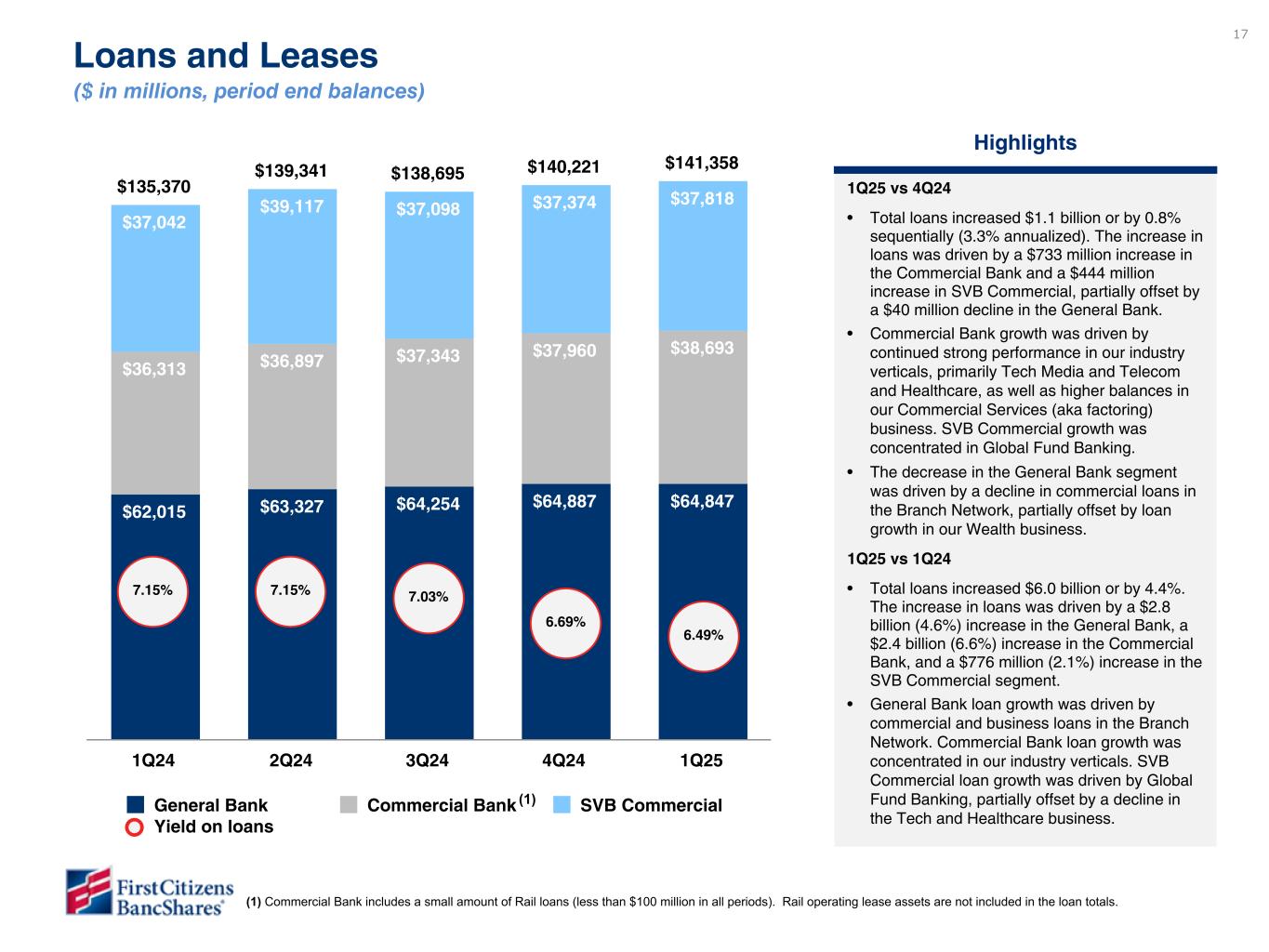 16 16 Increase (decrease) 1Q25 vs 4Q24 1Q25 vs 1Q24 SELECT PERIOD END BALANCES 1Q25 4Q24 1Q24 $ % $ % Interest-earning deposits at banks $ 24,692 $ 21,364 $ 30,792 $ 3,328 63.2 % $ (6,100) (19.8) % Investment securities 44,319 44,090 35,044 229 2.1 9,275 26.5 Loans and leases 141,358 140,221 135,370 1,137 3.3 5,988 4.4 Operating lease equipment, net (2) 9,371 9,323 8,811 48 2.1 560 6.4 Deposits 159,325 155,229 149,609 4,096 10.7 9,716 6.5 Noninterest-bearing deposits 40,767 38,633 39,276 2,134 22.4 1,491 3.8 Borrowings 38,406 37,051 37,540 1,355 14.8 866 2.3 Tangible common equity (non-GAAP) (3) 20,834 20,752 20,326 82 1.6 508 2.5 Common equity 21,414 21,347 20,967 67 1.3 447 2.1 Stockholders' equity 22,295 22,228 21,848 67 1.2 447 2.0 Increase (decrease) KEY METRICS 1Q25 4Q24 1Q24 1Q25 vs 4Q24 1Q25 vs 1Q24 CET1 ratio 12.81 % 12.99 % 13.44 % (0.18) % (0.63) % Book value per common share $ 1,596.30 $ 1,556.16 $ 1,443.03 $ 40.14 $ 153.27 Tangible book value per common share (non-GAAP) (3) 1,553.06 1,512.77 1,398.88 40.29 154.18 Tangible capital to tangible assets (non-GAAP) (3) 9.13 % 9.30 % 9.36 % (0.17) % (0.23) % Loan to deposit ratio 88.72 90.33 90.48 (1.61) (1.76) ALLL to total loans and leases 1.19 1.20 1.28 (0.01) (0.09) Noninterest-bearing deposits to total deposits 25.59 24.89 26.25 0.70 (0.66) Total liquid assets (available cash + HQLS) $ 62,787 $ 59,339 $ 59,331 $ 3,448 $ 3,456 Total liquidity (liquid assets & contingent sources) 85,041 86,628 92,226 (1,587) (7,185) Total liquidity / uninsured deposits 146 % 146 % 168 % — (22.00) % Balance Sheet Highlights ($ in millions, except per share data) (1) (1) (1) Percent change is annualized and is calculated using unrounded numbers. (2) Operating lease equipment, net includes $8.6 billion of rail assets. (3) Non-GAAP measure: see Section V entitled Non-GAAP Reconciliations. Data highlighted in yellow to be provided in subsequent draft