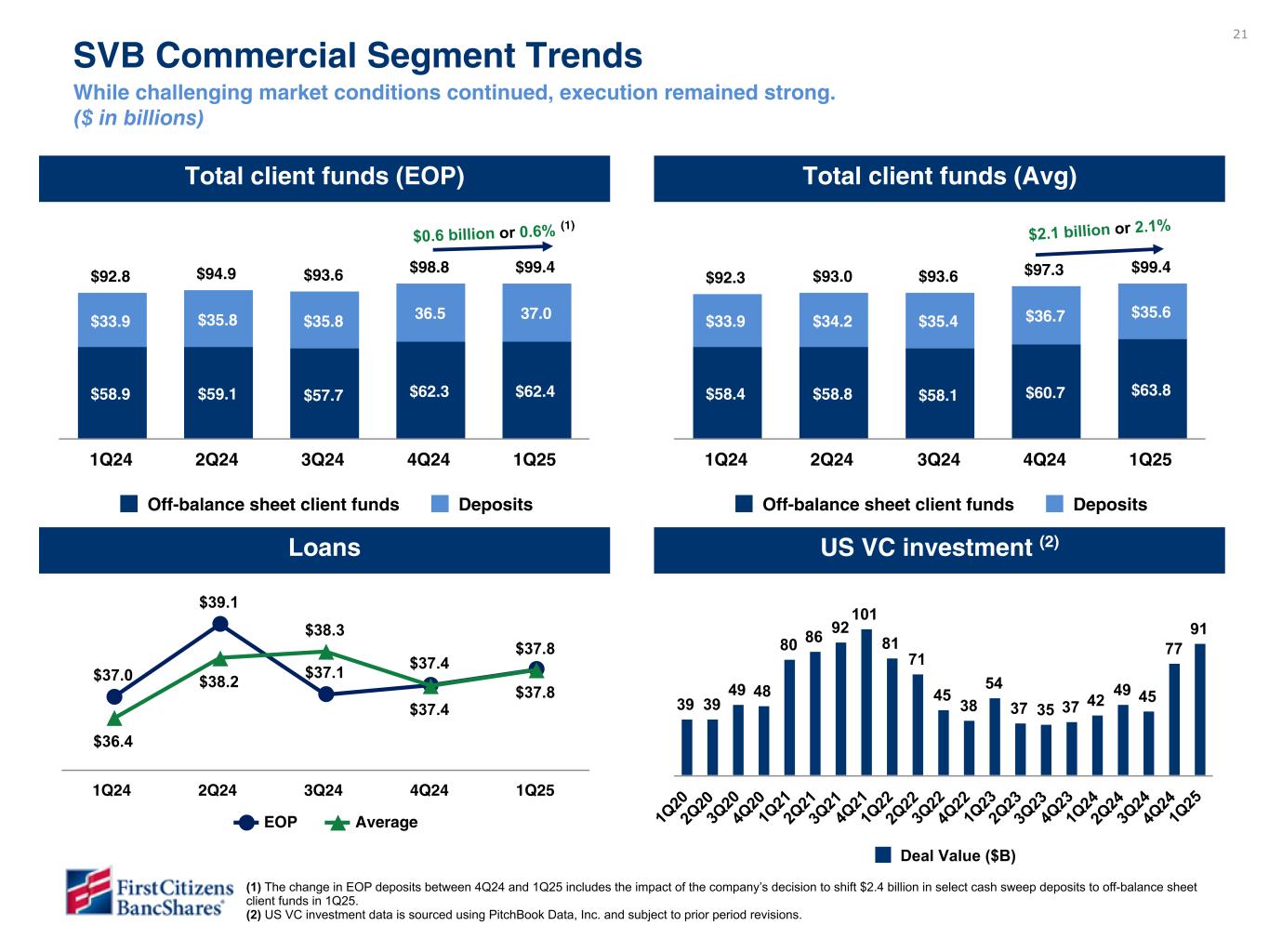 21 US VC investment (2)Loans Total client funds (Avg)Total client funds (EOP) SVB Commercial Segment Trends While challenging market conditions continued, execution remained strong. ($ in billions) $92.8 $94.9 $93.6 $98.8 $99.4 $58.9 $59.1 $57.7 $62.3 $62.4 $33.9 $35.8 $35.8 36.5 37.0 Off-balance sheet client funds Deposits 1Q24 2Q24 3Q24 4Q24 1Q25 $92.3 $93.0 $93.6 $97.3 $99.4 $58.4 $58.8 $58.1 $60.7 $63.8 $33.9 $34.2 $35.4 $36.7 $35.6 Off-balance sheet client funds Deposits 1Q24 2Q24 3Q24 4Q24 1Q25 $37.0 $39.1 $37.1 $37.4 $37.8 $36.4 $38.2 $38.3 $37.4 $37.8 EOP Average 1Q24 2Q24 3Q24 4Q24 1Q25 39 39 49 48 80 86 92 101 81 71 45 38 54 37 35 37 42 49 45 77 91 Deal Value ($B) 1Q 20 2Q 20 3Q 20 4Q 20 1Q 21 2Q 21 3Q 21 4Q 21 1Q 22 2Q 22 3Q 22 4Q 22 1Q 23 2Q 23 3Q 23 4Q 23 1Q 24 2Q 24 3Q 24 4Q 24 1Q 25 $0.6 billion or 0.6%((1) $2.1 billion or 2.1% (1) The change in EOP deposits between 4Q24 and 1Q25 includes the impact of the company’s decision to shift $2.4 billion in select cash sweep deposits to off-balance sheet client funds in 1Q25. (2) US VC investment data is sourced using PitchBook Data, Inc. and subject to prior period revisions. Please do not review. To be provided in subsequent draft once confirmed with business Please do not review. To be provided in subsequent draft once data is available