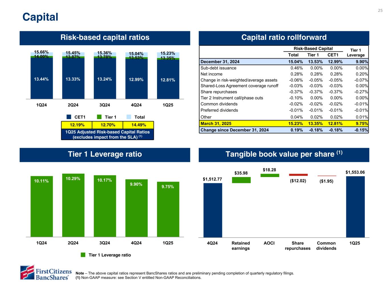 25 10.11% 10.29% 10.17% 9.90% 9.75% Tier 1 Leverage ratio 1Q24 2Q24 3Q24 4Q24 1Q25 Risk-based capital ratios Capital ratio rollforward Tier 1 Leverage ratio Tangible book value per share (1) Capital Risk-Based Capital Tier 1 Leverage Total Tier 1 CET1 December 31, 2024 15.04 % 13.53 % 12.99 % 9.90 % Sub-debt issuance 0.46 % 0.00 % 0.00 % 0.00 % Net income 0.28 % 0.28 % 0.28 % 0.20 % Change in risk-weighted/average assets -0.06 % -0.05 % -0.05 % -0.07 % Shared-Loss Agreement coverage runoff -0.03 % -0.03 % -0.03 % 0.00 % Share repurchases -0.37 % -0.37 % -0.37 % -0.27 % Tier 2 Instrument call/phase outs -0.10 % 0.00 % 0.00 % 0.00 % Common dividends -0.02 % -0.02 % -0.02 % -0.01 % Preferred dividends -0.01 % -0.01 % -0.01 % -0.01 % Other 0.04 % 0.02 % 0.02 % 0.01 % March 31, 2025 15.23 % 13.35 % 12.81 % 9.75 % Change since December 31, 2024 0.19 % -0.18 % -0.18 % -0.15 % 13.44% 13.33% 13.24% 12.99% 12.81% 14.00% 13.87% 13.78% 13.53% 13.35% 15.66% 15.45% 15.36% 15.04% 15.23% CET1 Tier 1 Total 1Q24 2Q24 3Q24 4Q24 1Q25 $1,512.77 $35.98 $18.28 ($12.02) ($1.95) $1,553.06 4Q24 Retained earnings AOCI Share repurchases Common dividends 1Q25 Note – The above capital ratios represent BancShares ratios and are preliminary pending completion of quarterly regulatory filings. (1) Non-GAAP measure: see Section V entitled Non-GAAP Reconciliations. 12.19% 12.70% 14.49% 1Q25 Adjusted Risk-based Capital Ratios (excludes impact from the SLA) (1) Capital data remains under review as we continue to complete internal validations
