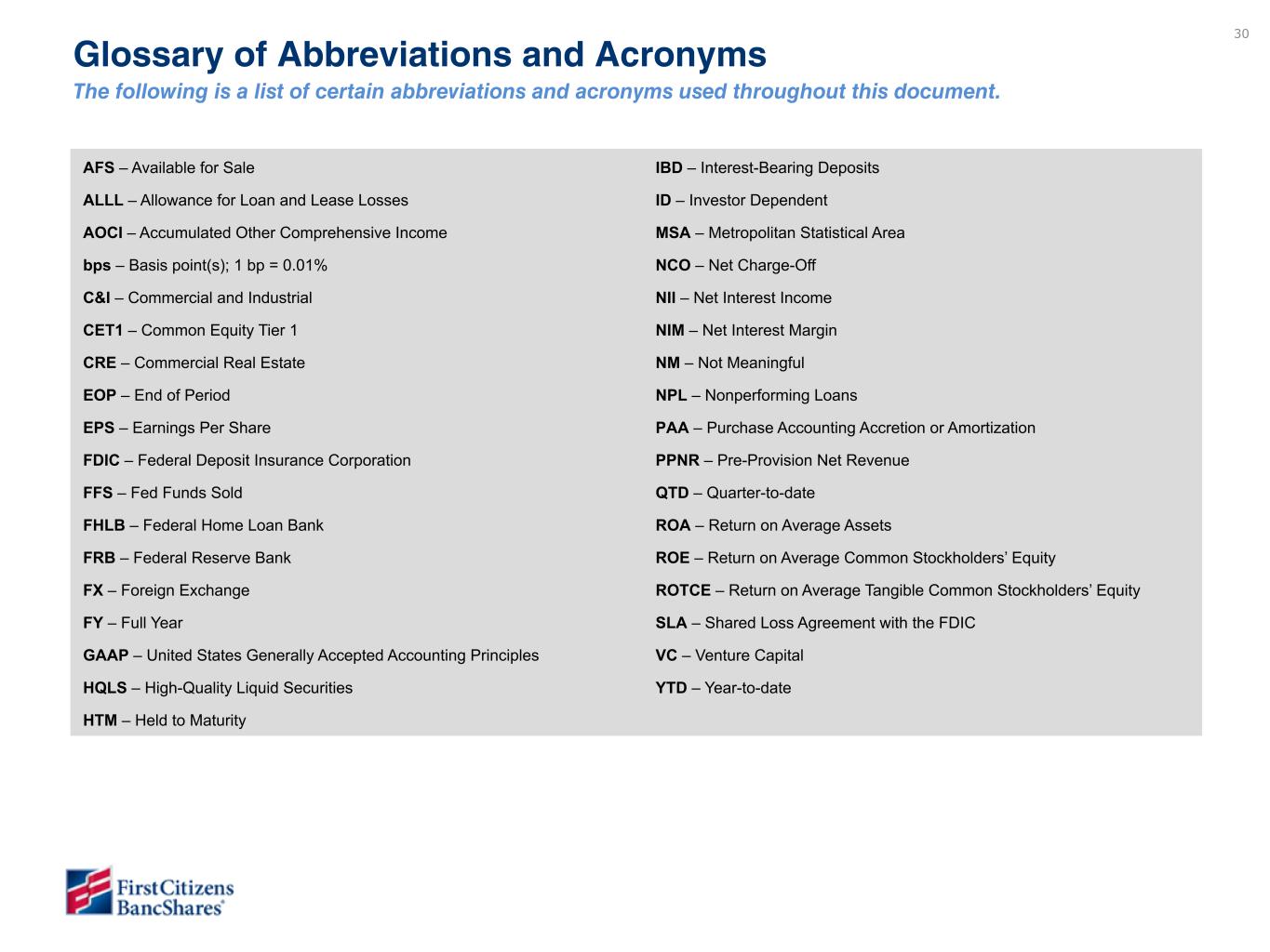 30 Glossary of Abbreviations and Acronyms The following is a list of certain abbreviations and acronyms used throughout this document. AFS – Available for Sale ALLL – Allowance for Loan and Lease Losses AOCI – Accumulated Other Comprehensive Income bps – Basis point(s); 1 bp = 0.01% C&I – Commercial and Industrial CET1 – Common Equity Tier 1 CRE – Commercial Real Estate EOP – End of Period EPS – Earnings Per Share FDIC – Federal Deposit Insurance Corporation FFS – Fed Funds Sold FHLB – Federal Home Loan Bank FRB – Federal Reserve Bank FX – Foreign Exchange FY – Full Year GAAP – United States Generally Accepted Accounting Principles HQLS – High-Quality Liquid Securities HTM – Held to Maturity IBD – Interest-Bearing Deposits ID – Investor Dependent MSA – Metropolitan Statistical Area NCO – Net Charge-Off NII – Net Interest Income NIM – Net Interest Margin NM – Not Meaningful NPL – Nonperforming Loans PAA – Purchase Accounting Accretion or Amortization PPNR – Pre-Provision Net Revenue QTD – Quarter-to-date ROA – Return on Average Assets ROE – Return on Average Common Stockholders’ Equity ROTCE – Return on Average Tangible Common Stockholders’ Equity SLA – Shared Loss Agreement with the FDIC VC – Venture Capital YTD – Year-to-date 1Q25 Additions FY – Full Year 1Q25 Removals LFI – Large Financial Institution TBV – Tangible Book Value Archive ACL – Allowance for Credit Losses CAB - Community Association Banking NIB - Noninterest-bearing RBC - Risk-Based Capital TA - Tangible Assets TCE - Tangible Common Equity AUM – Assets Under Management AWA – Affluent Wealth Advisors LIBOR – London Inter-Bank Offered Rate LOC – Line of Credit MSA – Metropolitan Statistical Area PE – Private Equity RIA – Registered Investment Advisor SOFR – Secured Overnight Financing Rate LTD – Long Term Debt RWA – Risk Weighted Assets ACH – Automated clearing house CECL – Current Expected Credit Losses ETF – Exchange-Traded Fund FFR – Federal Funds Rate IPO – Initial Public Offering LP – Limited Partner VC – Venture Capital AI – Artificial Intelligence FFR – Federal Funds Rate FY – Full Year GFB – Global Fund Banking OBS – Off Balance Sheet Client Funds PCD – Purchased Credit Deteriorated To be updated in a subsequent draft as information becomes more concrete To be updated in subsequent draft Under review - to be provided in subsequent draft