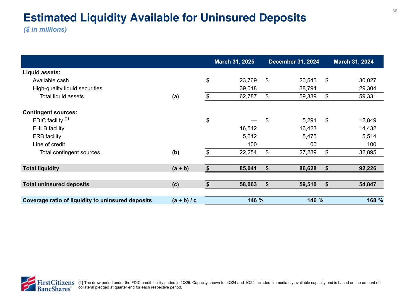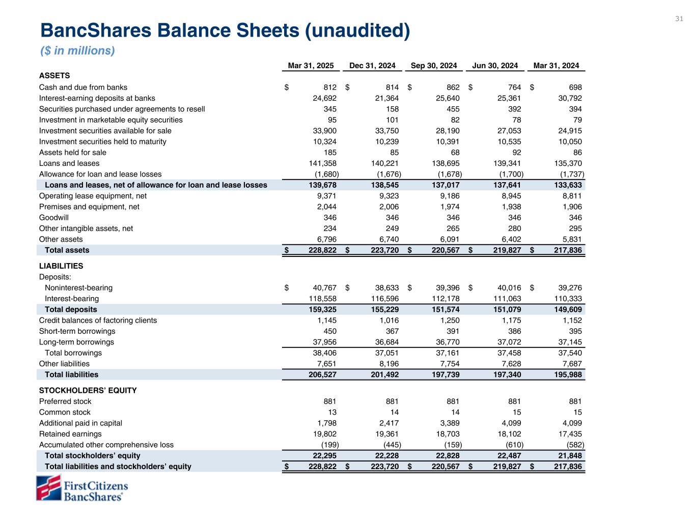 31 Mar 31, 2025 Dec 31, 2024 Sep 30, 2024 Jun 30, 2024 Mar 31, 2024 ASSETS Cash and due from banks $ 812 $ 814 $ 862 $ 764 $ 698 Interest-earning deposits at banks 24,692 21,364 25,640 25,361 30,792 Securities purchased under agreements to resell 345 158 455 392 394 Investment in marketable equity securities 95 101 82 78 79 Investment securities available for sale 33,900 33,750 28,190 27,053 24,915 Investment securities held to maturity 10,324 10,239 10,391 10,535 10,050 Assets held for sale 185 85 68 92 86 Loans and leases 141,358 140,221 138,695 139,341 135,370 Allowance for loan and lease losses (1,680) (1,676) (1,678) (1,700) (1,737) Loans and leases, net of allowance for loan and lease losses 139,678 138,545 137,017 137,641 133,633 Operating lease equipment, net 9,371 9,323 9,186 8,945 8,811 Premises and equipment, net 2,044 2,006 1,974 1,938 1,906 Goodwill 346 346 346 346 346 Other intangible assets, net 234 249 265 280 295 Other assets 6,796 6,740 6,091 6,402 5,831 Total assets $ 228,822 $ 223,720 $ 220,567 $ 219,827 $ 217,836 LIABILITIES Deposits: Noninterest-bearing $ 40,767 $ 38,633 $ 39,396 $ 40,016 $ 39,276 Interest-bearing 118,558 116,596 112,178 111,063 110,333 Total deposits 159,325 155,229 151,574 151,079 149,609 Credit balances of factoring clients 1,145 1,016 1,250 1,175 1,152 Short-term borrowings 450 367 391 386 395 Long-term borrowings 37,956 36,684 36,770 37,072 37,145 Total borrowings 38,406 37,051 37,161 37,458 37,540 Other liabilities 7,651 8,196 7,754 7,628 7,687 Total liabilities 206,527 201,492 197,739 197,340 195,988 STOCKHOLDERS’ EQUITY Preferred stock 881 881 881 881 881 Common stock 13 14 14 15 15 Additional paid in capital 1,798 2,417 3,389 4,099 4,099 Retained earnings 19,802 19,361 18,703 18,102 17,435 Accumulated other comprehensive loss (199) (445) (159) (610) (582) Total stockholders’ equity 22,295 22,228 22,828 22,487 21,848 Total liabilities and stockholders’ equity $ 228,822 $ 223,720 $ 220,567 $ 219,827 $ 217,836 BancShares Balance Sheets (unaudited) ($ in millions)