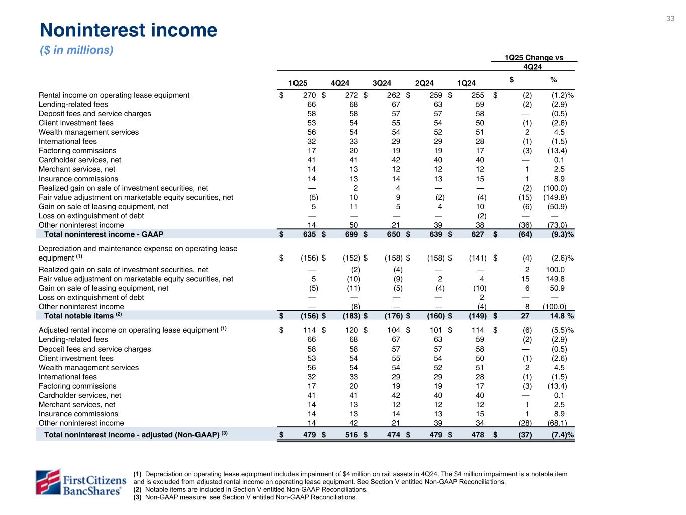 32 1Q25 4Q24 3Q24 2Q24 1Q24 INTEREST INCOME Interest and fees on loans $ 2,236 $ 2,322 $ 2,430 $ 2,422 $ 2,354 Interest on investment securities 414 377 358 330 282 Interest on deposits at banks 245 302 350 378 448 Total interest income 2,895 3,001 3,138 3,130 3,084 INTEREST EXPENSE Deposits 893 957 1,004 975 928 Borrowings 339 335 338 334 339 Total interest expense 1,232 1,292 1,342 1,309 1,267 Net interest income 1,663 1,709 1,796 1,821 1,817 Provision for credit losses 154 155 117 95 64 Net interest income after provision for credit losses 1,509 1,554 1,679 1,726 1,753 NONINTEREST INCOME Rental income on operating lease equipment 270 272 262 259 255 Lending-related fees 66 68 67 63 59 Deposit fees and service charges 58 58 57 57 58 Client investment fees 53 54 55 54 50 Wealth management services 56 54 54 52 51 International fees 32 33 29 29 28 Factoring commissions 17 20 19 19 17 Cardholder services, net 41 41 42 40 40 Merchant services, net 14 13 12 12 12 Insurance commissions 14 13 14 13 15 Realized gain on sale of investment securities, net — 2 4 — — Fair value adjustment on marketable equity securities, net (5) 10 9 (2) (4) Gain on sale of leasing equipment, net 5 11 5 4 10 Loss on extinguishment of debt — — — — (2) Other noninterest income 14 50 21 39 38 Total noninterest income 635 699 650 639 627 NONINTEREST EXPENSE Depreciation on operating lease equipment 98 101 99 98 96 Maintenance and other operating lease expenses 58 55 59 60 45 Personnel cost 818 801 788 745 744 Net occupancy expense 58 60 62 58 62 Equipment expense 136 136 128 126 114 Professional fees 25 30 42 24 25 Third-party processing fees 63 57 55 58 60 FDIC insurance expense 38 33 31 33 41 Marketing expense 32 24 20 18 14 Acquisition-related expenses 42 62 46 44 58 Intangible asset amortization 15 16 15 15 17 Other noninterest expense 110 142 111 107 100 Total noninterest expense 1,493 1,517 1,456 1,386 1,376 Income before income taxes 651 736 873 979 1,004 Income tax expense 168 36 234 272 273 Net income $ 483 $ 700 $ 639 $ 707 $ 731 Preferred stock dividends $ 15 $ 15 $ 15 $ 16 $ 15 Net income available to common stockholders $ 468 $ 685 $ 624 $ 691 $ 716 BancShares Income Statements (unaudited) ($ in millions)