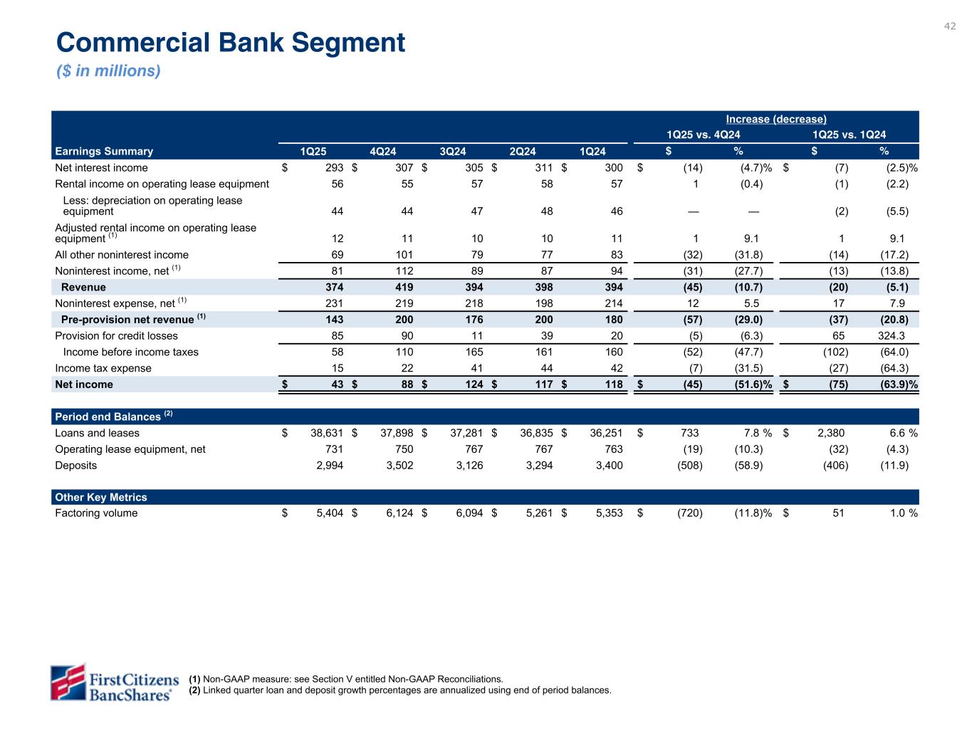 41 General Bank Segment ($ in millions) (1) Non-GAAP measure: see Section V entitled Non-GAAP Reconciliations. (2) Linked quarter loan and deposit growth percentages are annualized using end of period balances. Increase (decrease) 1Q25 vs. 4Q24 1Q25 vs. 1Q24 Earnings Summary 1Q25 4Q24 3Q24 2Q24 1Q24 $ % $ % Net interest income $ 788 $ 777 $ 760 $ 730 $ 684 $ 11 1.4 % $ 104 15.2 % Total noninterest income 164 166 149 152 145 (2) (1.1) 19 13.2 Total revenue 952 943 909 882 829 9 1.0 123 14.9 Total noninterest expense 565 543 553 501 528 22 4.1 37 7.0 Pre-provision net revenue (1) 387 400 356 381 301 (13) (3.3) 86 28.8 Provision for credit losses 46 22 55 37 21 24 109.2 25 122.0 Income before income taxes 341 378 301 344 280 (37) (9.9) 61 21.8 Income tax expense 88 92 99 92 79 (4) (4.0) 9 11.8 Net income $ 253 $ 286 $ 202 $ 252 $ 201 $ (33) (11.8) % $ 52 25.6 % Period end Balances (2) Loans and leases $ 64,847 $ 64,887 $ 64,254 $ 63,327 $ 62,015 $ (40) (0.3) % $ 2,832 4.6 % Deposits 74,309 72,956 71,898 71,261 70,908 1,353 7.5 3,401 4.8 Other Key Metrics Number of branches 536 539 540 542 546 (3) (0.6) % (10) (1.8) % Wealth management assets under management ($B) $ 54.5 $ 55.5 $ 53.6 $ 51.8 $ 51.7 $ (1.0) (1.8) $ 2.8 5.4 Card volume 4,339 4,561 4,362 4,449 4,451 (222) (4.9) (112) (2.5) Merchant volume 1,761 1,759 1,769 1,810 1,728 2 0.1 33 1.9 Highlights • The General Bank segment achieved strong loan growth during the quarter, 4.1% annualized over the linked quarter, driven primarily by business and commercial loan production in the Branch Network. • Deposits increased $893 million compared to the linked quarter driven by growth in the Branch Network. • Segment net revenue increased $32 million compared to the linked quarter as net interest income increased $15 million and noninterest income increased by $17 million. Noninterest expense decreased by $20 million compared to the linked quarter. Please do not review - data is not available. To be provided in subsequent draft. Data has not yet been validated. To be finalized in subsequent draft.