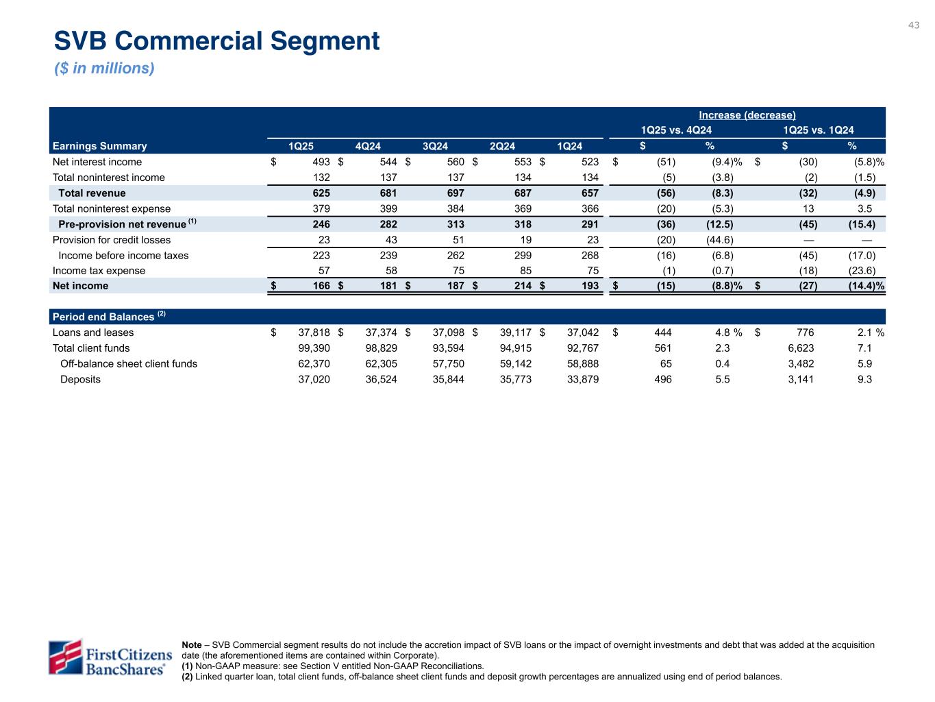 43 Increase (decrease) 1Q25 vs. 4Q24 1Q25 vs. 1Q24 Earnings Summary 1Q25 4Q24 3Q24 2Q24 1Q24 $ % $ % Net interest income $ 493 $ 544 $ 560 $ 553 $ 523 $ (51) (9.4) % $ (30) (5.8) % Total noninterest income 132 137 137 134 134 (5) (3.8) (2) (1.5) Total revenue 625 681 697 687 657 (56) (8.3) (32) (4.9) Total noninterest expense 379 399 384 369 366 (20) (5.3) 13 3.5 Pre-provision net revenue (1) 246 282 313 318 291 (36) (12.5) (45) (15.4) Provision for credit losses 23 43 51 19 23 (20) (44.6) — — Income before income taxes 223 239 262 299 268 (16) (6.8) (45) (17.0) Income tax expense 57 58 75 85 75 (1) (0.7) (18) (23.6) Net income $ 166 $ 181 $ 187 $ 214 $ 193 $ (15) (8.8) % $ (27) (14.4) % Period end Balances (2) Loans and leases $ 37,818 $ 37,374 $ 37,098 $ 39,117 $ 37,042 $ 444 4.8 % $ 776 2.1 % Total client funds 99,390 98,829 93,594 94,915 92,767 561 2.3 6,623 7.1 Off-balance sheet client funds 62,370 62,305 57,750 59,142 58,888 65 0.4 3,482 5.9 Deposits 37,020 36,524 35,844 35,773 33,879 496 5.5 3,141 9.3 SVB Commercial Segment ($ in millions) Note – SVB Commercial segment results do not include the accretion impact of SVB loans or the impact of overnight investments and debt that was added at the acquisition date (the aforementioned items are contained within Corporate). (1) Non-GAAP measure: see Section V entitled Non-GAAP Reconciliations. (2) Linked quarter loan, total client funds, off-balance sheet client funds and deposit growth percentages are annualized using end of period balances. Highlights • SVB Commercial segment loans increased from the linked quarter driven by Global Fund Banking production and improved utilization. • Total client funds increased compared to the linked quarter including growth of in off balance sheet client funds and on balance sheet deposit growth of . The increase in total client funds reflects higher VC investment activity and slowing client cash burn. • Segment net revenue decreased compared to the linked quarter due to lower net interest income partially offset by higher noninterest income. Noninterest expense decreased compared to the linked quarter. Data has not yet been validated. To be finalized in subsequent draft.