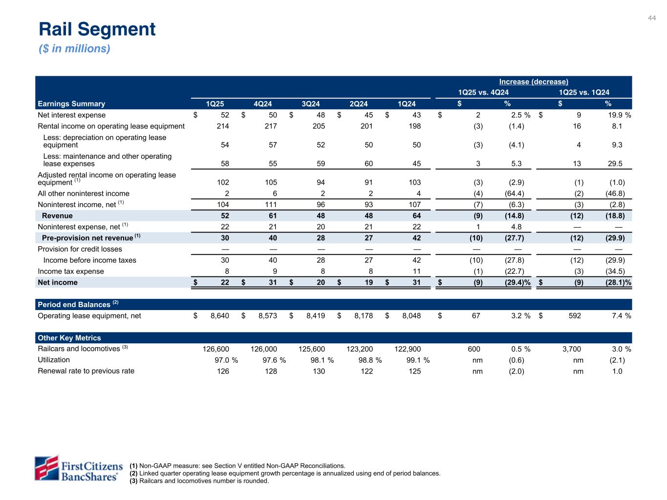 44 Increase (decrease) 1Q25 vs. 4Q24 1Q25 vs. 1Q24 Earnings Summary 1Q25 4Q24 3Q24 2Q24 1Q24 $ % $ % Net interest expense $ 52 $ 50 $ 48 $ 45 $ 43 $ 2 2.5 % $ 9 19.9 % Rental income on operating lease equipment 214 217 205 201 198 (3) (1.4) 16 8.1 Less: depreciation on operating lease equipment 54 57 52 50 50 (3) (4.1) 4 9.3 Less: maintenance and other operating lease expenses 58 55 59 60 45 3 5.3 13 29.5 Adjusted rental income on operating lease equipment (1) 102 105 94 91 103 (3) (2.9) (1) (1.0) All other noninterest income 2 6 2 2 4 (4) (64.4) (2) (46.8) Noninterest income, net (1) 104 111 96 93 107 (7) (6.3) (3) (2.8) Revenue 52 61 48 48 64 (9) (14.8) (12) (18.8) Noninterest expense, net (1) 22 21 20 21 22 1 4.8 — — Pre-provision net revenue (1) 30 40 28 27 42 (10) (27.7) (12) (29.9) Provision for credit losses — — — — — — — — — Income before income taxes 30 40 28 27 42 (10) (27.8) (12) (29.9) Income tax expense 8 9 8 8 11 (1) (22.7) (3) (34.5) Net income $ 22 $ 31 $ 20 $ 19 $ 31 $ (9) (29.4) % $ (9) (28.1) % Period end Balances (2) Operating lease equipment, net $ 8,640 $ 8,573 $ 8,419 $ 8,178 $ 8,048 $ 67 3.2 % $ 592 7.4 % Other Key Metrics Railcars and locomotives (3) 126,600 126,000 125,600 123,200 122,900 600 0.5 % 3,700 3.0 % Utilization 97.0 % 97.6 % 98.1 % 98.8 % 99.1 % nm (0.6) nm (2.1) Renewal rate to previous rate 126 128 130 122 125 nm (2.0) nm 1.0 Rail Segment ($ in millions) (1) Non-GAAP measure: see Section V entitled Non-GAAP Reconciliations. (2) Linked quarter operating lease equipment growth percentage is annualized using end of period balances. (3) Railcars and locomotives number is rounded. Highlights • The fleet is effectively fully utilized, with a utilization rate of 97.0%. • Favorable renewal repricing trends continued, up 28% over the expiring rate for the quarter, with gains in both freight cars (+36%) and tank cars (+21%). • Adjusted rental income on operating lease equipment increased from the linked quarter reflecting fleet growth, continued positive repricing trends and lower maintenance expense. Data has not yet been validated. To be finalized in subsequent draft. Format in process of being updated to better align with new SEC segment disclosures.