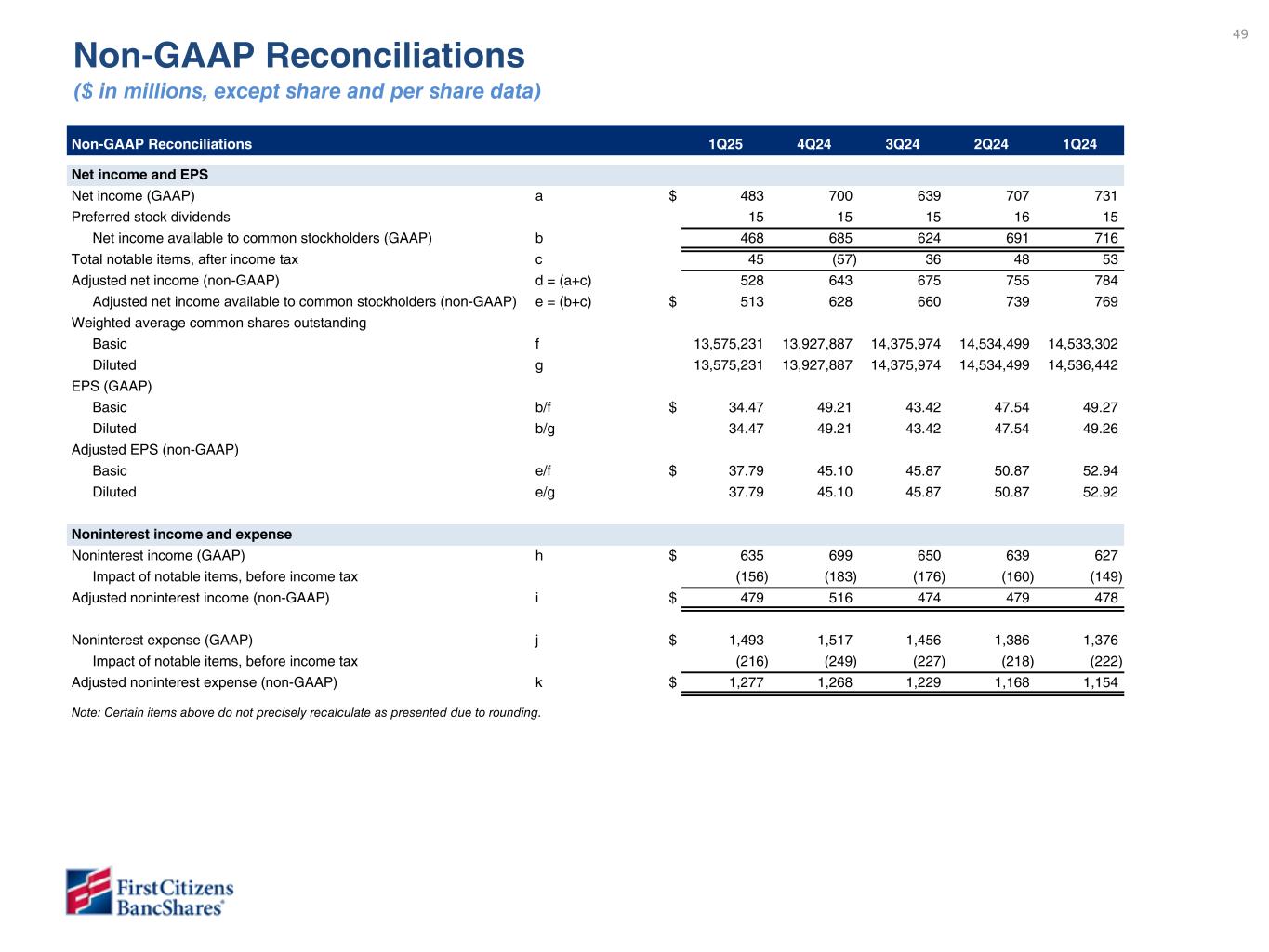 48 1Q23 4Q22 1Q22 Rental income on operating lease equipment (2) $ (156) $ (152) $ (141) Realized gain on sale of investment securities available for sale, net — (2) — Fair value adjustment on marketable equity securities, net 5 (10) 4 Gain on sale of leasing equipment, net (5) (11) (10) Gain on acquisition — — — Gain on extinguishment of debt — — 2 Other noninterest income(3) — (8) (4) Impact on adjusted noninterest income $ (156) $ (183) $ (149) Depreciation on operating lease equipment (2) $ (98) $ (101) $ (96) Maintenance and other operating lease expenses (2) (58) (55) (45) Salaries and benefits — — — Acquisition-related expenses (42) (62) (58) Intangible asset amortization (15) (16) (17) Other noninterest expense (4) (3) (15) 6 Impact on adjusted noninterest expense $ (216) $ (249) $ (222) CECL Day 2 provision and reserve for unfunded commitments — (716) — Provision for credit losses- investment securities available for sale — (4) — Provision for credit losses - total adjustments $ — $ — $ — Impact on adjusted pre-tax income $ 134 $ 173 $ 38 Income tax impact (5) (6) 15 123 20 Impact on adjusted net income $ 45 $ (57) $ 53 Impact on adjusted diluted EPS $ 3.32 $ (4.11) 3.66 Notable Items (1) ($ in millions, except per share data) 1Q25 4Q24 3Q24 2Q24 1Q24 Rental income on operating lease equipment (2) (7) $ (156) $ (152) $ (158) $ (158) $ (141) Realized gain on sale of investment securities, net — (2) (4) — — Fair value adjustment on marketable equity securities, net 5 (10) (9) 2 4 Gain on sale of leasing equipment, net (5) (11) (5) (4) (10) Loss on extinguishment of debt — — — — 2 Other noninterest income (3) — (8) — — (4) Impact of notable items on adjusted noninterest income $ (156) $ (183) $ (176) $ (160) $ (149) Depreciation on operating lease equipment (2) (7) $ (98) $ (101) $ (99) $ (98) $ (96) Maintenance and other operating lease expenses (2) (58) (55) (59) (60) (45) Professional fees (4) — — — (1) (3) FDIC insurance special assessment — — — (2) (9) Acquisition-related expenses (42) (62) (46) (44) (58) Intangible asset amortization (15) (16) (15) (15) (17) Other noninterest expense (5) (3) (15) (8) 2 6 Impact of notable items on adjusted noninterest expense $ (216) $ (249) $ (227) $ (218) $ (222) Impact of notable items on adjusted pre-tax income $ 60 $ 66 $ 51 $ 58 $ 73 Income tax impact (6) 15 123 15 10 20 Impact of notable items on adjusted net income $ 45 $ (57) $ 36 $ 48 $ 53 Impact of notable items on adjusted diluted EPS $ 3.32 $ (4.11) $ 2.45 $ 3.33 $ 3.66 (1) Notable items include income and expense for infrequent transactions and certain recurring items (typically noncash) that management believes should be excluded from adjusted measures (non- GAAP) to enhance understanding of operations and comparability to historical periods. Management utilizes both GAAP and adjusted measures (non-GAAP) to analyze BancShares’ performance. Refer to subsequent pages of this presentation for a reconciliation of non-GAAP measures to the most directly comparable GAAP measures. (2) Depreciation and maintenance and other operating lease expenses are deducted from rental income on operating lease equipment to calculate adjusted rental income on operating lease equipment (non-GAAP). There is no net impact to earnings for this non-GAAP item because adjusted noninterest income and expense are reduced by the same amount. Management believes adjusted rental income on operating lease equipment (non-GAAP) is meaningful because it helps management monitor the performance and profitability of the operating leases after deducting direct expenses. Refer to subsequent pages of this presentation for a reconciliation of non-GAAP measures to the most directly comparable GAAP measures. (3) Other noninterest income includes a gain on sale of portfolio residential mortgages in 4Q24 and a gain on litigation settlement in 1Q24. (4) Professional fees include expenses related to integration activities. (5) Other noninterest expense primarily includes impairment of capitalized software and related projects in 1Q25 and 4Q24, a technology fee in 3Q24, and litigation reserve releases in 2Q24 and 1Q24. (6) For the periods presented, the income tax impact may include tax discrete items and changes in the estimated annualized effective tax rate. 4Q24 includes the impact of a change in our estimated state income tax rates after filing our first income tax returns that included the SVBB Acquisition. (7) Depreciation on operating lease equipment includes impairment of $4 million in 4Q24. The $4 million impairment is a notable item and is excluded from adjusted rental income on operating lease equipment (non-GAAP).