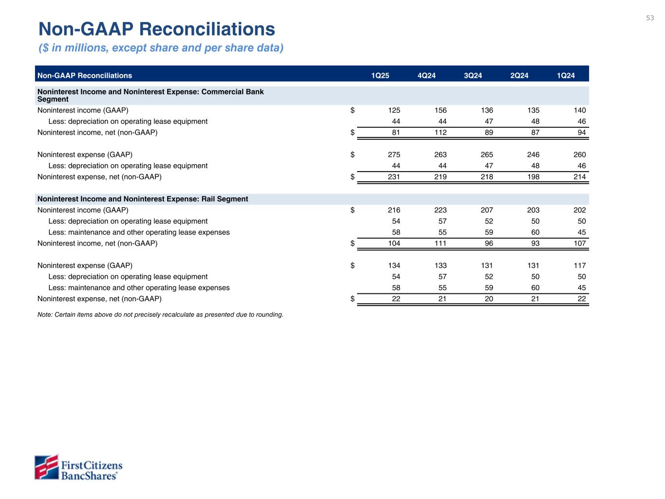 52 Non-GAAP Reconciliations ($ in millions, except share and per share data) Non-GAAP Reconciliations 1Q25 4Q24 3Q24 2Q24 1Q24 Book value and tangible book value per common share Common shares outstanding at period end bb 13,414,938 13,717,621 14,179,208 14,529,735 14,529,735 Book value per share x/bb $ 1,596.30 1,556.16 1,547.81 1,487.00 1,443.03 Tangible book value per common share (non-GAAP) y/bb 1,553.06 1,512.77 1,504.75 1,443.92 1,398.88 Efficiency ratio Net interest income cc $ 1,663 1,709 1,796 1,821 1,817 Efficiency ratio (GAAP) j / (h + cc) 64.97 % 63.01 % 59.49 % 56.36 % 56.30 % Adjusted efficiency ratio (non-GAAP) k / (i + cc) 59.62 56.98 54.15 50.77 50.29 Rental income on operating lease equipment Rental income on operating lease equipment (GAAP) $ 270 272 262 259 255 Less: depreciation on operating lease equipment 98 101 99 98 96 Less: maintenance and other operating lease expenses 58 55 59 60 45 Plus: accelerated depreciation on impaired operating lease equipment — 4 — — — Adjusted rental income on operating lease equipment (non-GAAP) $ 114 120 104 101 114 Rental income on operating lease equipment: Commercial Bank Segment Rental income on operating lease equipment (GAAP) $ 56 55 57 58 57 Less: depreciation on operating lease equipment 44 44 47 48 46 Less: maintenance and other operating lease expenses — — — — — Adjusted rental income on operating lease equipment (non-GAAP) $ 12 11 10 10 11 Rental income on operating lease equipment: Rail Segment Rental income on operating lease equipment (GAAP) $ 214 217 205 201 198 Less: depreciation on operating lease equipment 54 57 52 50 50 Less: maintenance and other operating lease expenses 58 55 59 60 45 Adjusted rental income on operating lease equipment (non-GAAP) $ 102 105 94 91 103 Note: Certain items above do not precisely recalculate as presented due to rounding.