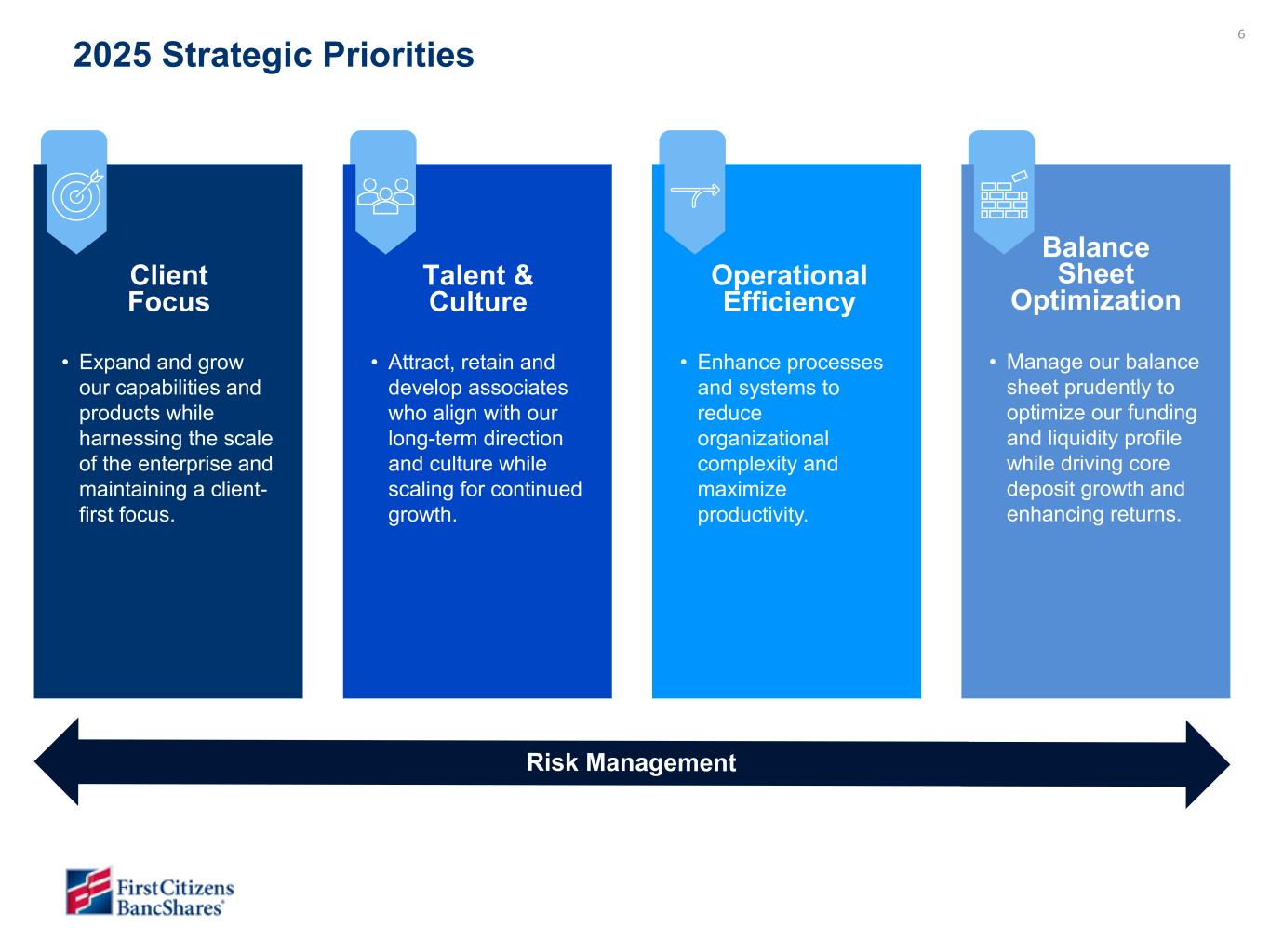 5 Third Quarter 2025 Snapshot Key Highlights: ■ Delivered solid return metrics driven by PPNR (1) growth and positive operating leverage. ■ Achieved strong loan growth in all operating segments led by SVB Commercial with Global Fund Banking loans increasing by 10% from the linked quarter. ■ Deposits grew by $3.3 billion or by 2.0% from the linked quarter driven by growth across our operating segments. ■ On October 16th, we announced an agreement to acquire 138 branches across 11 states from BMO Bank N.A., including deposits of ~$5.7 billion and loans of ~$1.1 billion. ■ Repurchased $900 million in Class A common shares in the third quarter. Since inception in July 2024, we have repurchased $4.0 billion or 15.04% of Class A common shares. (3) Financial Results: Adjusted EPS (1) $44.62 Adjusted ROE / ROA (1) 10.62% / 1.01% NIM 3.26% Adjusted Efficiency Ratio (1) 56.78% Loan / Deposit Change (2) 2.5% / 2.0% CET1 Ratio (4) 11.65% (1) Non-GAAP measure: see Section V entitled Non-GAAP Reconciliations. (2) Loan and deposit growth percentages are current quarter over linked quarter using period end balances. (3) Total repurchases include those since inception of the plan in July 2024 through October 21, 2025. Refer to Share Repurchase Plan Update slide for additional details. (4) The CET1 ratio represents a BancShares ratio and is preliminary pending completion of quarterly regulatory filings. Data highlighted in yellow subject to change. To be finalized in subsequent draft Craig - Do we want to highlight growth at all here since it wasn’t a positive story? We don’t have it in for now but traditionally have a bullet on this page re loans/deposits. Key Highlights: ■ Delivered solid financial results driven by PPNR (1) growth and positive credit performance. ■ Capital and liquidity positions remained strong, with the CET1 ratio (2) ending the quarter at 11.65% and total liquid assets of $61.9 billion. ■ Completed the $3.5 billion 2024 share repurchase plan and repurchased an additional $900 million in Class A common shares in the third quarter under the 2025 plan, bringing total repurchases since plan inception to $4.0 billion (15.04% of Class A common). (3) ■ Announced an agreement to acquire 138 branches located in 11 states from BMO Bank, N.A. bringing our high-touch service and deep sector expertise to clients and communities nationwide while also enabling us to further enhance our liquidity position to support strategic initiatives. ■ Vice Chairwoman and Head of the General Bank, Hope Bryant, was named to the American Banker’s 2025 list of the “Most Powerful Women in Banking” underscoring her leadership and vision, which help drive our success and industry leadership.