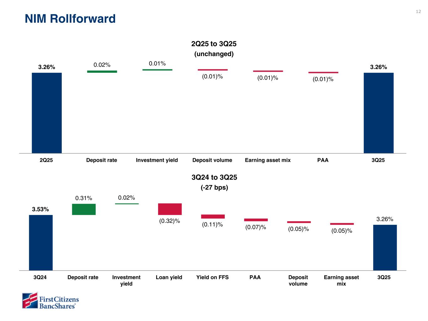 11 $1,695 $1,627 $1,588 $1,629 $1,673 3.33% 3.16% 3.12% 3.14% 3.15% NII, ex PAA (Non-GAAP) NIM, ex PAA (Non-GAAP) 3Q24 4Q24 1Q25 2Q25 3Q25 $1,796 $1,709 $1,663 $1,695 $1,734 3.53% 3.32% 3.26% 3.26% 3.26% NII NIM 3Q24 4Q24 1Q25 2Q25 3Q25 $2,441 $2,946 2.55% 3.14% YTD Dec 21 YTD Dec 22 YTD December 2022 vs YTD December 2021 Net interest income increased by $505 million due to a $483 million increase in interest income and a $22 million decrease in interest expense. The change in net interest income was primarily due to the following: ◦ $256 million increase on interest income on loans due to a higher yield and growth offset by lower SBA- PPP interest and fee income and lower accretion income, ◦ $138 million increase in interest income on investment securities due to higher yield and average balance, ◦ $118 million decline in interest expense on borrowings due to a lower rate and average balance, ◦ $89 million increase in interest income on overnight investments due to a higher yield despite a lower average balance; partially offset by a ◦ $96 million increase in interest expense on deposits due to a higher rate paid. NIM expanded from 2.55% to 3.14%. $505 million & 59 bps Highlights $39 million & 0 bps Net interest income and margin ($ in millions) $44 million & 1 bp 3Q25 vs 2Q25 Net interest income increased by $39 million due to a $53 million increase in interest income, partially offset by a $14 million increase in interest expense. The significant components of the changes follow: • $34 million increase in interest income (ex PAA) on loans (1) due to a higher day count and a higher average balance, partially offset by a lower yield, • $14 million increase in interest income on investment securities due to a higher average balance, a higher yield and a higher day count, • $9 million increase in interest income on overnight investments due to a higher average balance and a higher day count, partially offset by a lower yield, and a • $3 million decrease in interest expense on borrowings due to a lower average balance and a lower rate paid; partially offset by a • $17 million increase in interest expense on deposits primarily due to a higher average balance and a higher day count, partially offset by a lower rate paid, and a • $5 million decrease in PAA. NIM of 3.26% unchanged from the linked quarter. NIM, ex PAA (1) expanded by 1 basis point from 3.14% to 3.15%. See the following page for a rollforward of NIM between 2Q25 and 3Q25. 3Q25 vs 3Q24 Net interest income declined by $62 million due to a $140 million decrease in interest income, partially offset by a $78 million decrease in interest expense. The significant components of the changes follow: • $94 million decrease in interest income (ex PAA) on loans (1) due to a lower yield, partially offset by a higher average balance, • $85 million decrease in interest income on overnight investments due to a lower yield and a lower average balance, • $40 million decrease in PAA, and a • $15 million increase in interest expense on borrowings due to a higher rate paid and a higher average balance; partially offset by a • $93 million decrease in interest expense on deposits due to a lower rate paid, partially offset by a higher average balance, and a • $75 million increase in interest income on investment securities due to a higher average balance and a higher yield. NIM contracted 27 basis points from 3.53% to 3.26%. NIM, ex PAA (1) contracted by 18 basis points from 3.33% to 3.15%. See the following page for a rollforward of NIM between 3Q24 and 3Q25. (1) Non-GAAP measure: see Section V entitled Non-GAAP Reconciliations. (1) (1) Craig - We included the day count impact in overnight investments and investment securities as requested but have left off of borrowings as this had an immaterial impact (see Responses file for more information). Note that day count accounts for ~50% of the loan income change and more like 25% for overnights and investment securities.
