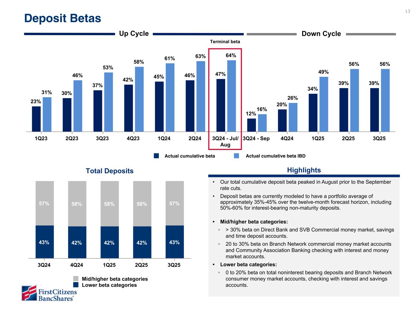 12 3.53% 0.31% 0.02% (0.32)% (0.11)% (0.07)% (0.05)% (0.05)% 3.26% 3Q24 Deposit rate Investment yield Loan yield Yield on FFS PAA Deposit volume Earning asset mix 3Q25 3Q24 to 3Q25 (-27 bps) NIM Rollforward 3.26% 0.02% 0.01% (0.01)% (0.01)% (0.01)% 3.26% 2Q25 Deposit rate Investment yield Deposit volume Earning asset mix PAA 3Q25 2Q25 to 3Q25 (0 bps) Craig - Both loan and investment yield were up and have an impact but each are less than 1 bps. We do want to acknowledge that so added a EA yield because if we round each to loans it confuses the rest of the story. 2Q25 to 3Q25 (unchanged) Earning asset yield