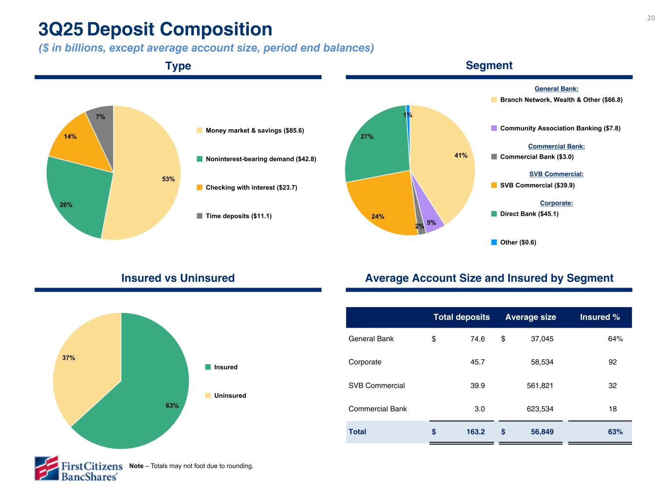 19 $151,574 $155,229 $159,325 $159,935 $163,190 $112,178 $116,596 $118,558 $119,056 $120,438 $39,396 $38,633 $40,767 $40,879 $42,752 3Q24 4Q24 1Q25 2Q25 3Q25 2.27% 2.32% 2.46% 2.64% 2.25% Highlights Interest-bearing Noninterest-bearing Cost of deposits Deposits ($ in millions, period end balances) $140,050 $66,686 $24,105 $18,715 $30,544 1Q23 3Q25 vs. 2Q25 • Total deposits increased $3.3 billion or by 2.0% sequentially, driven by a $2.1 billion increase in SVB Commercial, a $1.1 billion increase in the General Bank, a $79 million increase in the Commercial Bank and a $35 million increase in the Direct Bank. • The increase in SVB Commercial was primarily driven by growth in Global Fund Banking. • Growth in the General Bank was primarily concentrated in the Branch Network and Wealth. 3Q25 vs. 3Q24 • Total deposits grew $11.6 billion or by 7.7%, driven primarily by a $5.6 billion increase in the Direct Bank, a $4.0 billion increase in SVB Commercial due to growth in both Global Fund Banking and Tech & Healthcare Banking and a $2.7 billion increase in the General Bank due to increases in the Branch Network and Wealth. • These increases were partially offset by a $148 million decrease in the Commercial Bank. Highlighted commentary is being validated with businesses Added a note on general bank but its fairly high level as lots of moving parts. See detail provided in additional attachment.