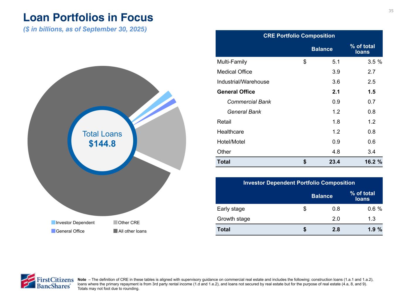 23 $117 $155 $154 $115 $191 Provision for credit losses 3Q24 4Q24 1Q25 2Q25 3Q25 Credit Quality Trends and Allowance ($ in millions) Net charge-offs & NCO ratio Provision for credit losses $145 $160 $144 $119 $234 0.42% 0.46% 0.41% 0.33% 0.65% NCO $ QTD NCO ratio YTD NCO ratio 3Q24 4Q24 1Q25 2Q25 3Q25 $1,244 $1,184 $1,206 $1,319 0.90% 0.84% 0.85% 0.93% 0.97% Nonaccrual loans Nonaccrual loans to total loans 3Q24 4Q24 1Q25 2Q25 3Q25 Nonaccrual loans / total loans & leases Allowance & ALLL ratio $1,678 $1,676 $1,680 $1,672 $1,652 1.21% 1.20% 1.19% 1.18% 1.14% ALLL ALLL ratio 3Q24 4Q24 1Q25 2Q25 3Q25 0.47%0.37% 0.39% 0.41% 0.37% To be updated in subsequent draft Nonaccrual loan balance and % to total loans numbers are preliminary and will be finalized in subsequent draft. $1,244 $1,184 $1,206 $1,319 $1,406 0.90% 0.84% 0.85% 0.93% 0.97% Nonaccrual loans Nonaccrual loans to total loans 3Q24 4Q24 1Q25 2Q25 3Q25 $234 $152 $82 Non-FB FB Non-FB Ratio FB Ratio 3Q24 4Q24 1Q25 2Q25 3Q25 (1) 3Q25 includes an $82 million individual client charge-off in the Commercial Services business within the Commercial Bank segment. This loss contributed 23 bps to the 3Q25 NCO ratio and impacted the quarterly provision for credit losses by $82 million. (1) 3Q25 includes an $82 million individual client loss in Commercial Services (1) Craig - We have not specifically called out ‘First Brands’ on the slide but do plan to note the company in the script (similar with JPM’s approach to discuss ‘tricolor’ during Q&A but to leave off the IP). Additionally, in the ER we are calling this business ‘supply chain finance’. We have opted to call this ‘Commercial Services’, which is aligned with how we have historically discussed this business in the IP and script. Jim Mortimer in legal is aligned with this approach as well.