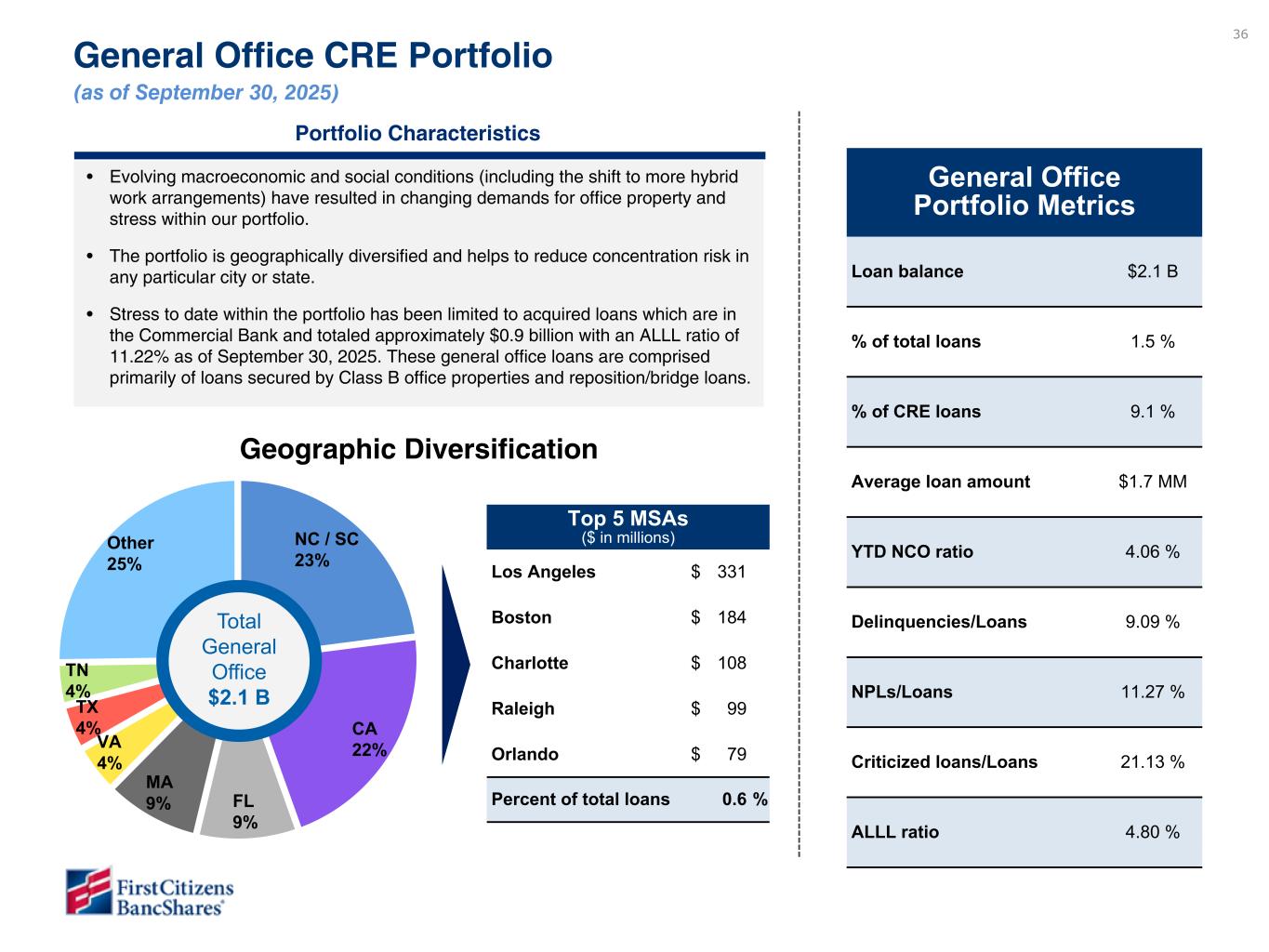 35 Loan Portfolios in Focus ($ in billions, as of September 30, 2025) Total Loans $144.8 CRE $23.4 CRE Portfolio Composition Balance % of total loans Multi-Family $ 5.1 3.5 % Medical Office 3.9 2.7 Industrial/Warehouse 3.6 2.5 General Office 2.1 1.5 Commercial Bank 0.9 0.7 General Bank 1.2 0.8 Retail 1.8 1.2 Healthcare 1.2 0.8 Hotel/Motel 0.9 0.6 Other 4.8 3.4 Total $ 23.4 16.2 % Investor Dependent Portfolio Composition Balance % of total loans Early stage $ 0.8 0.6 % Growth stage 2.0 1.3 Total $ 2.8 1.9 % Investor dependent $2.8 Note – The definition of CRE in these tables is aligned with supervisory guidance on commercial real estate and includes the following: construction loans (1.a.1 and 1.a.2), loans where the primary repayment is from 3rd party rental income (1.d and 1.e.2), and loans not secured by real estate but for the purpose of real estate (4.a, 8, and 9). Totals may not foot due to rounding. Bottom table shifted given change in SEC classes this quarter and still working through formatting on this slide. Investor Dependent Other CRE All other loansGeneral Office General office balances are directional, but not yet final.