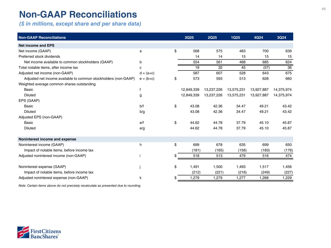 47 1Q23 4Q22 1Q22 Rental income on operating lease equipment (2) $ (165) $ (155) $ (158) Realized gain on sale of investment securities available for sale, net — — (4) Fair value adjustment on marketable equity securities, net (13) (2) (9) Gain on sale of leasing equipment, net (3) (8) (5) Gain on acquisition — — — Gain on extinguishment of debt — — — Other noninterest income(3) — — — Impact on adjusted noninterest income $ (181) $ (165) $ (176) Depreciation on operating lease equipment (2) $ (98) $ (100) $ (99) Maintenance and other operating lease expenses (2) (67) (55) (59) Salaries and benefits (6) — — Acquisition-related expenses (28) (38) (46) Intangible asset amortization (13) (13) (15) Other noninterest expense (4) — (15) (8) Impact on adjusted noninterest expense $ (212) $ (221) $ (227) CECL Day 2 provision and reserve for unfunded commitments — (716) — Provision for credit losses- investment securities available for sale — (4) — Provision for credit losses - total adjustments $ — $ — $ — Impact on adjusted pre-tax income $ 134 $ 173 $ 38 Income tax impact (5) (6) 12 24 15 Impact on adjusted net income $ 19 $ 32 $ 36 Impact on adjusted diluted EPS $ 1.54 $ 2.42 2.45 Notable Items (1) ($ in millions, except per share data) 3Q25 2Q25 1Q25 4Q24 3Q24 Rental income on operating lease equipment (2) (7) $ (165) $ (155) $ (156) $ (152) $ (158) Realized gain on sale of investment securities, net — — — (2) (4) Fair value adjustment on marketable equity securities, net (13) (2) 5 (10) (9) Gain on sale of leasing equipment, net (3) (8) (5) (11) (5) Loss on extinguishment of debt — — — — — Other noninterest income (3) — — — (8) — Impact of notable items on adjusted noninterest income $ (181) $ (165) $ (156) $ (183) $ (176) Depreciation on operating lease equipment (2) (7) $ (98) $ (100) $ (98) $ (101) $ (99) Maintenance and other operating lease expenses (2) (67) (55) (58) (55) (59) Personnel cost (4) (6) — — — — Acquisition-related expenses (28) (38) (42) (62) (46) Intangible asset amortization (13) (13) (15) (16) (15) Other noninterest expense (5) — (15) (3) (15) (8) Impact of notable items on adjusted noninterest expense $ (212) $ (221) $ (216) $ (249) $ (227) Impact of notable items on adjusted pre-tax income $ 31 $ 56 $ 60 $ 66 $ 51 Income tax impact (6) 12 24 15 123 15 Impact of notable items on adjusted net income $ 19 $ 32 $ 45 $ (57) $ 36 Impact of notable items on adjusted diluted EPS $ 1.54 $ 2.42 $ 3.32 $ (4.11) $ 2.45 (1) Notable items include income and expense for infrequent transactions and certain recurring items (typically noncash) that management believes should be excluded from adjusted measures (non- GAAP) to enhance understanding of operations and comparability to historical periods. Management utilizes both GAAP and adjusted measures (non-GAAP) to analyze BancShares’ performance. Refer to subsequent pages of this presentation for a reconciliation of non-GAAP measures to the most directly comparable GAAP measures. (2) Depreciation and maintenance and other operating lease expenses are deducted from rental income on operating lease equipment to calculate adjusted rental income on operating lease equipment (non-GAAP). There is no net impact to earnings for this non-GAAP item because adjusted noninterest income and expense are reduced by the same amount. Management believes adjusted rental income on operating lease equipment (non-GAAP) is meaningful because it helps management monitor the performance and profitability of the operating leases after deducting direct expenses. Refer to subsequent pages of this presentation for a reconciliation of non-GAAP measures to the most directly comparable GAAP measures. (3) Other noninterest income includes a gain on sale of portfolio residential mortgages in 4Q24. (4) Personnel cost includes impairment of internal use software under development in 3Q25. (5) Other noninterest expense includes an accrual resulting from a vendor dispute and an increase in litigation reserve in 2Q25, impairment of capitalized software and related projects in 1Q25 and 4Q24, and a technology fee in 3Q24. (6) For the periods presented, the income tax impact may include tax discrete items and changes in the estimated annualized effective tax rate. 4Q24 includes the impact of a change in our estimated state income tax rates after filing our first income tax returns that included the acquisition of certain assets and liabilities of Silicon Valley Bridge Bank, N.A. (“SVBB Acquisition”). (7) Depreciation on operating lease equipment includes impairment of $4 million in 4Q24. The $4 million impairment is a notable item and is excluded from adjusted rental income on operating lease equipment (non-GAAP). Non-GAAP materials are under review and will be provided in subsequent draft
