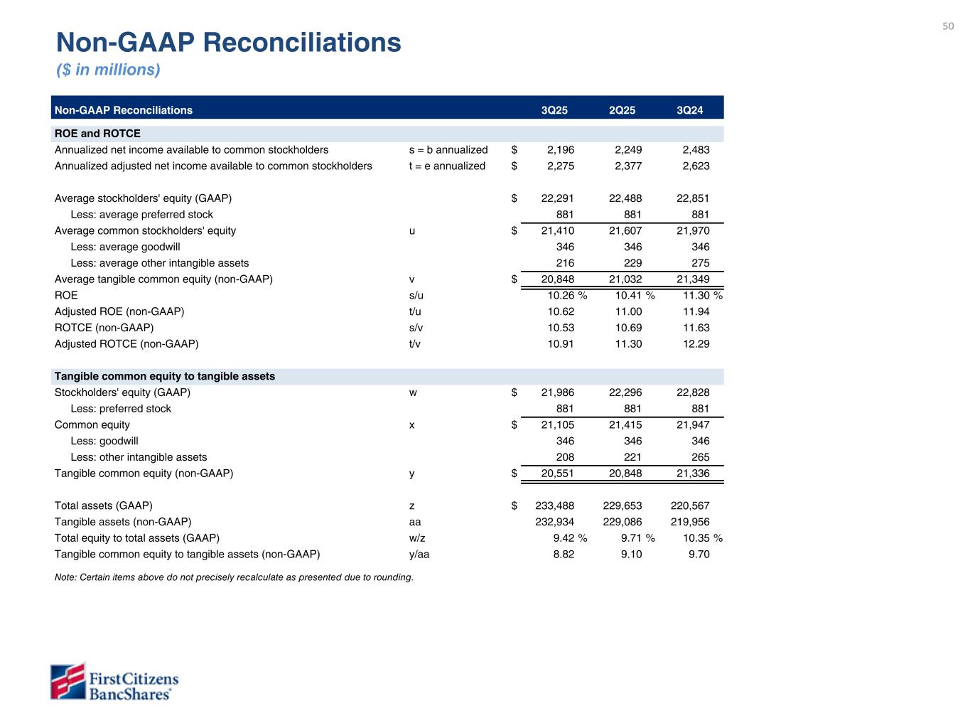 50 Non-GAAP Reconciliations ($ in millions) Non-GAAP Reconciliations 3Q25 2Q25 3Q24 ROE and ROTCE Annualized net income available to common stockholders s = b annualized $ 2,196 2,249 2,483 Annualized adjusted net income available to common stockholders t = e annualized $ 2,275 2,377 2,623 Average stockholders' equity (GAAP) $ 22,291 22,488 22,851 Less: average preferred stock 881 881 881 Average common stockholders' equity u $ 21,410 21,607 21,970 Less: average goodwill 346 346 346 Less: average other intangible assets 216 229 275 Average tangible common equity (non-GAAP) v $ 20,848 21,032 21,349 ROE s/u 10.26 % 10.41 % 11.30 % Adjusted ROE (non-GAAP) t/u 10.62 11.00 11.94 ROTCE (non-GAAP) s/v 10.53 10.69 11.63 Adjusted ROTCE (non-GAAP) t/v 10.91 11.30 12.29 Tangible common equity to tangible assets Stockholders' equity (GAAP) w $ 21,986 22,296 22,828 Less: preferred stock 881 881 881 Common equity x $ 21,105 21,415 21,947 Less: goodwill 346 346 346 Less: other intangible assets 208 221 265 Tangible common equity (non-GAAP) y $ 20,551 20,848 21,336 Total assets (GAAP) z $ 233,488 229,653 220,567 Tangible assets (non-GAAP) aa 232,934 229,086 219,956 Total equity to total assets (GAAP) w/z 9.42 % 9.71 % 10.35 % Tangible common equity to tangible assets (non-GAAP) y/aa 8.82 9.10 9.70 Note: Certain items above do not precisely recalculate as presented due to rounding.
