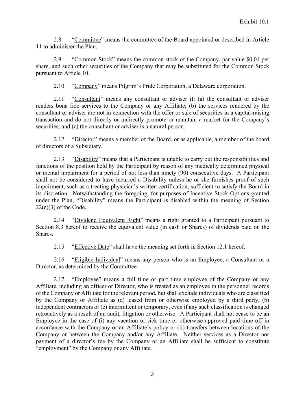 Exhibit 10.1 3 2.8 “Committee” means the committee of the Board appointed or described in Article 11 to administer the Plan. 2.9 “Common Stock” means the common stock of the Company, par value $0.01 per share, and such other securities of the Company that may be substituted for the Common Stock pursuant to Article 10. 2.10 “Company” means Pilgrim’s Pride Corporation, a Delaware corporation. 2.11 “Consultant” means any consultant or adviser if: (a) the consultant or adviser renders bona fide services to the Company or any Affiliate; (b) the services rendered by the consultant or adviser are not in connection with the offer or sale of securities in a capital-raising transaction and do not directly or indirectly promote or maintain a market for the Company’s securities; and (c) the consultant or adviser is a natural person. 2.12 “Director” means a member of the Board, or as applicable, a member of the board of directors of a Subsidiary. 2.13 “Disability” means that a Participant is unable to carry out the responsibilities and functions of the position held by the Participant by reason of any medically determined physical or mental impairment for a period of not less than ninety (90) consecutive days. A Participant shall not be considered to have incurred a Disability unless he or she furnishes proof of such impairment, such as a treating physician’s written certification, sufficient to satisfy the Board in its discretion. Notwithstanding the foregoing, for purposes of Incentive Stock Options granted under the Plan, “Disability” means the Participant is disabled within the meaning of Section 22(e)(3) of the Code. 2.14 “Dividend Equivalent Right” means a right granted to a Participant pursuant to Section 8.3 hereof to receive the equivalent value (in cash or Shares) of dividends paid on the Shares. 2.15 “Effective Date” shall have the meaning set forth in Section 12.1 hereof. 2.16 “Eligible Individual” means any person who is an Employee, a Consultant or a Director, as determined by the Committee. 2.17 “Employee” means a full time or part time employee of the Company or any Affiliate, including an officer or Director, who is treated as an employee in the personnel records of the Company or Affiliate for the relevant period, but shall exclude individuals who are classified by the Company or Affiliate as (a) leased from or otherwise employed by a third party, (b) independent contractors or (c) intermittent or temporary, even if any such classification is changed retroactively as a result of an audit, litigation or otherwise. A Participant shall not cease to be an Employee in the case of (i) any vacation or sick time or otherwise approved paid time off in accordance with the Company or an Affiliate’s policy or (ii) transfers between locations of the Company or between the Company and/or any Affiliate. Neither services as a Director nor payment of a director’s fee by the Company or an Affiliate shall be sufficient to constitute “employment” by the Company or any Affiliate.
