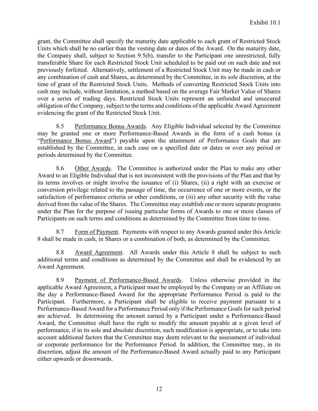 Exhibit 10.1 12 grant, the Committee shall specify the maturity date applicable to each grant of Restricted Stock Units which shall be no earlier than the vesting date or dates of the Award. On the maturity date, the Company shall, subject to Section 9.5(b), transfer to the Participant one unrestricted, fully transferable Share for each Restricted Stock Unit scheduled to be paid out on such date and not previously forfeited. Alternatively, settlement of a Restricted Stock Unit may be made in cash or any combination of cash and Shares, as determined by the Committee, in its sole discretion, at the time of grant of the Restricted Stock Units. Methods of converting Restricted Stock Units into cash may include, without limitation, a method based on the average Fair Market Value of Shares over a series of trading days. Restricted Stock Units represent an unfunded and unsecured obligation of the Company, subject to the terms and conditions of the applicable Award Agreement evidencing the grant of the Restricted Stock Unit. 8.5 Performance Bonus Awards. Any Eligible Individual selected by the Committee may be granted one or more Performance-Based Awards in the form of a cash bonus (a “Performance Bonus Award”) payable upon the attainment of Performance Goals that are established by the Committee, in each case on a specified date or dates or over any period or periods determined by the Committee. 8.6 Other Awards. The Committee is authorized under the Plan to make any other Award to an Eligible Individual that is not inconsistent with the provisions of the Plan and that by its terms involves or might involve the issuance of (i) Shares, (ii) a right with an exercise or conversion privilege related to the passage of time, the occurrence of one or more events, or the satisfaction of performance criteria or other conditions, or (iii) any other security with the value derived from the value of the Shares. The Committee may establish one or more separate programs under the Plan for the purpose of issuing particular forms of Awards to one or more classes of Participants on such terms and conditions as determined by the Committee from time to time. 8.7 Form of Payment. Payments with respect to any Awards granted under this Article 8 shall be made in cash, in Shares or a combination of both, as determined by the Committee. 8.8 Award Agreement. All Awards under this Article 8 shall be subject to such additional terms and conditions as determined by the Committee and shall be evidenced by an Award Agreement. 8.9 Payment of Performance-Based Awards. Unless otherwise provided in the applicable Award Agreement, a Participant must be employed by the Company or an Affiliate on the day a Performance-Based Award for the appropriate Performance Period is paid to the Participant. Furthermore, a Participant shall be eligible to receive payment pursuant to a Performance-Based Award for a Performance Period only if the Performance Goals for such period are achieved. In determining the amount earned by a Participant under a Performance-Based Award, the Committee shall have the right to modify the amount payable at a given level of performance, if in its sole and absolute discretion, such modification is appropriate, or to take into account additional factors that the Committee may deem relevant to the assessment of individual or corporate performance for the Performance Period. In addition, the Committee may, in its discretion, adjust the amount of the Performance-Based Award actually paid to any Participant either upwards or downwards.