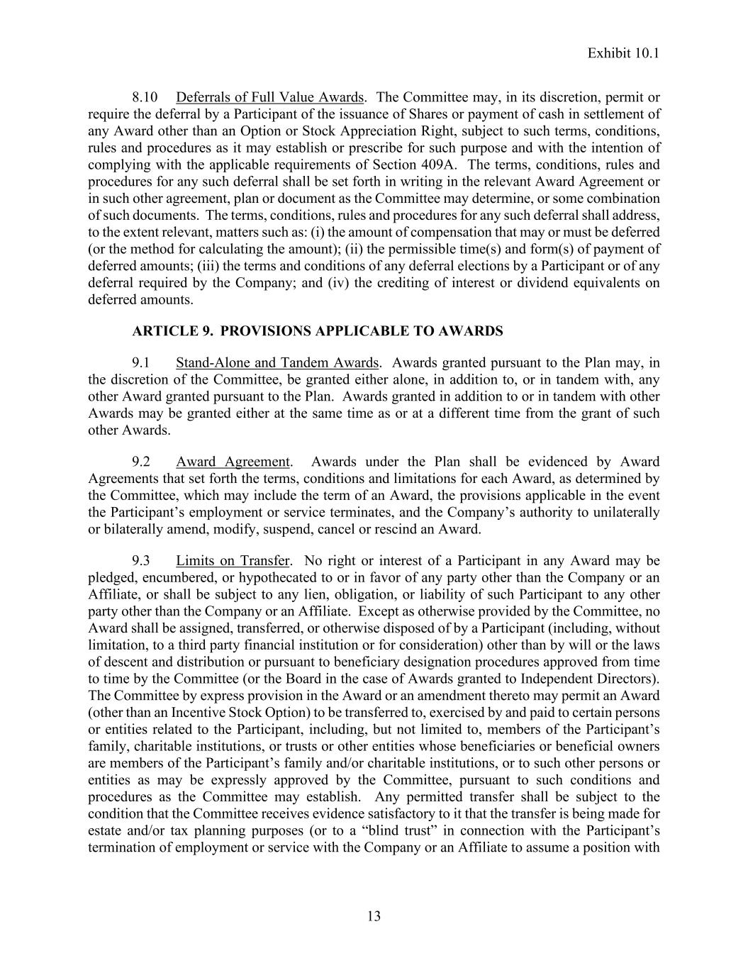 Exhibit 10.1 13 8.10 Deferrals of Full Value Awards. The Committee may, in its discretion, permit or require the deferral by a Participant of the issuance of Shares or payment of cash in settlement of any Award other than an Option or Stock Appreciation Right, subject to such terms, conditions, rules and procedures as it may establish or prescribe for such purpose and with the intention of complying with the applicable requirements of Section 409A. The terms, conditions, rules and procedures for any such deferral shall be set forth in writing in the relevant Award Agreement or in such other agreement, plan or document as the Committee may determine, or some combination of such documents. The terms, conditions, rules and procedures for any such deferral shall address, to the extent relevant, matters such as: (i) the amount of compensation that may or must be deferred (or the method for calculating the amount); (ii) the permissible time(s) and form(s) of payment of deferred amounts; (iii) the terms and conditions of any deferral elections by a Participant or of any deferral required by the Company; and (iv) the crediting of interest or dividend equivalents on deferred amounts. ARTICLE 9. PROVISIONS APPLICABLE TO AWARDS 9.1 Stand-Alone and Tandem Awards. Awards granted pursuant to the Plan may, in the discretion of the Committee, be granted either alone, in addition to, or in tandem with, any other Award granted pursuant to the Plan. Awards granted in addition to or in tandem with other Awards may be granted either at the same time as or at a different time from the grant of such other Awards. 9.2 Award Agreement. Awards under the Plan shall be evidenced by Award Agreements that set forth the terms, conditions and limitations for each Award, as determined by the Committee, which may include the term of an Award, the provisions applicable in the event the Participant’s employment or service terminates, and the Company’s authority to unilaterally or bilaterally amend, modify, suspend, cancel or rescind an Award. 9.3 Limits on Transfer. No right or interest of a Participant in any Award may be pledged, encumbered, or hypothecated to or in favor of any party other than the Company or an Affiliate, or shall be subject to any lien, obligation, or liability of such Participant to any other party other than the Company or an Affiliate. Except as otherwise provided by the Committee, no Award shall be assigned, transferred, or otherwise disposed of by a Participant (including, without limitation, to a third party financial institution or for consideration) other than by will or the laws of descent and distribution or pursuant to beneficiary designation procedures approved from time to time by the Committee (or the Board in the case of Awards granted to Independent Directors). The Committee by express provision in the Award or an amendment thereto may permit an Award (other than an Incentive Stock Option) to be transferred to, exercised by and paid to certain persons or entities related to the Participant, including, but not limited to, members of the Participant’s family, charitable institutions, or trusts or other entities whose beneficiaries or beneficial owners are members of the Participant’s family and/or charitable institutions, or to such other persons or entities as may be expressly approved by the Committee, pursuant to such conditions and procedures as the Committee may establish. Any permitted transfer shall be subject to the condition that the Committee receives evidence satisfactory to it that the transfer is being made for estate and/or tax planning purposes (or to a “blind trust” in connection with the Participant’s termination of employment or service with the Company or an Affiliate to assume a position with