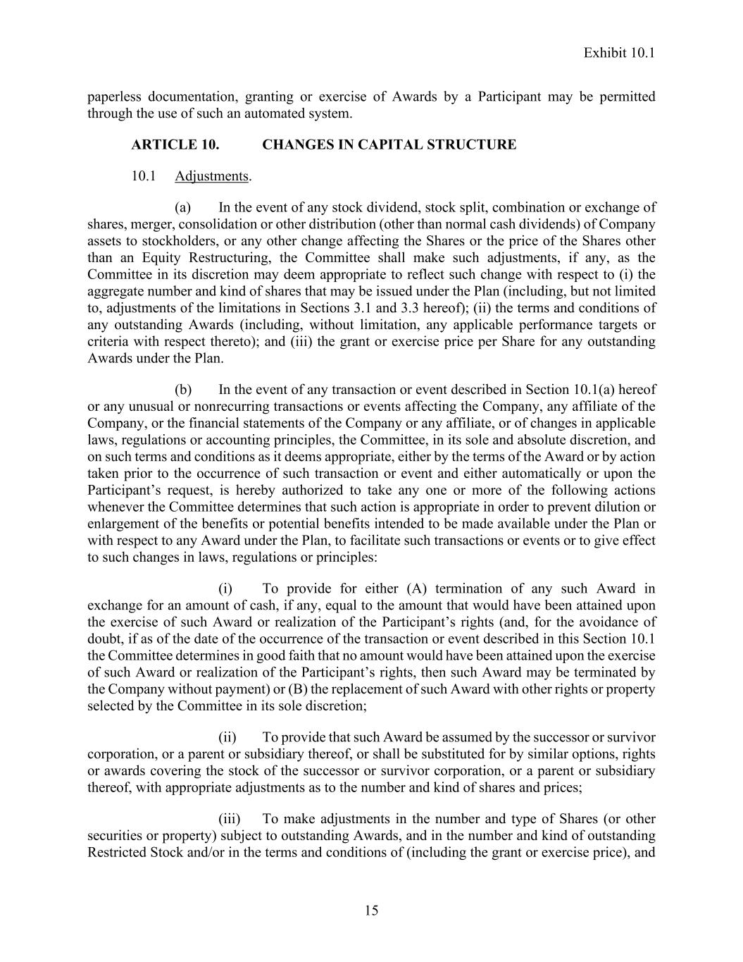 Exhibit 10.1 15 paperless documentation, granting or exercise of Awards by a Participant may be permitted through the use of such an automated system. ARTICLE 10. CHANGES IN CAPITAL STRUCTURE 10.1 Adjustments. (a) In the event of any stock dividend, stock split, combination or exchange of shares, merger, consolidation or other distribution (other than normal cash dividends) of Company assets to stockholders, or any other change affecting the Shares or the price of the Shares other than an Equity Restructuring, the Committee shall make such adjustments, if any, as the Committee in its discretion may deem appropriate to reflect such change with respect to (i) the aggregate number and kind of shares that may be issued under the Plan (including, but not limited to, adjustments of the limitations in Sections 3.1 and 3.3 hereof); (ii) the terms and conditions of any outstanding Awards (including, without limitation, any applicable performance targets or criteria with respect thereto); and (iii) the grant or exercise price per Share for any outstanding Awards under the Plan. (b) In the event of any transaction or event described in Section 10.1(a) hereof or any unusual or nonrecurring transactions or events affecting the Company, any affiliate of the Company, or the financial statements of the Company or any affiliate, or of changes in applicable laws, regulations or accounting principles, the Committee, in its sole and absolute discretion, and on such terms and conditions as it deems appropriate, either by the terms of the Award or by action taken prior to the occurrence of such transaction or event and either automatically or upon the Participant’s request, is hereby authorized to take any one or more of the following actions whenever the Committee determines that such action is appropriate in order to prevent dilution or enlargement of the benefits or potential benefits intended to be made available under the Plan or with respect to any Award under the Plan, to facilitate such transactions or events or to give effect to such changes in laws, regulations or principles: (i) To provide for either (A) termination of any such Award in exchange for an amount of cash, if any, equal to the amount that would have been attained upon the exercise of such Award or realization of the Participant’s rights (and, for the avoidance of doubt, if as of the date of the occurrence of the transaction or event described in this Section 10.1 the Committee determines in good faith that no amount would have been attained upon the exercise of such Award or realization of the Participant’s rights, then such Award may be terminated by the Company without payment) or (B) the replacement of such Award with other rights or property selected by the Committee in its sole discretion; (ii) To provide that such Award be assumed by the successor or survivor corporation, or a parent or subsidiary thereof, or shall be substituted for by similar options, rights or awards covering the stock of the successor or survivor corporation, or a parent or subsidiary thereof, with appropriate adjustments as to the number and kind of shares and prices; (iii) To make adjustments in the number and type of Shares (or other securities or property) subject to outstanding Awards, and in the number and kind of outstanding Restricted Stock and/or in the terms and conditions of (including the grant or exercise price), and