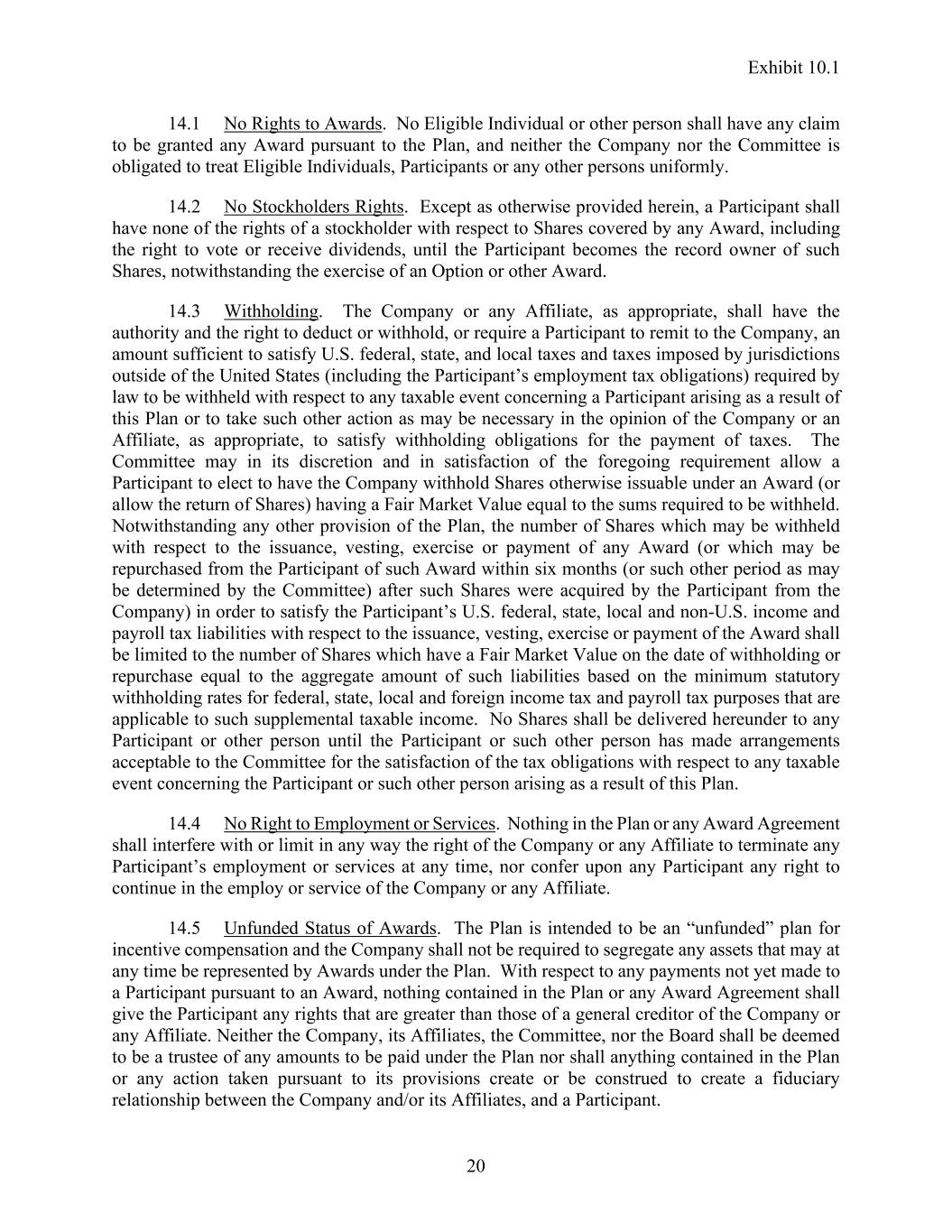 Exhibit 10.1 20 14.1 No Rights to Awards. No Eligible Individual or other person shall have any claim to be granted any Award pursuant to the Plan, and neither the Company nor the Committee is obligated to treat Eligible Individuals, Participants or any other persons uniformly. 14.2 No Stockholders Rights. Except as otherwise provided herein, a Participant shall have none of the rights of a stockholder with respect to Shares covered by any Award, including the right to vote or receive dividends, until the Participant becomes the record owner of such Shares, notwithstanding the exercise of an Option or other Award. 14.3 Withholding. The Company or any Affiliate, as appropriate, shall have the authority and the right to deduct or withhold, or require a Participant to remit to the Company, an amount sufficient to satisfy U.S. federal, state, and local taxes and taxes imposed by jurisdictions outside of the United States (including the Participant’s employment tax obligations) required by law to be withheld with respect to any taxable event concerning a Participant arising as a result of this Plan or to take such other action as may be necessary in the opinion of the Company or an Affiliate, as appropriate, to satisfy withholding obligations for the payment of taxes. The Committee may in its discretion and in satisfaction of the foregoing requirement allow a Participant to elect to have the Company withhold Shares otherwise issuable under an Award (or allow the return of Shares) having a Fair Market Value equal to the sums required to be withheld. Notwithstanding any other provision of the Plan, the number of Shares which may be withheld with respect to the issuance, vesting, exercise or payment of any Award (or which may be repurchased from the Participant of such Award within six months (or such other period as may be determined by the Committee) after such Shares were acquired by the Participant from the Company) in order to satisfy the Participant’s U.S. federal, state, local and non-U.S. income and payroll tax liabilities with respect to the issuance, vesting, exercise or payment of the Award shall be limited to the number of Shares which have a Fair Market Value on the date of withholding or repurchase equal to the aggregate amount of such liabilities based on the minimum statutory withholding rates for federal, state, local and foreign income tax and payroll tax purposes that are applicable to such supplemental taxable income. No Shares shall be delivered hereunder to any Participant or other person until the Participant or such other person has made arrangements acceptable to the Committee for the satisfaction of the tax obligations with respect to any taxable event concerning the Participant or such other person arising as a result of this Plan. 14.4 No Right to Employment or Services. Nothing in the Plan or any Award Agreement shall interfere with or limit in any way the right of the Company or any Affiliate to terminate any Participant’s employment or services at any time, nor confer upon any Participant any right to continue in the employ or service of the Company or any Affiliate. 14.5 Unfunded Status of Awards. The Plan is intended to be an “unfunded” plan for incentive compensation and the Company shall not be required to segregate any assets that may at any time be represented by Awards under the Plan. With respect to any payments not yet made to a Participant pursuant to an Award, nothing contained in the Plan or any Award Agreement shall give the Participant any rights that are greater than those of a general creditor of the Company or any Affiliate. Neither the Company, its Affiliates, the Committee, nor the Board shall be deemed to be a trustee of any amounts to be paid under the Plan nor shall anything contained in the Plan or any action taken pursuant to its provisions create or be construed to create a fiduciary relationship between the Company and/or its Affiliates, and a Participant.