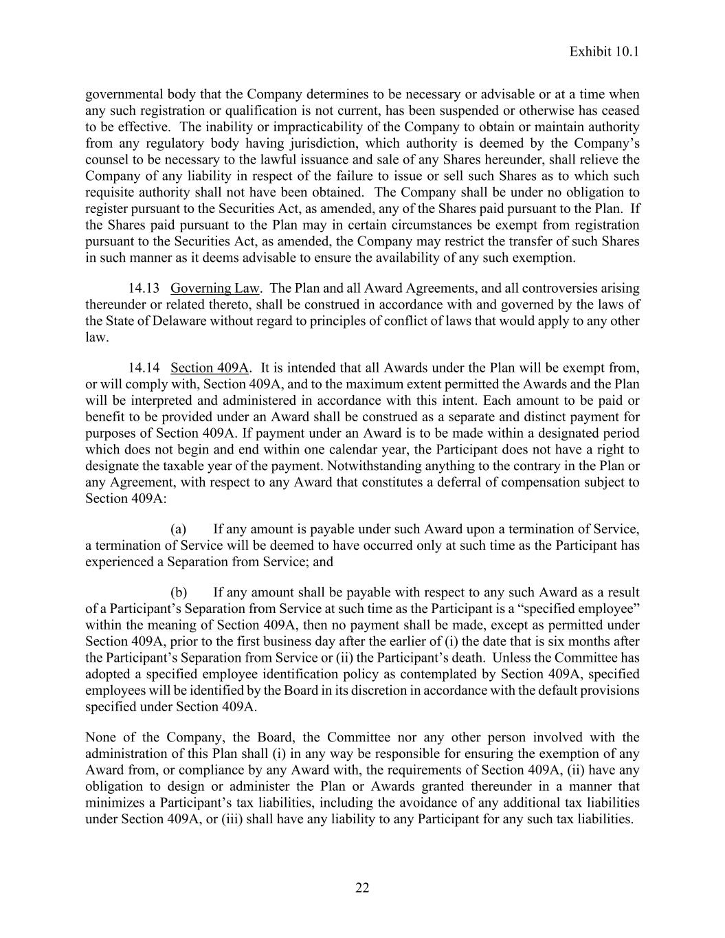 Exhibit 10.1 22 governmental body that the Company determines to be necessary or advisable or at a time when any such registration or qualification is not current, has been suspended or otherwise has ceased to be effective. The inability or impracticability of the Company to obtain or maintain authority from any regulatory body having jurisdiction, which authority is deemed by the Company’s counsel to be necessary to the lawful issuance and sale of any Shares hereunder, shall relieve the Company of any liability in respect of the failure to issue or sell such Shares as to which such requisite authority shall not have been obtained. The Company shall be under no obligation to register pursuant to the Securities Act, as amended, any of the Shares paid pursuant to the Plan. If the Shares paid pursuant to the Plan may in certain circumstances be exempt from registration pursuant to the Securities Act, as amended, the Company may restrict the transfer of such Shares in such manner as it deems advisable to ensure the availability of any such exemption. 14.13 Governing Law. The Plan and all Award Agreements, and all controversies arising thereunder or related thereto, shall be construed in accordance with and governed by the laws of the State of Delaware without regard to principles of conflict of laws that would apply to any other law. 14.14 Section 409A. It is intended that all Awards under the Plan will be exempt from, or will comply with, Section 409A, and to the maximum extent permitted the Awards and the Plan will be interpreted and administered in accordance with this intent. Each amount to be paid or benefit to be provided under an Award shall be construed as a separate and distinct payment for purposes of Section 409A. If payment under an Award is to be made within a designated period which does not begin and end within one calendar year, the Participant does not have a right to designate the taxable year of the payment. Notwithstanding anything to the contrary in the Plan or any Agreement, with respect to any Award that constitutes a deferral of compensation subject to Section 409A: (a) If any amount is payable under such Award upon a termination of Service, a termination of Service will be deemed to have occurred only at such time as the Participant has experienced a Separation from Service; and (b) If any amount shall be payable with respect to any such Award as a result of a Participant’s Separation from Service at such time as the Participant is a “specified employee” within the meaning of Section 409A, then no payment shall be made, except as permitted under Section 409A, prior to the first business day after the earlier of (i) the date that is six months after the Participant’s Separation from Service or (ii) the Participant’s death. Unless the Committee has adopted a specified employee identification policy as contemplated by Section 409A, specified employees will be identified by the Board in its discretion in accordance with the default provisions specified under Section 409A. None of the Company, the Board, the Committee nor any other person involved with the administration of this Plan shall (i) in any way be responsible for ensuring the exemption of any Award from, or compliance by any Award with, the requirements of Section 409A, (ii) have any obligation to design or administer the Plan or Awards granted thereunder in a manner that minimizes a Participant’s tax liabilities, including the avoidance of any additional tax liabilities under Section 409A, or (iii) shall have any liability to any Participant for any such tax liabilities.