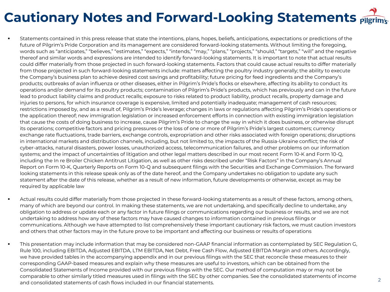 Cautionary Notes and Forward-Looking Statements Statements contained in this press release that state the intentions, plans, hopes, beliefs, anticipations, expectations or predictions of the future of Pilgrim’s Pride Corporation and its management are considered forward-looking statements. Without limiting the foregoing, words such as “anticipates,” “believes,” “estimates,” “expects,” “intends,” “may,” “plans,” “projects,” “should,” “targets,” “will” and the negative thereof and similar words and expressions are intended to identify forward-looking statements. It is important to note that actual results could differ materially from those projected in such forward-looking statements. Factors that could cause actual results to differ materially from those projected in such forward-looking statements include: matters affecting the poultry industry generally; the ability to execute the Company’s business plan to achieve desired cost savings and profitability; future pricing for feed ingredients and the Company’s products; outbreaks of avian influenza or other diseases, either in Pilgrim’s Pride’s flocks or elsewhere, affecting its ability to conduct its operations and/or demand for its poultry products; contamination of Pilgrim’s Pride’s products, which has previously and can in the future lead to product liability claims and product recalls; exposure to risks related to product liability, product recalls, property damage and injuries to persons, for which insurance coverage is expensive, limited and potentially inadequate; management of cash resources; restrictions imposed by, and as a result of, Pilgrim’s Pride’s leverage; changes in laws or regulations affecting Pilgrim’s Pride’s operations or the application thereof; new immigration legislation or increased enforcement efforts in connection with existing immigration legislation that cause the costs of doing business to increase, cause Pilgrim’s Pride to change the way in which it does business, or otherwise disrupt its operations; competitive factors and pricing pressures or the loss of one or more of Pilgrim’s Pride’s largest customers; currency exchange rate fluctuations, trade barriers, exchange controls, expropriation and other risks associated with foreign operations; disruptions in international markets and distribution channels, including, but not limited to, the impacts of the Russia-Ukraine conflict; the risk of cyber-attacks, natural disasters, power losses, unauthorized access, telecommunication failures, and other problems on our information systems; and the impact of uncertainties of litigation and other legal matters described in our most recent Form 10-K and Form 10-Q, including the In re Broiler Chicken Antitrust Litigation, as well as other risks described under “Risk Factors” in the Company’s Annual Report on Form 10-K, Quarterly Reports on Form 10-Q and subsequent filings with the Securities and Exchange Commission. The forward looking statements in this release speak only as of the date hereof, and the Company undertakes no obligation to update any such statement after the date of this release, whether as a result of new information, future developments or otherwise, except as may be required by applicable law Actual results could differ materially from those projected in these forward-looking statements as a result of these factors, among others, many of which are beyond our control. In making these statements, we are not undertaking, and specifically decline to undertake, any obligation to address or update each or any factor in future filings or communications regarding our business or results, and we are not undertaking to address how any of these factors may have caused changes to information contained in previous filings or communications. Although we have attempted to list comprehensively these important cautionary risk factors, we must caution investors and others that other factors may in the future prove to be important and affecting our business or results of operations This presentation may include information that may be considered non-GAAP financial information as contemplated by SEC Regulation G, Rule 100, including EBITDA, Adjusted EBITDA, LTM EBITDA, Net Debt, Free Cash Flow, Adjusted EBITDA Margin and others. Accordingly, we have provided tables in the accompanying appendix and in our previous filings with the SEC that reconcile these measures to their corresponding GAAP-based measures and explain why these measures are useful to investors, which can be obtained from the Consolidated Statements of Income provided with our previous filings with the SEC. Our method of computation may or may not be comparable to other similarly titled measures used in filings with the SEC by other companies. See the consolidated statements of income and consolidated statements of cash flows included in our financial statements. 2