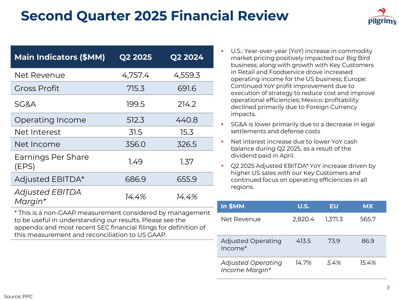 Financial Results For The Second Quarter Ended June 29th 2025 Pilgrim’s Pride Corporation (NASDAQ: PPC)