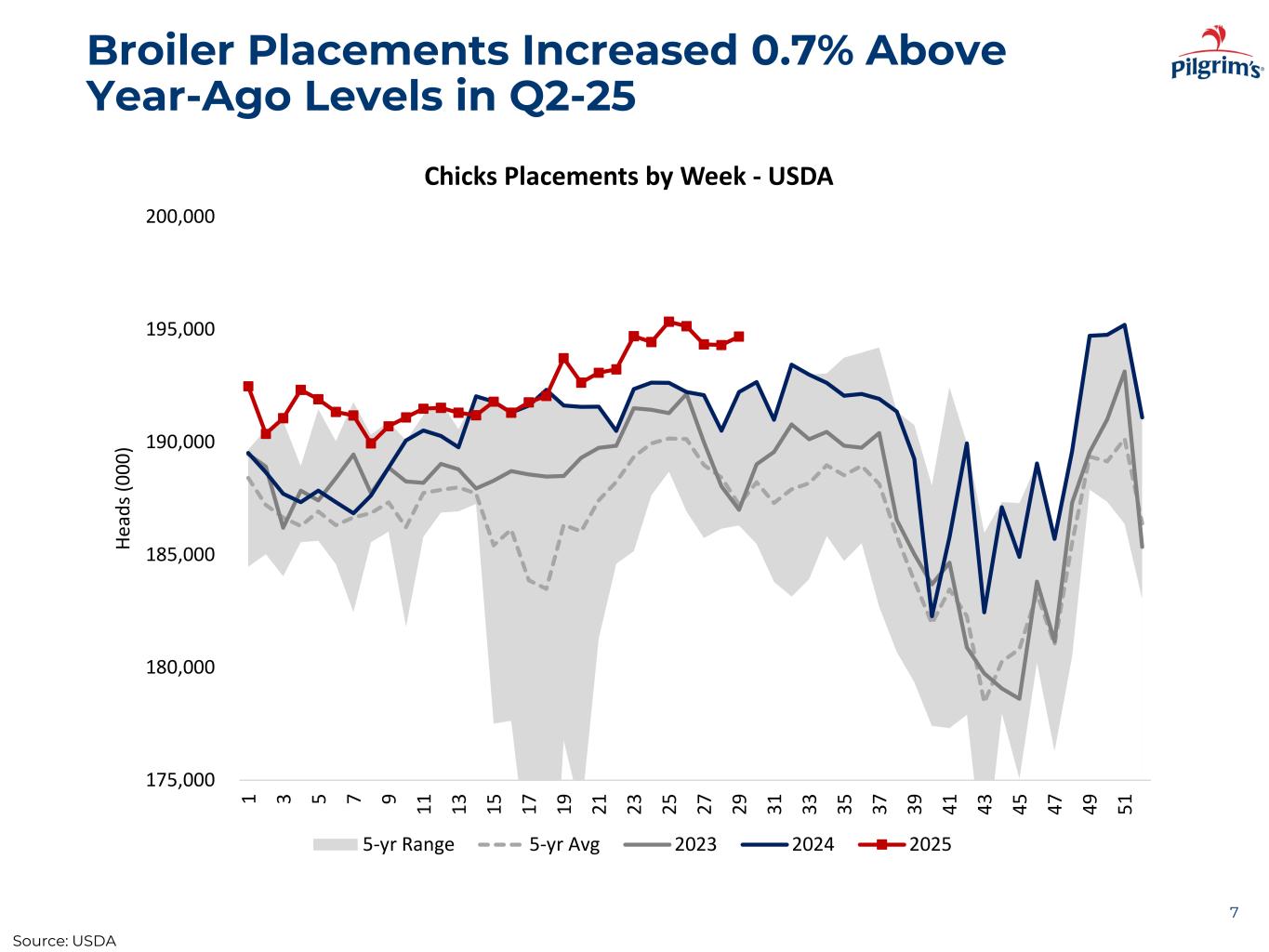 Egg Sets Increased 1.1% YoY in Q2-25; Hatchability Flat Compared to Q2-24 Levels 6 215,000 220,000 225,000 230,000 235,000 240,000 245,000 250,000 255,000 1 5 9 13 17 21 25 29 33 37 41 45 49 Eg gs (0 00 ) Chicken Eggs Set by Week - USDA 5-yr Range 5-yr Avg 2023 2024 2025 75% 76% 77% 78% 79% 80% 81% 82% 1 4 7 10 13 16 19 22 25 28 31 34 37 40 43 46 49 52 Ha tc ha bi lit y (% ) Chicken Hatchability by Week - USDA 5-yr Range 5-yr Avg 2023 2024 2025 Source: USDA