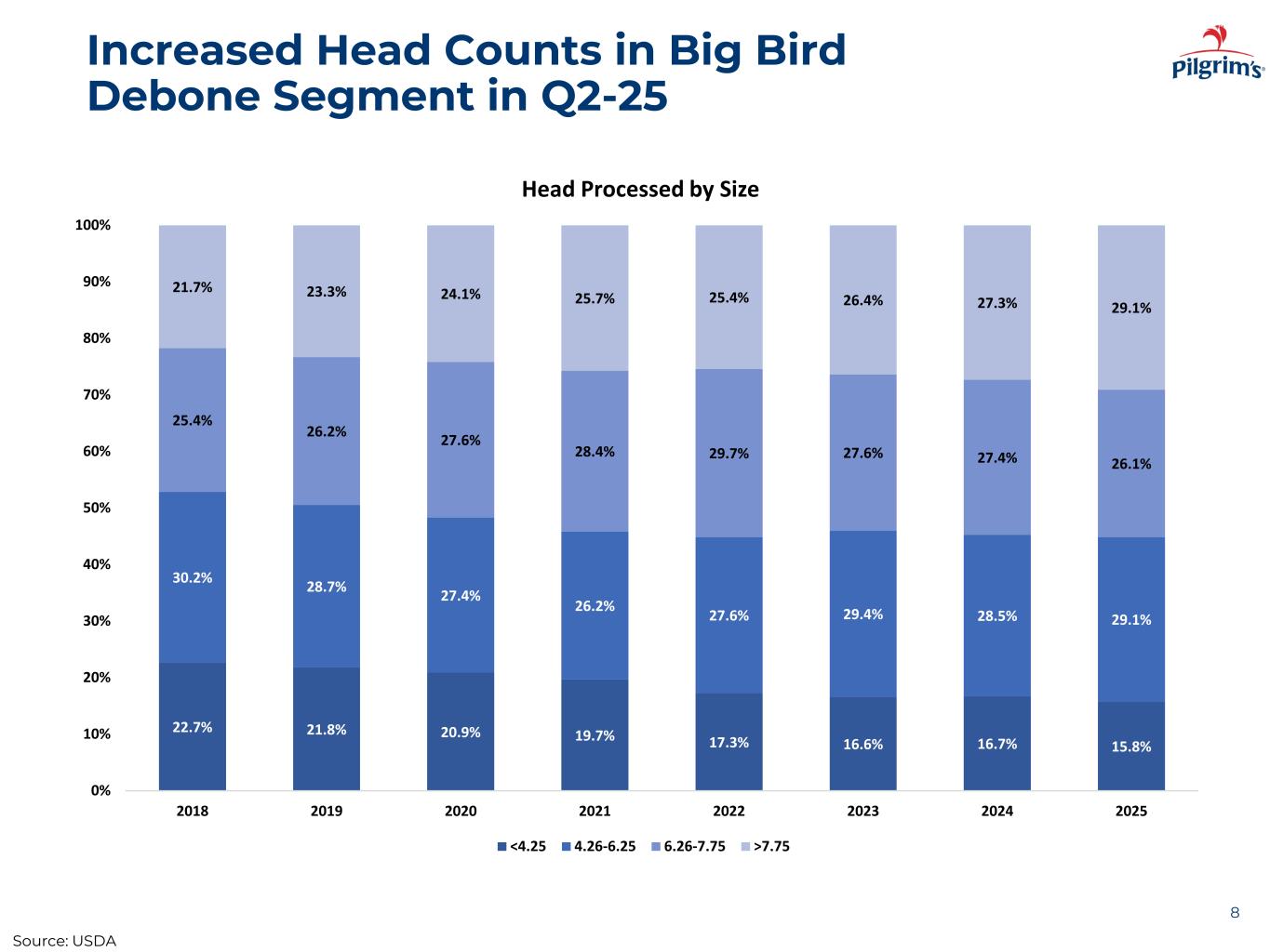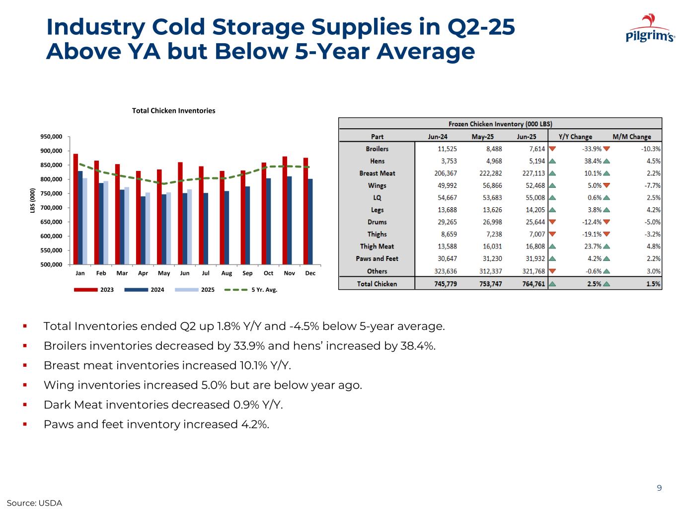 Increased Head Counts in Big Bird Debone Segment in Q2-25 8 22.7% 21.8% 20.9% 19.7% 17.3% 16.6% 16.7% 15.8% 30.2% 28.7% 27.4% 26.2% 27.6% 29.4% 28.5% 29.1% 25.4% 26.2% 27.6% 28.4% 29.7% 27.6% 27.4% 26.1% 21.7% 23.3% 24.1% 25.7% 25.4% 26.4% 27.3% 29.1% 0% 10% 20% 30% 40% 50% 60% 70% 80% 90% 100% 2018 2019 2020 2021 2022 2023 2024 2025 Head Processed by Size <4.25 4.26-6.25 6.26-7.75 >7.75 Source: USDA