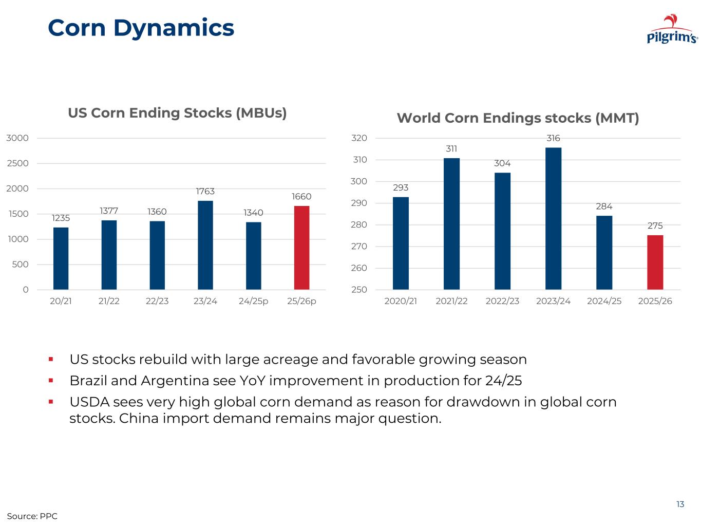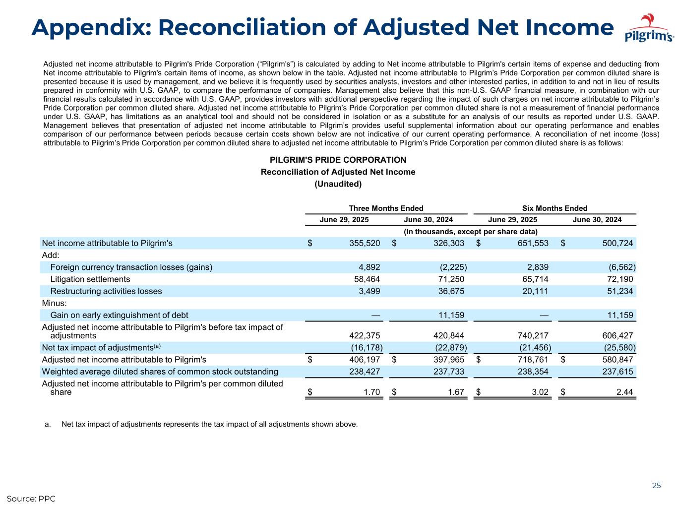 Appendix: Reconciliation of Adjusted Net Income 25 Adjusted net income attributable to Pilgrim's Pride Corporation (“Pilgrim's”) is calculated by adding to Net income attributable to Pilgrim's certain items of expense and deducting from Net income attributable to Pilgrim's certain items of income, as shown below in the table. Adjusted net income attributable to Pilgrim’s Pride Corporation per common diluted share is presented because it is used by management, and we believe it is frequently used by securities analysts, investors and other interested parties, in addition to and not in lieu of results prepared in conformity with U.S. GAAP, to compare the performance of companies. Management also believe that this non-U.S. GAAP financial measure, in combination with our financial results calculated in accordance with U.S. GAAP, provides investors with additional perspective regarding the impact of such charges on net income attributable to Pilgrim’s Pride Corporation per common diluted share. Adjusted net income attributable to Pilgrim’s Pride Corporation per common diluted share is not a measurement of financial performance under U.S. GAAP, has limitations as an analytical tool and should not be considered in isolation or as a substitute for an analysis of our results as reported under U.S. GAAP. Management believes that presentation of adjusted net income attributable to Pilgrim’s provides useful supplemental information about our operating performance and enables comparison of our performance between periods because certain costs shown below are not indicative of our current operating performance. A reconciliation of net income (loss) attributable to Pilgrim’s Pride Corporation per common diluted share to adjusted net income attributable to Pilgrim’s Pride Corporation per common diluted share is as follows: PILGRIM'S PRIDE CORPORATION Reconciliation of Adjusted Net Income (Unaudited) Three Months Ended Six Months Ended June 29, 2025 June 30, 2024 June 29, 2025 June 30, 2024 (In thousands, except per share data) Net income attributable to Pilgrim's $ 355,520 $ 326,303 $ 651,553 $ 500,724 Add: Foreign currency transaction losses (gains) 4,892 (2,225) 2,839 (6,562) Litigation settlements 58,464 71,250 65,714 72,190 Restructuring activities losses 3,499 36,675 20,111 51,234 Minus: Gain on early extinguishment of debt — 11,159 — 11,159 Adjusted net income attributable to Pilgrim's before tax impact of adjustments 422,375 420,844 740,217 606,427 Net tax impact of adjustments(a) (16,178) (22,879) (21,456) (25,580) Adjusted net income attributable to Pilgrim's $ 406,197 $ 397,965 $ 718,761 $ 580,847 Weighted average diluted shares of common stock outstanding 238,427 237,733 238,354 237,615 Adjusted net income attributable to Pilgrim's per common diluted share $ 1.70 $ 1.67 $ 3.02 $ 2.44 a. Net tax impact of adjustments represents the tax impact of all adjustments shown above. Source: PPC