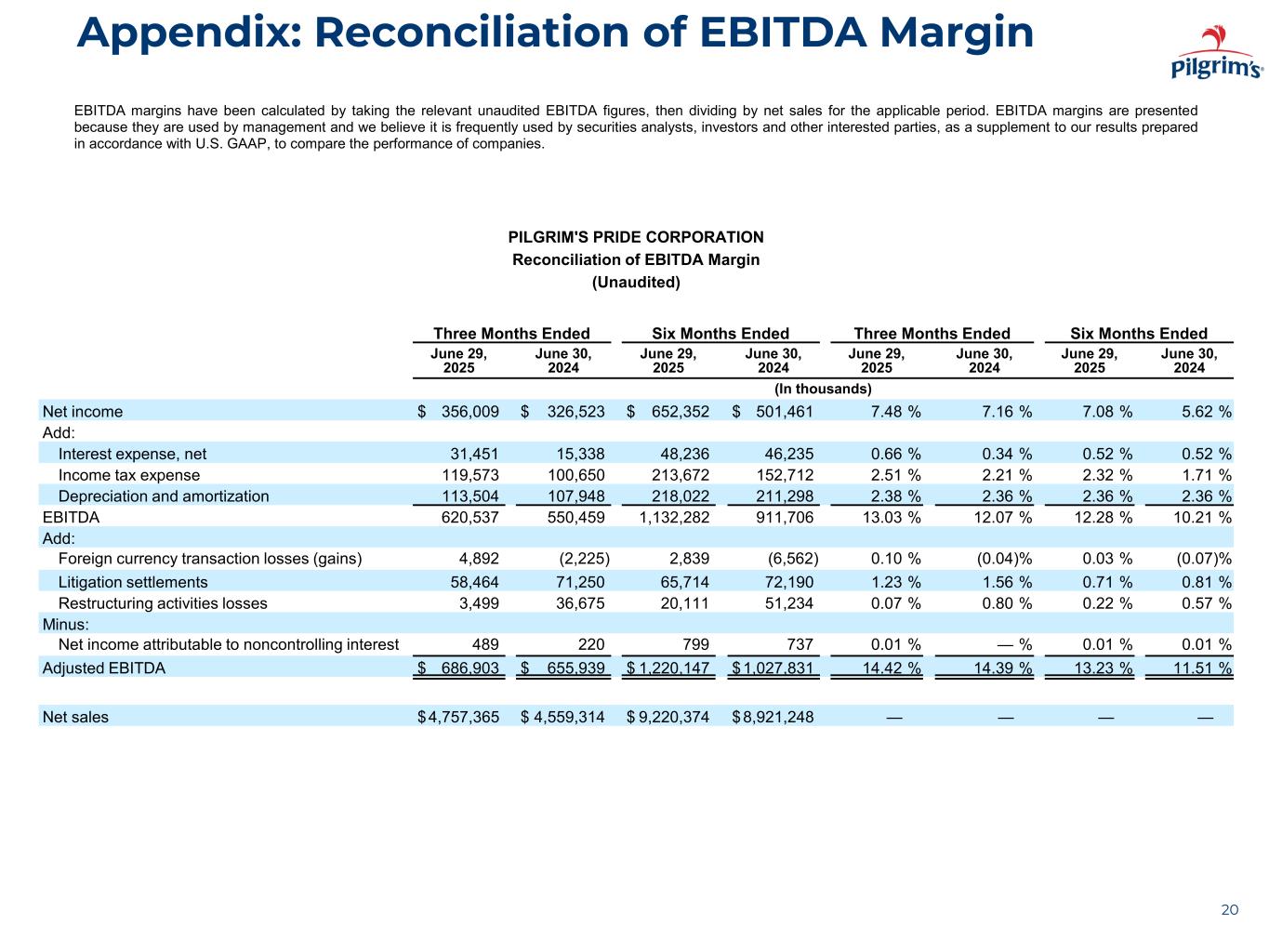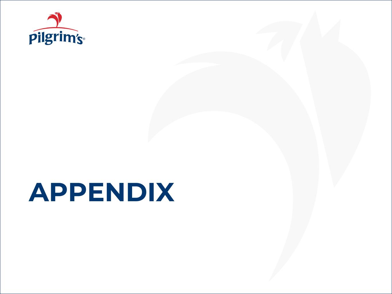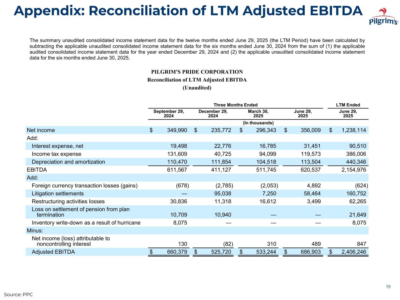 Appendix: Reconciliation of LTM Adjusted EBITDA 19 The summary unaudited consolidated income statement data for the twelve months ended June 29, 2025 (the LTM Period) have been calculated by subtracting the applicable unaudited consolidated income statement data for the six months ended June 30, 2024 from the sum of (1) the applicable audited consolidated income statement data for the year ended December 29, 2024 and (2) the applicable unaudited consolidated income statement data for the six months ended June 30, 2025. PILGRIM'S PRIDE CORPORATION Reconciliation of LTM Adjusted EBITDA (Unaudited) Three Months Ended LTM Ended September 29, 2024 December 29, 2024 March 30, 2025 June 29, 2025 June 29, 2025 (In thousands) Net income $ 349,990 $ 235,772 $ 296,343 $ 356,009 $ 1,238,114 Add: Interest expense, net 19,498 22,776 16,785 31,451 90,510 Income tax expense 131,609 40,725 94,099 119,573 386,006 Depreciation and amortization 110,470 111,854 104,518 113,504 440,346 EBITDA 611,567 411,127 511,745 620,537 2,154,976 Add: Foreign currency transaction losses (gains) (678) (2,785) (2,053) 4,892 (624) Litigation settlements — 95,038 7,250 58,464 160,752 Restructuring activities losses 30,836 11,318 16,612 3,499 62,265 Loss on settlement of pension from plan termination 10,709 10,940 — — 21,649 Inventory write-down as a result of hurricane 8,075 — — — 8,075 Minus: Net income (loss) attributable to noncontrolling interest 130 (82) 310 489 847 Adjusted EBITDA $ 660,379 $ 525,720 $ 533,244 $ 686,903 $ 2,406,246 Source: PPC
