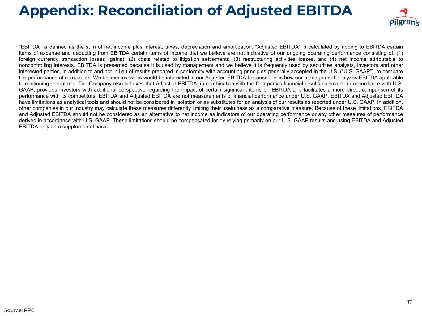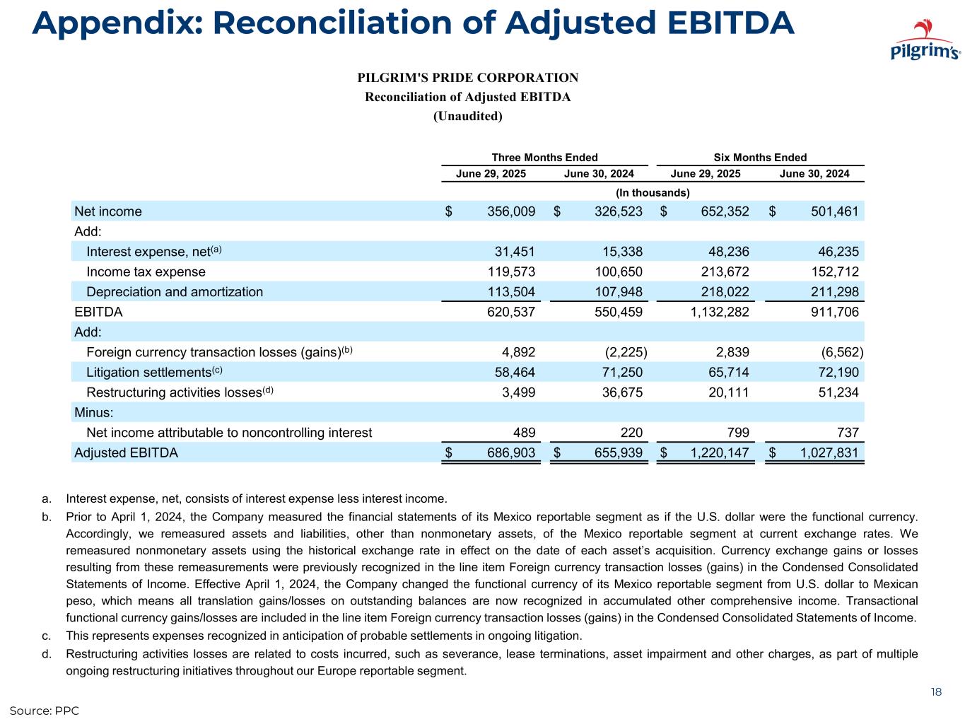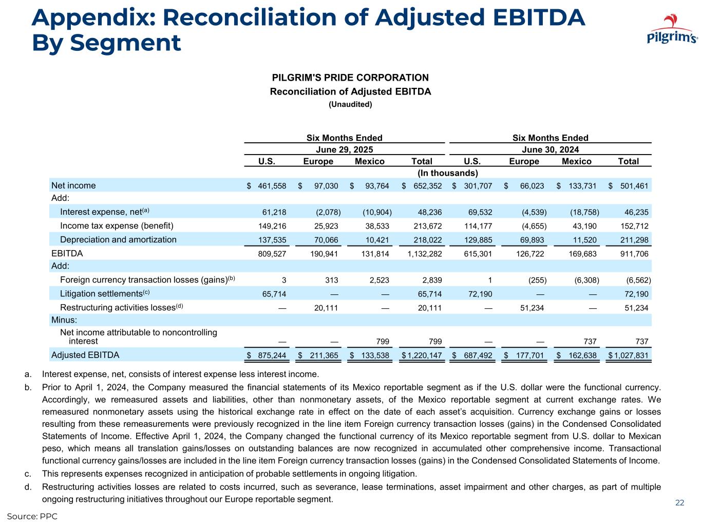 Appendix: Reconciliation of Adjusted EBITDA by Segment 21 PILGRIM'S PRIDE CORPORATION Reconciliation of Adjusted EBITDA (Unaudited) Three Months Ended Three Months Ended June 29, 2025 June 30, 2024 U.S. Europe Mexico Total U.S. Europe Mexico Total (In thousands) Net income $ 239,262 $ 54,880 $ 61,867 $ 356,009 $ 199,076 $ 41,511 $ 85,936 $ 326,523 Add: Interest expense, net(a) 35,651 (174) (4,026) 31,451 24,946 (2,556) (7,052) 15,338 Income tax expense 78,204 16,001 25,368 119,573 82,117 (14,212) 32,745 100,650 Depreciation and amortization 71,149 36,929 5,426 113,504 67,200 34,865 5,883 107,948 EBITDA 424,266 107,636 88,635 620,537 373,339 59,608 117,512 550,459 Add: Foreign currency transaction losses (gains)(b) 4 685 4,203 4,892 (1) (39) (2,185) (2,225) Litigation settlements(c) 58,464 — — 58,464 71,250 — — 71,250 Restructuring activities losses(d) — 3,499 — 3,499 — 36,675 — 36,675 Minus: Net income attributable to noncontrolling interest — — 489 489 — — 220 220 Adjusted EBITDA $ 482,734 $ 111,820 $ 92,349 $ 686,903 $ 444,588 $ 96,244 $ 115,107 $ 655,939 Adjusted EBITDA by segment figures are presented because they are used by management and we believe they are frequently used by securities analysts, investors and other interested parties, as a supplement to our results prepared in accordance with U.S. GAAP, to compare the performance of companies. Source: PPC
