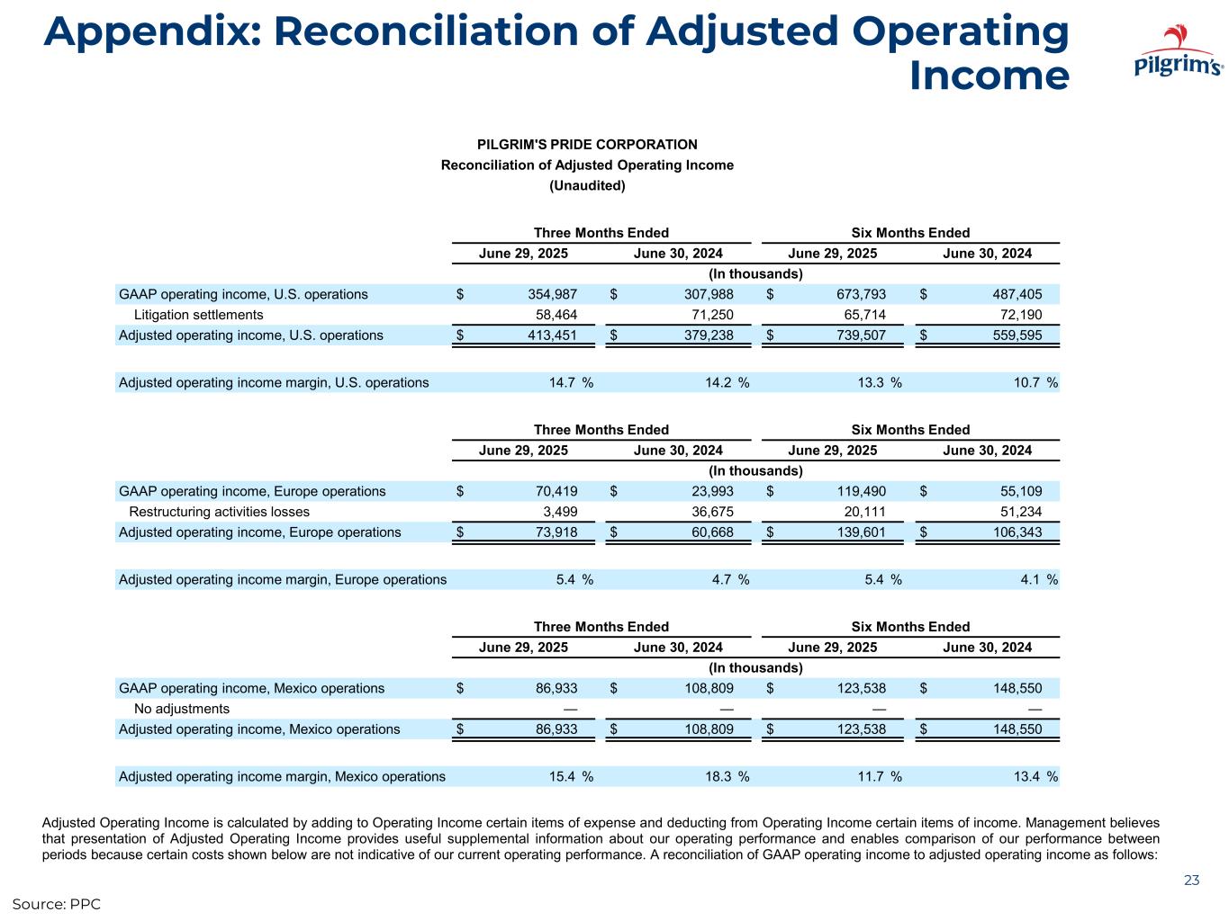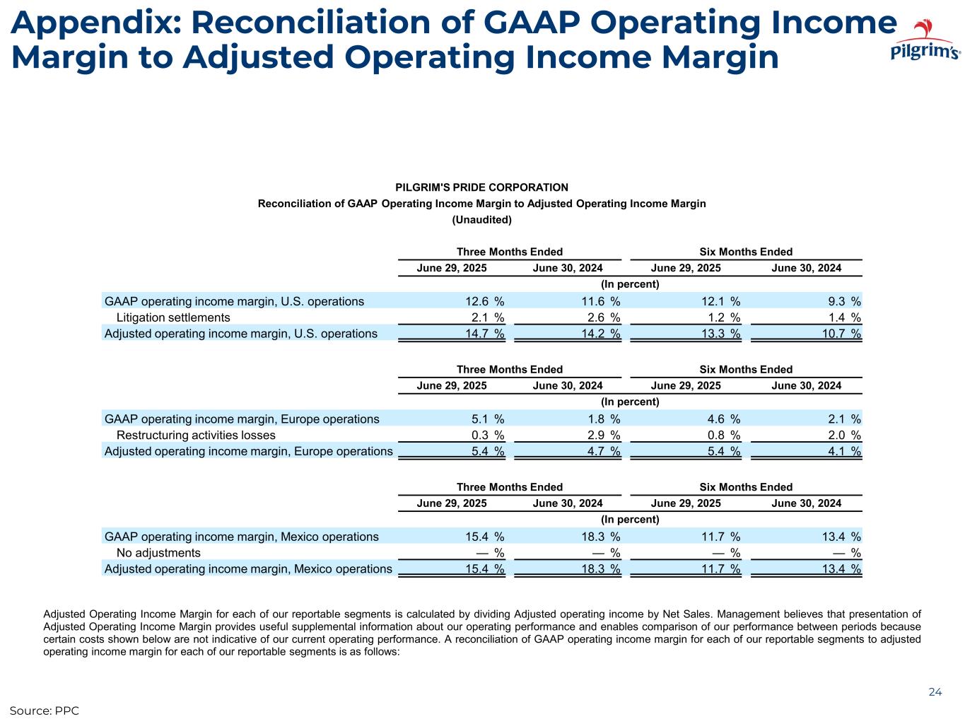 Appendix: Reconciliation of Adjusted Operating Income 23 Adjusted Operating Income is calculated by adding to Operating Income certain items of expense and deducting from Operating Income certain items of income. Management believes that presentation of Adjusted Operating Income provides useful supplemental information about our operating performance and enables comparison of our performance between periods because certain costs shown below are not indicative of our current operating performance. A reconciliation of GAAP operating income to adjusted operating income as follows: PILGRIM'S PRIDE CORPORATION Reconciliation of Adjusted Operating Income (Unaudited) Three Months Ended Six Months Ended June 29, 2025 June 30, 2024 June 29, 2025 June 30, 2024 (In thousands) GAAP operating income, U.S. operations $ 354,987 $ 307,988 $ 673,793 $ 487,405 Litigation settlements 58,464 71,250 65,714 72,190 Adjusted operating income, U.S. operations $ 413,451 $ 379,238 $ 739,507 $ 559,595 Adjusted operating income margin, U.S. operations 14.7 % 14.2 % 13.3 % 10.7 % Three Months Ended Six Months Ended June 29, 2025 June 30, 2024 June 29, 2025 June 30, 2024 (In thousands) GAAP operating income, Europe operations $ 70,419 $ 23,993 $ 119,490 $ 55,109 Restructuring activities losses 3,499 36,675 20,111 51,234 Adjusted operating income, Europe operations $ 73,918 $ 60,668 $ 139,601 $ 106,343 Adjusted operating income margin, Europe operations 5.4 % 4.7 % 5.4 % 4.1 % Three Months Ended Six Months Ended June 29, 2025 June 30, 2024 June 29, 2025 June 30, 2024 (In thousands) GAAP operating income, Mexico operations $ 86,933 $ 108,809 $ 123,538 $ 148,550 No adjustments — — — — Adjusted operating income, Mexico operations $ 86,933 $ 108,809 $ 123,538 $ 148,550 Adjusted operating income margin, Mexico operations 15.4 % 18.3 % 11.7 % 13.4 % Source: PPC