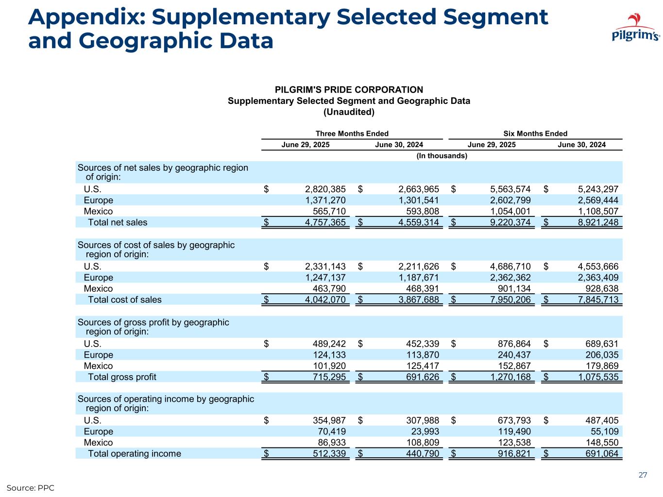Appendix: Supplementary Selected Segment and Geographic Data 27 PILGRIM'S PRIDE CORPORATION Supplementary Selected Segment and Geographic Data (Unaudited) Three Months Ended Six Months Ended June 29, 2025 June 30, 2024 June 29, 2025 June 30, 2024 (In thousands) Sources of net sales by geographic region of origin: U.S. $ 2,820,385 $ 2,663,965 $ 5,563,574 $ 5,243,297 Europe 1,371,270 1,301,541 2,602,799 2,569,444 Mexico 565,710 593,808 1,054,001 1,108,507 Total net sales $ 4,757,365 $ 4,559,314 $ 9,220,374 $ 8,921,248 Sources of cost of sales by geographic region of origin: U.S. $ 2,331,143 $ 2,211,626 $ 4,686,710 $ 4,553,666 Europe 1,247,137 1,187,671 2,362,362 2,363,409 Mexico 463,790 468,391 901,134 928,638 Total cost of sales $ 4,042,070 $ 3,867,688 $ 7,950,206 $ 7,845,713 Sources of gross profit by geographic region of origin: U.S. $ 489,242 $ 452,339 $ 876,864 $ 689,631 Europe 124,133 113,870 240,437 206,035 Mexico 101,920 125,417 152,867 179,869 Total gross profit $ 715,295 $ 691,626 $ 1,270,168 $ 1,075,535 Sources of operating income by geographic region of origin: U.S. $ 354,987 $ 307,988 $ 673,793 $ 487,405 Europe 70,419 23,993 119,490 55,109 Mexico 86,933 108,809 123,538 148,550 Total operating income $ 512,339 $ 440,790 $ 916,821 $ 691,064 Source: PPC