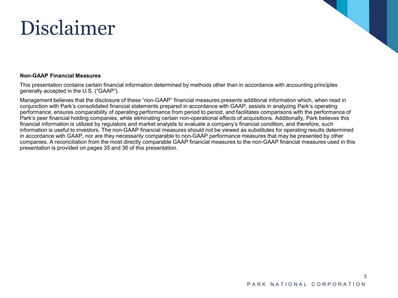 Safe Harbor Statement P A R K N A T I O N A L C O R P O R A T I O N 2 This presentation contains forward-looking statements that are provided to assist in the understanding of anticipated future financial performance. Forward-looking statements provide current expectations or forecasts of future events and are not guarantees of future performance. The forward- looking statements are based on management’s expectations and are subject to a number of risks and uncertainties, including those described in Park's Annual Report on Form 10-K for the fiscal year ended December 31, 2023, as updated by our filings with the SEC. Although management believes that the expectations reflected in such forward-looking statements are reasonable, actual results may differ materially from those expressed or implied in such statements. Risks and uncertainties that could cause actual results to differ materially include, without limitation: (1) Park's ability to execute our business plan successfully and within the expected timeframe; (2) adverse changes in future economic and financial market conditions; (3) adverse changes in real estate values and liquidity in our primary market areas; (4) the financial health of our commercial borrowers; (5) adverse changes in federal, state and local governmental law and policy, including the regulatory landscape, capital markets, elevated government debt, potential changes in tax legislation, government shutdown, infrastructure spending and social programs; (6) changes in consumer spending, borrowing and saving habits; (7) our litigation and regulatory compliance exposure; (8) increased credit risk and higher credit losses resulting from loan concentrations; (9) competitive pressures among financial services organizations; (10) changes in accounting policies and practices as may be adopted by regulatory agencies; (11) Park's assumptions and estimates used in applying critical accounting policies and modeling which may prove unreliable, inaccurate or not predictive of actual results; (12) Park's ability to anticipate and respond to technological changes and Park's reliance on, and the potential failure of, a number of third-party vendors to perform as expected; (13) failures in or breaches of Park's operational or security systems or infrastructure, or those of our third-party vendors and other service providers; (14) negative impacts on financial markets and the economy of any changes in the credit ratings of the U.S. Treasury obligations and other U.S. government-backed debt, as well as issues surrounding the levels of U.S., European and Asian government debt and concerns regarding the growth rates and financial stability of certain sovereign governments, supranationals and financial institutions in Europe and Asia; (15) effects of a fall in stock market prices on Park's asset and wealth management businesses; (16) continued availability of earnings and excess capital sufficient for the lawful and prudent declaration of dividends; (17) the impact on Park's business, personnel, facilities or systems of losses related to acts of fraud, scams and schemes of third parties; (18) the impact of widespread natural and other disasters, pandemics, dislocations, regional or national protests and civil unrest (including any resulting branch closures or damages), military or terrorist activities or international hostilities on the economy and financial markets generally and on us or our counterparties specifically; (19) the potential further deterioration of the U.S. economy due to financial, political, or other shocks; (20) the effect of healthcare laws in the U.S. and potential changes for such laws that may increase our healthcare and other costs and negatively impact our operations and financial results; (21) the impact of larger or similar-sized financial institutions encountering problems that may adversely affect the banking industry; and (22) other risk factors relating to the financial services industry.