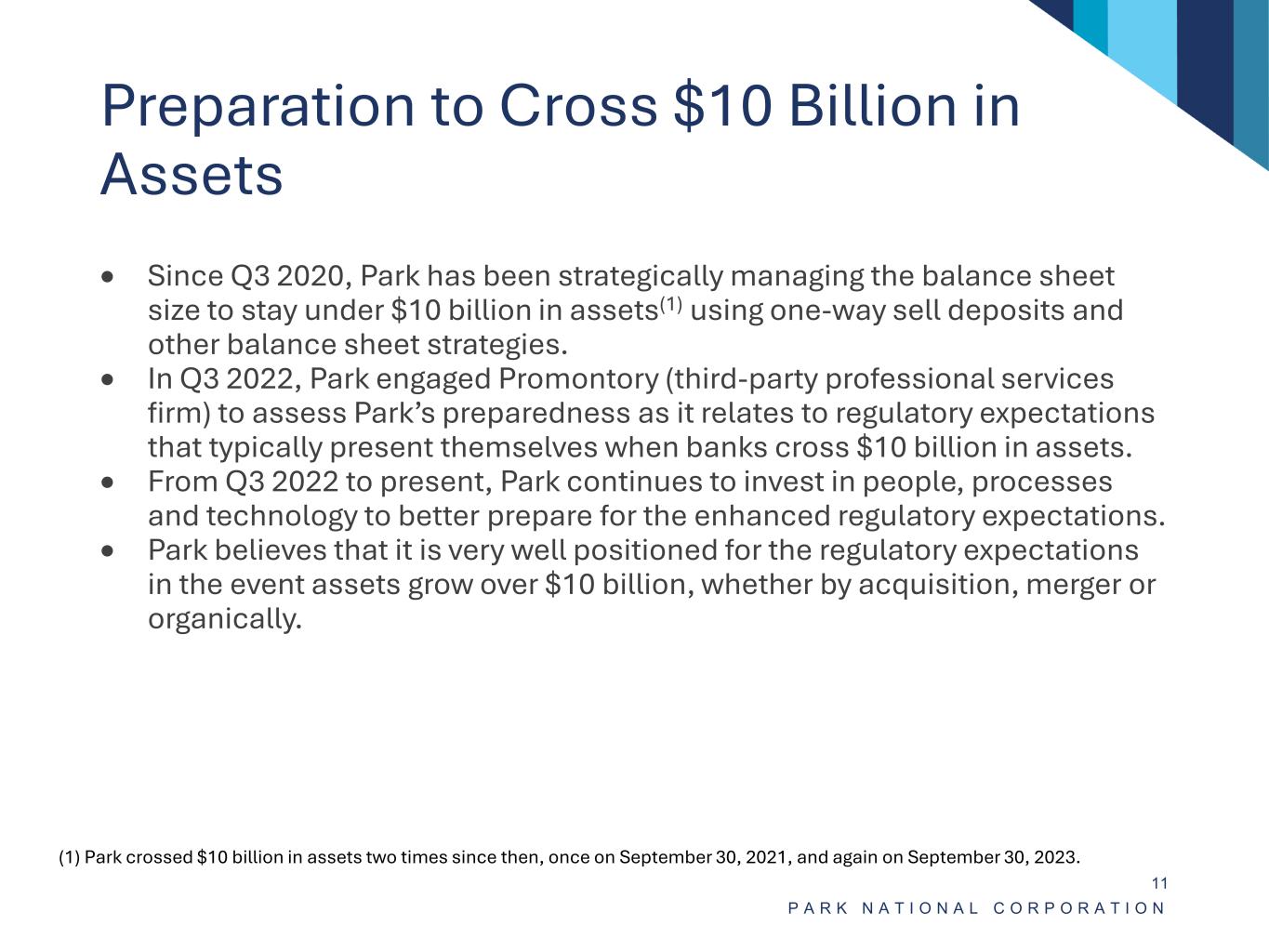 • Strong history of operating in Park’s regional bank model. • Moved to one brand, Park National Bank, in 2019 while maintaining local market leadership and advisory boards. • To better align its branch network with banking trends, Park National Bank consolidated 23 branch offices (approximately 20% of then existing) in 2020. • Proximity to other branches and few competitors in impacted markets reduced the risk of attrition. • Below average transaction volume at impacted branches. • On October 23, 2023, Park announced the consolidation of 12 branch offices, 3 relocations and 2 new market locations, all of which are in Ohio. • Park continues to analyze its remaining branch network (geography, demographics, transaction volume, etc.) to identify sensible branch optimization opportunities. • Separate presidents and advisory boards, consisting of leaders with deep local market knowledge. • Regional leadership team averages approximately 28 years of banking experience and 18 years of leadership tenure with Park. P A R K N A T I O N A L C O R P O R A T I O N 10 Community Banking Regions Name Position Age Years with PNB Years in Industry John A. Brown President - Western Ohio Region 55 33 33 Bryant W. Fox Market President - Cincinnati 36 11 11 Chris R. Hiner President - Northern Ohio Region & Director of Home Lending 41 18 18 W. Andrew Holden Market President - Louisville 49 6 28 Tim J. Ignasher Market President - Charlotte 63 7 33 John D. Kimberly President - Carolina Region 59 17 38 Patrick L. Nash President - Eastern Ohio Region 59 37 37 Laura F. Tussing President - Central Ohio Region 43 19 19 Brady E. Waltz Market President - Columbus 52 17 31