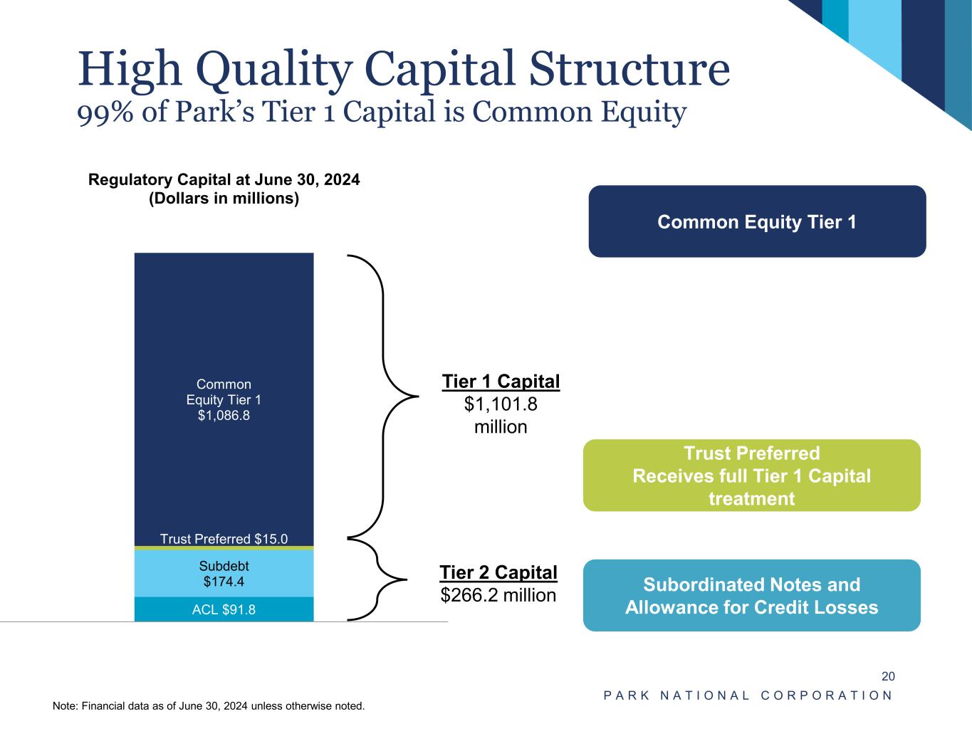 Disciplined Approach to Managing Operating Expenses P A R K N A T I O N A L C O R P O R A T I O N 19 Efficiency Ratio & Non-interest Expense Non-interest Expense Composition (YTD) Note: Financial data as of June 30, 2024 unless otherwise noted. (Dollars in millions) • Significant investment in people, processes, and technology over the last two years. • Well positioned for growth. $286.6 $283.5 $298.0 $309.2 $152.4 62.8% 61.3% 61.2% 65.9% 61.1% 2020 2021 2022 2023 2024Q2 Non-interest Expense Efficiency Ratio Salaries & Benefits 61% Occupancy 4% FF&E 3% Data Processing 12% Professional Fees 9% Insurance 2% Other Non- interest Expense 9%