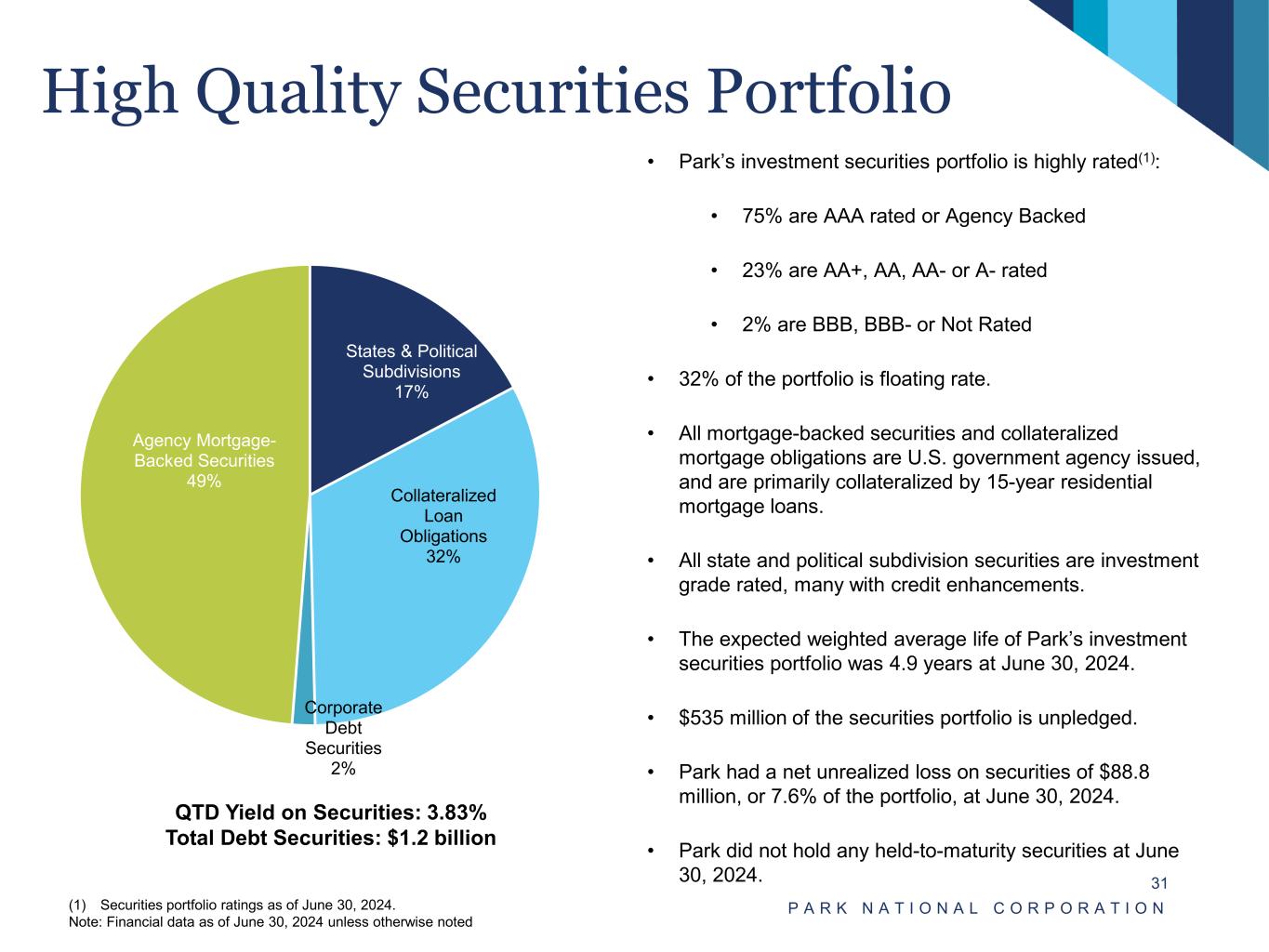 Stable, Low-Cost Core Deposits P A R K N A T I O N A L C O R P O R A T I O N 30 • With minimal reliance on costly time deposits and a relatively high level of non-interest bearing deposits, Park has cultivated a loyal and low-cost source of funds. • Non-interest bearing deposits represented 31% of total deposits. • Public funds made up $1.7 billion, or approximately 20%, of total deposits. • Uninsured deposits totaled approximately $1.4 billion, or 16.9% of total deposits. This $1.4 billion included $455 million of deposits which were over $250,000, but were fully collateralized by Park’s investment securities portfolio. Total Deposits: $8.3 billion QTD Cost of Interest Bearing Deposits: 1.99% QTD Cost of Total Deposits: 1.37% Non-CD/Brokered Deposits over Total Deposits: 90% Note: Financial data as of June 30, 2024 unless otherwise noted. Non-interest Bearing 31% Transaction 26% Savings 33% Brokered Deposits 2% CDs 8%