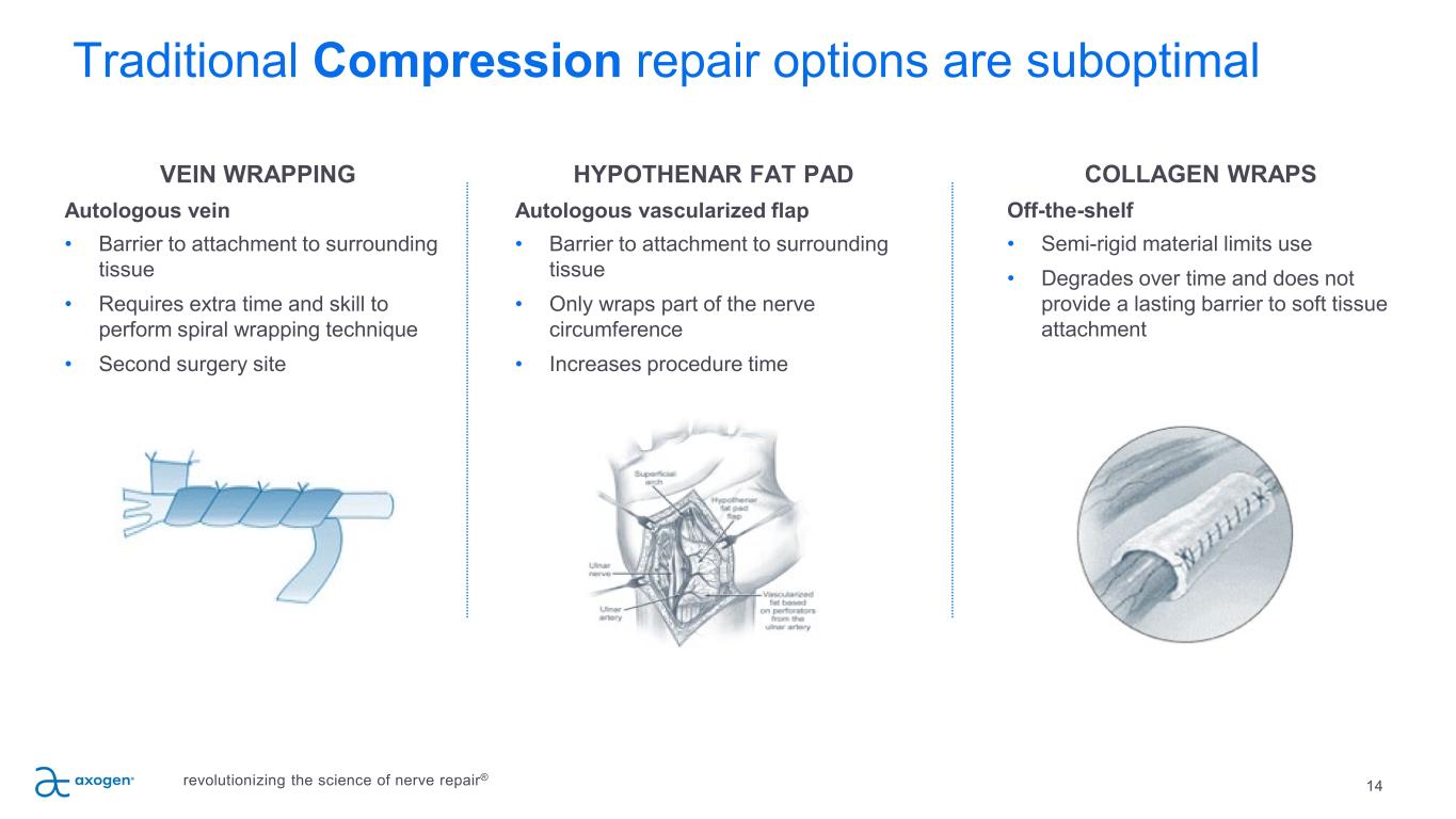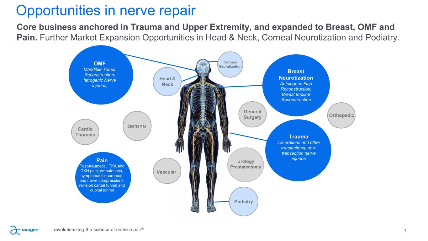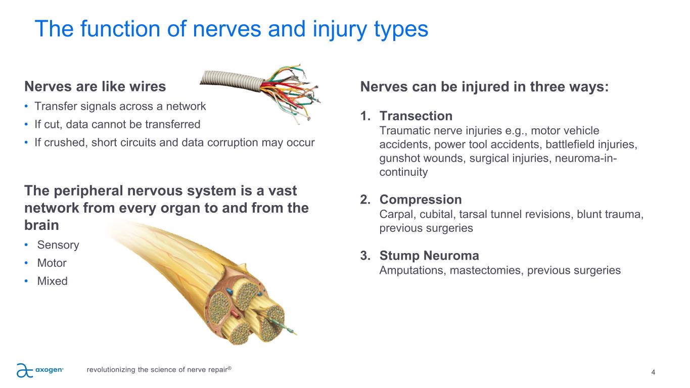 アクソジェン(AXGN)は、末梢神経再生・修復技術の科学、開発、商業化に特化したリーディングカンパニーです。アクソジェンの社員は、外科医や医療従事者に革新的で臨床的に実証された、経済的に効果的な修復ソリューションを提供することで、末梢神経に物理的損傷や切断を受けた患者の末梢神経機能と生活の質の回復を支援することに情熱を注いでいます。末梢神経は、全身に運動信号と感覚信号の通路を提供しています。毎日、人々は外傷を受けたり、末梢神経の機能に影響を与える外科手術を受けたりしています。末梢神経への物理的損傷、あるいは末梢神経を適切に再接続することができない場合、筋肉や臓器の機能喪失、感覚喪失、あるいは痛みの発生につながる可能性があります。