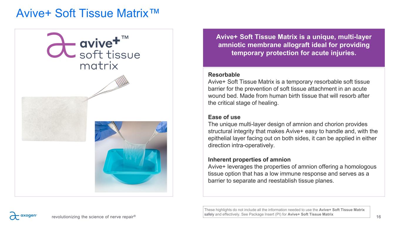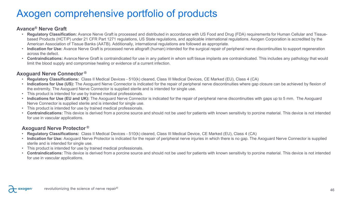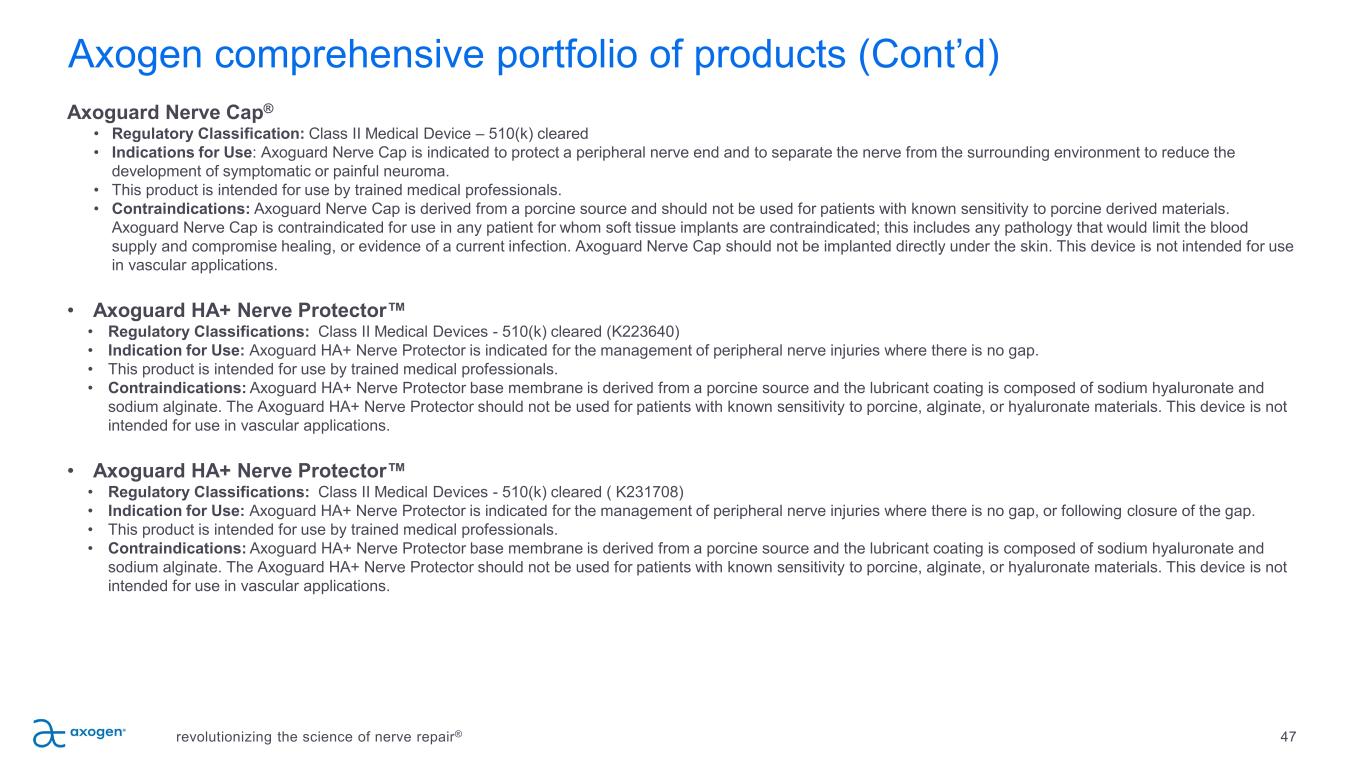 Axogenの製品ポートフォリオには、切断された末梢神経を二次手術部位に伴う合併症を伴わずに橋渡しするための、生物学的に活性な既製加工ヒト神経移植片であるAvance® Nerve Graftが含まれる;Axoguard Nerve Connector®は、切断された末梢神経を無緊張で修復するためのブタ粘膜下層ECMコアプテーション補助材である。Axoguard Nerve Protector®は、損傷した末梢神経を包んで保護し、軟組織の癒着を防ぎながら神経の再建を補強するために使用されるブタ粘膜下層ECM製品である;Axoguard HA+ Nerve Protector™ は、独自のヒアルロン酸アルギン酸ゲルでコーティングされたブタ粘膜下層ECMベースレイヤーで、末梢神経損傷を短期的・長期的に保護するために設計された次世代技術である;Avive+ Soft Tissue Matrix™は、組織修復の重要な段階において、手術床の組織を保護し分離するために使用される多層羊膜移植片であり、Axoguard Nerve Cap®は、末梢神経末端を保護し、神経を周囲の環境から分離して症候性神経腫や有痛性神経腫の発生を抑えるために使用されるブタ粘膜下ECM製品である。アクソジェン社の製品群は、米国、カナダ、ドイツ、英国、スペイン、韓国、その他数カ国で販売されている。